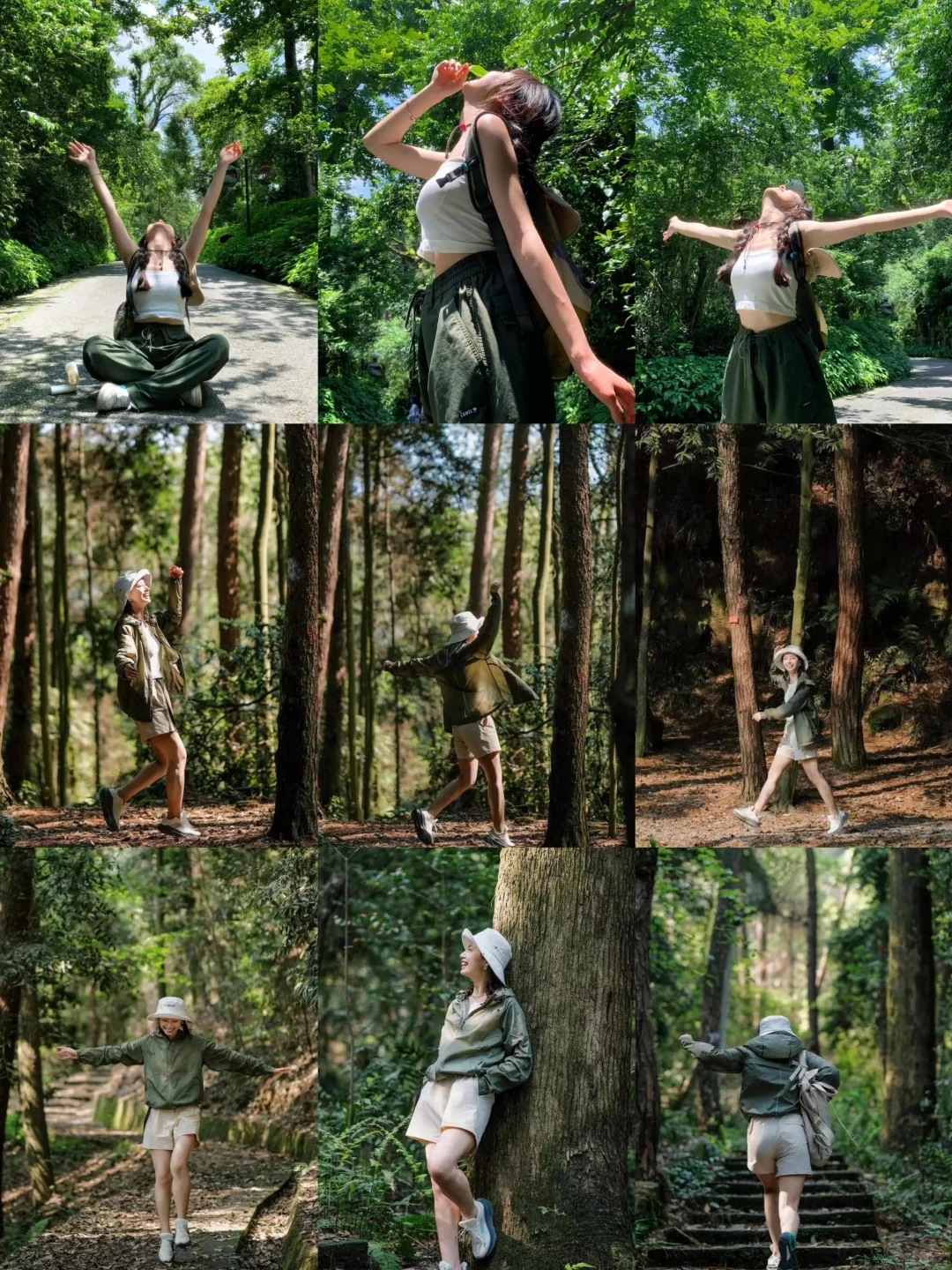 秋天🍂天气正好,出门爬山是户外活动的好时节。一起聊聊爬山拍照的姿势怎么摆好看,给大家整理了一些比较好用的拍照姿势,简单拍出来特别有活力的照片。\n \n1️⃣固定机位,让模特自由发挥,可以在树林间轻轻舞动着。\n2️⃣ “人小景大”,提前选择好拍摄场地,让模特走进环境里,或者是站在某处进行摆拍。\n3️⃣ 山间蜿蜒的小道,很适合拍照了,模特可以张开双臂低着头,一步一步地向镜头走去,抓拍走动的动作。\n4️⃣ 爬山的背景照也可以拍一张,可以让模特的动作大一点,手臂挥动起来\n5️⃣ 遇到粗壮的大树,可以直接靠上去,双手插兜,一只脚抬起,眼睛看向远处。\n6️⃣ 仰头张开双臂,仿佛在感受大自然的魅力,从斜侧方进行拍摄\n7️⃣ 拍摄角度再低一点,从下往上仰拍,更加能突出人像的下颚线条。\n8️⃣ 走累了,可以直接双腿盘坐在地上,双手向上举起,仰头看向天空。\n \n#我是户外女孩 #爬山穿搭 #一起去户外 #拍照技巧 #拍照姿势 #出游拍照 #爬山拍照 #女生拍照姿势 #户外露营 #来拍照了