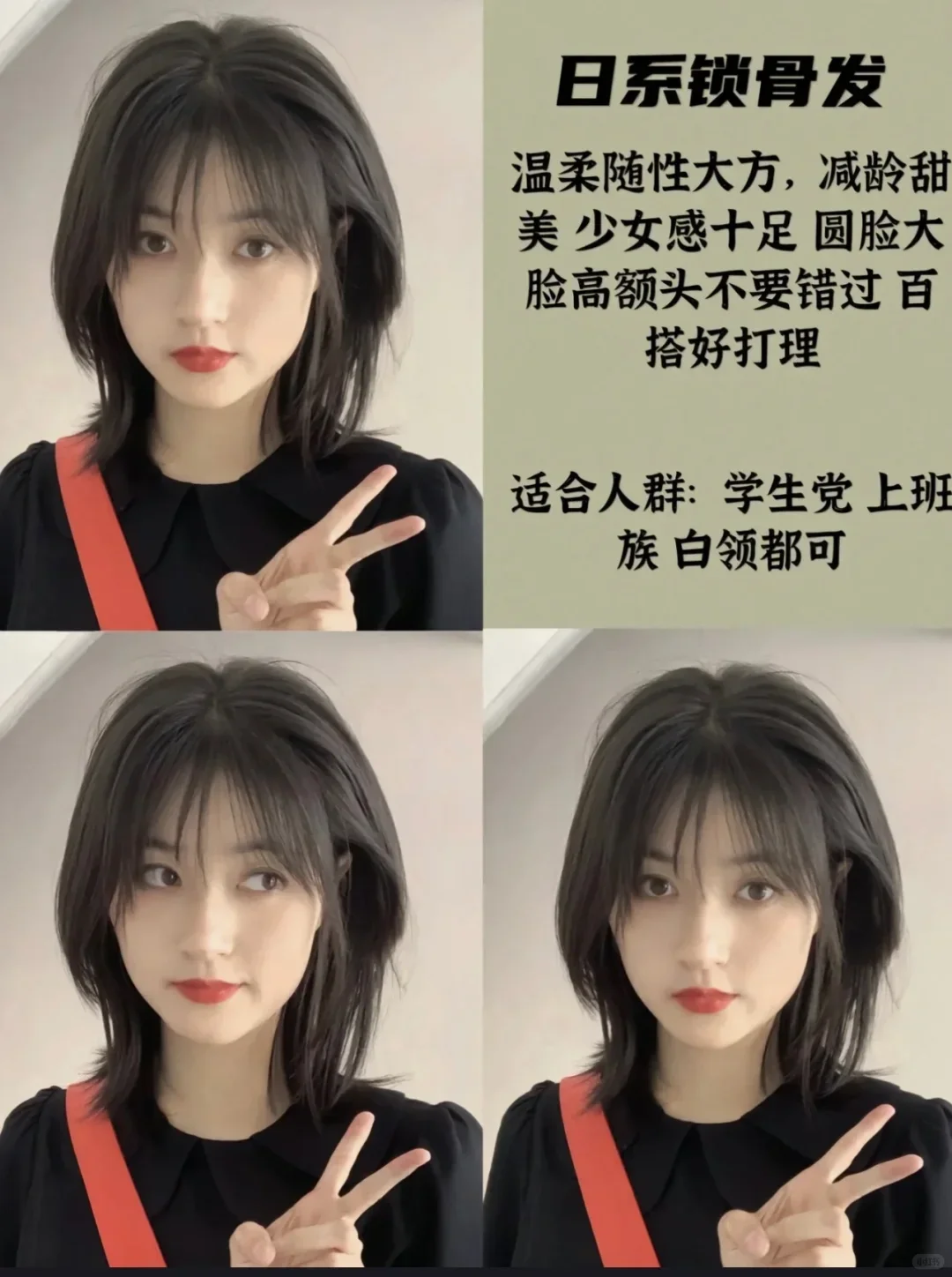 超级适合学生党的四款发型|✨齐肩短发可扎可散的齐肩短发,天气热想剪短发的可以冲冲这款热的时候也能扎起来。适合人群:学生党 上班族 白领都可以\n✨日系锁骨发温柔随性大方,减龄甜美少女感十足圆脸大脸高额头不要错过 百搭好打理。层次感锁骨发剪了之后非常显气质,这个长度的头发剪不好会显得很尴尬,所以层次感的锁骨发就成了很好的选择。 也不条脸型搭配刘海食用非常显瘦。 蓬松感的中分或者八字刘海显气质,适合职场女生跟走轻熟路线的女生,妥妥的女神范\n✨鲻鱼头:这款狼尾鲻鱼头很适合喜欢酷感少年感发型的小姐姐,比普通的短发看起来高级,又很随意,圆脸女生也可以 很好的驾驭 颧骨高的女生,两边的长刘海可以弱化脸部线条,修 饰脸型,头顶服贴,后脑勺平的女生,头发的层次剪完 可以让后脑勺变得蓬松,让头型更饱满\n不挑脸型的日系鲻鱼头,帅气个性柔中带酷非常有少年感特别适合学生党适合:圆脸,小方脸,鹅蛋脸,菱形脸。\n✨初恋锁骨发甜美气质温柔锁骨发,美到犯规 谁剪谁好看简约高级 显脸小初恋刘海修饰发际线宽额头,脸型显小 发型简约高级,整体给人感觉甜美温柔适合人群:学生党上班族白领都可以\n剪短发一定根据风格、发量、发质、脸型、头肩比、来综合设计决定的!讲适用性、功能性、还原度;一款适合又好看的短发,是能够增加自身气场,改变个人气质的!\n#青春活力发型 #青春流行风格 #初恋头 #修饰脸型发型 #女生减龄发型 #发型新风尚 #中短发发型推荐 #圆脸发型推荐 #春夏发型推荐 #蓬松短发