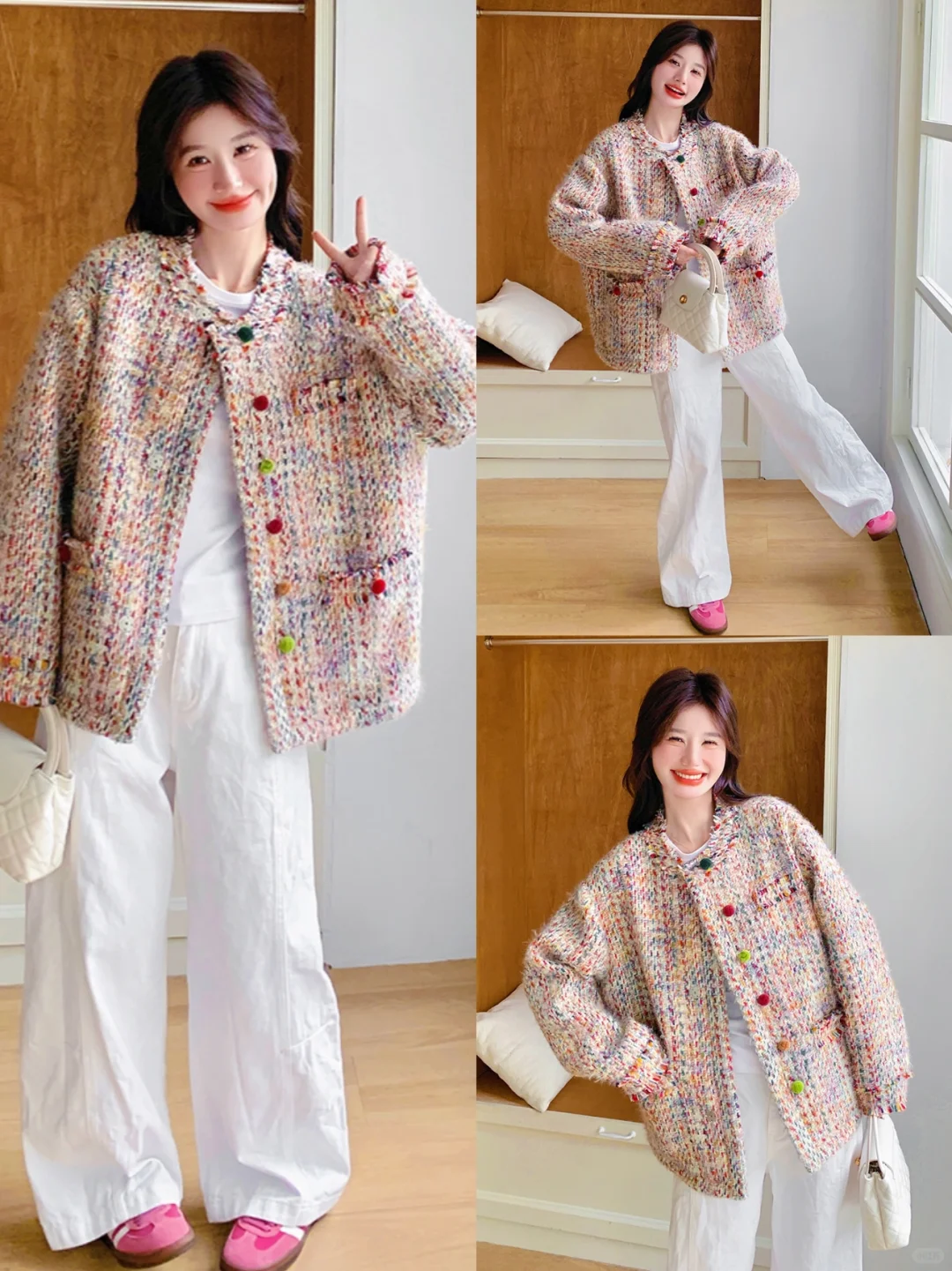 🍊小橙子穿搭分享 | 八天售后无忧 | 超好看别致独特高级感多巴胺彩色编织小香风外套