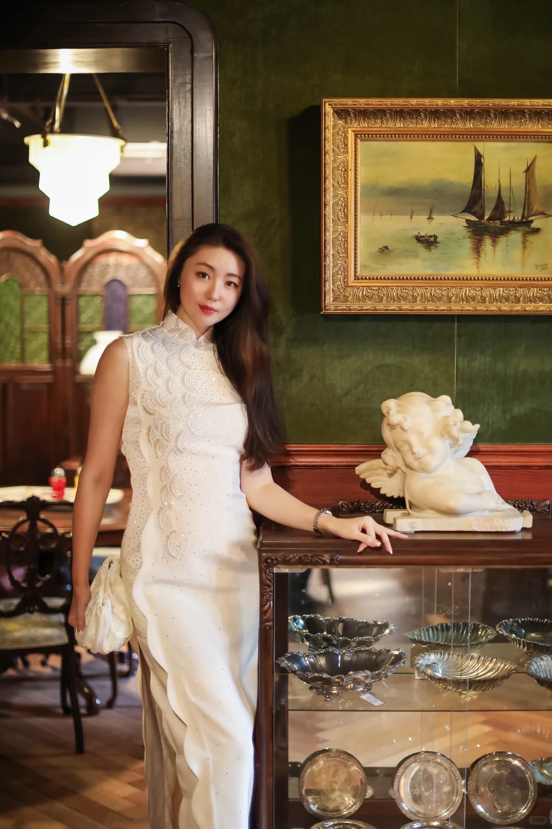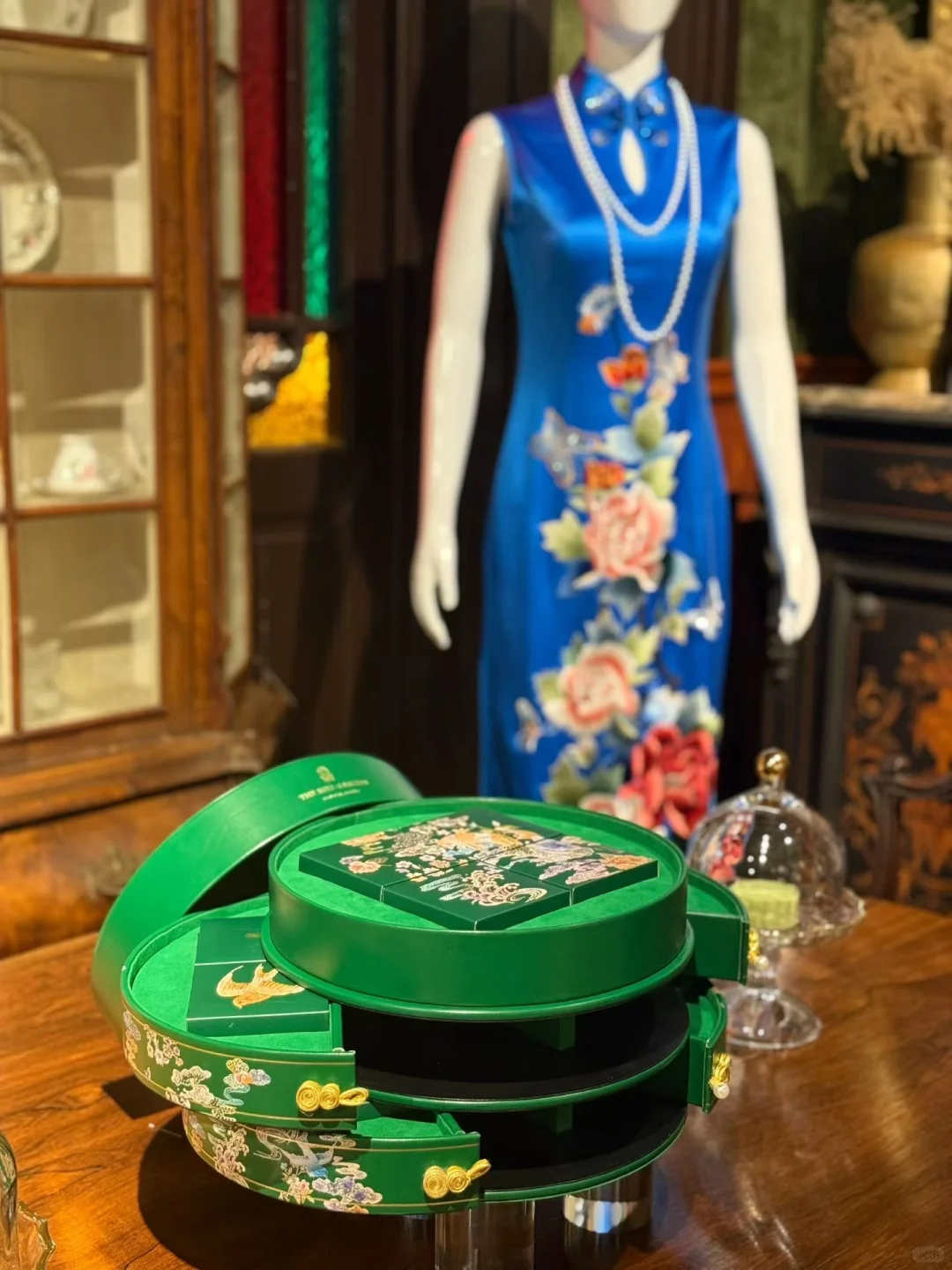 20几岁时,对旗袍似乎没太大感觉💃🏻可看了电影“2046”,加上年纪上去了之后,对于旗袍慢慢产生了好感,觉得衣柜里总要有几条好看的旗袍才可以😊\n \n旗袍属于很正式的中式礼服🇨🇳一般会在主题活动或外交宴会上出现。体现东方女性婀娜多姿的身型和优雅气质🌹\n \n在中秋到来之际🎑参加了浦东丽思卡尔顿酒店和高端旗袍品牌“蔓楼蘭”的联名下午茶活动☕️\n \n活动设在乍浦锦里的楼上,充满老上海风格的古董家具、摆件很有年代感✨瞬间穿越到了十里洋场的年代🤩\n \n“福禄.映月”中秋礼盒也很应景🥮同价值12万8的绿色高定旗袍相呼应,真的超美💚\n \n这是个注定特别的中秋节🎑穿上白色旗袍🤍来一个海派下午茶🍰切切咖啡,聊聊天☕️米道老灵额🤗\n \n#浪漫生活的记录者 #生活方式 #旗袍 #旗袍东方女性最美的象征 #下午茶 #中秋節 #优雅穿搭 #今日快乐今日发 #海派文化 #年代感