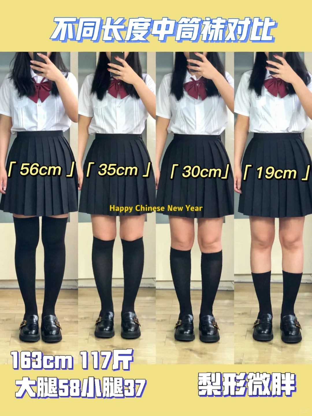 我身高163,体重117斤,百褶裙是42cm的,测评都全部中筒袜都来自黄小姐家哦,压力袜有一定的视觉显瘦效果,不掉筒哦~穿上就会感觉肉肉被包裹住了 能改善小腿外翻的情况 对粗腿姐妹很友好!选对了长度真的敲修饰腿型
