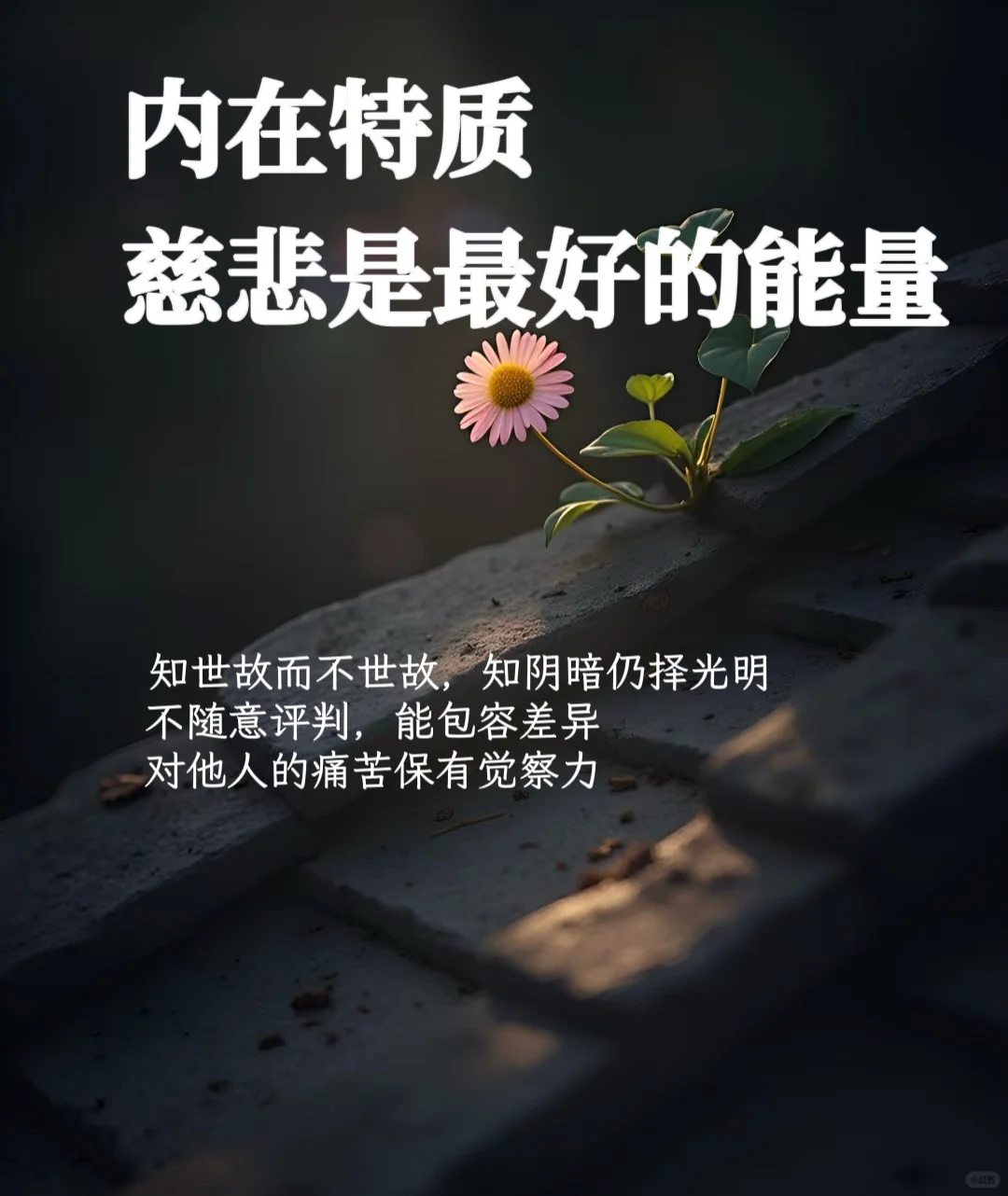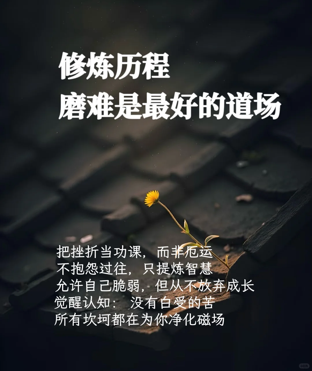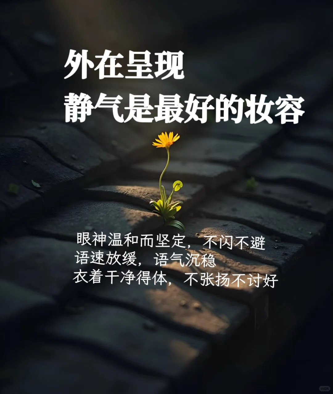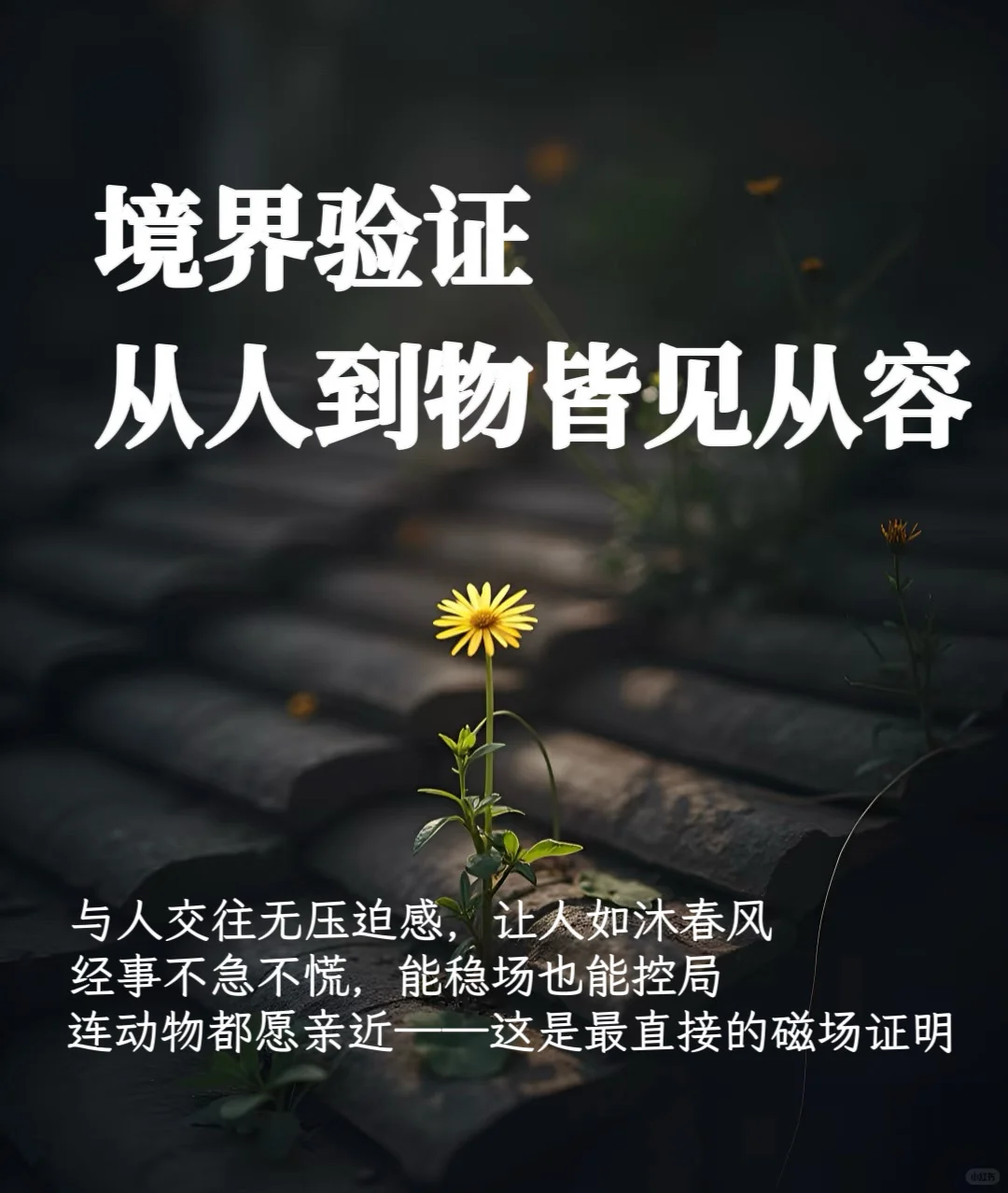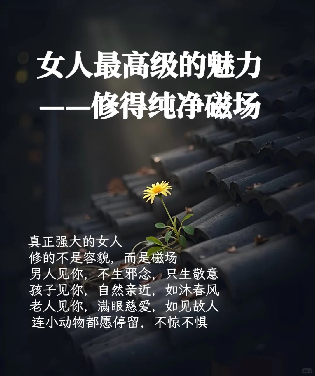 ❤️真正强大的女人\n修的不是容貌,而是磁场\n男人见你,不生邪念,只生敬意\n孩子见你,自然亲近,如沐春风\n老人见你,满眼慈爱,如见故人\n连小动物都愿停留,不惊不惧\n这并非天生\n而是历经万千打磨\n才修来的通透与宁静\n❶ 修炼历程:磨难是最好的道场\n把挫折当功课,而非厄运\n不抱怨过往,只提炼智慧\n允许自己脆弱,但从不放弃成长\n觉醒认知: 没有白受的苦\n所有坎坷都在为你净化磁场\n❷ 外在呈现:静气是最好的妆容\n眼神温和而坚定,不闪不避\n语速放缓,语气沉稳\n衣着干净得体,不张扬不讨好\n修形口诀: 相由心生,场由内养\n你越淡定,世界越温柔\n❸ 内在特质:慈悲是最好的能量\n知世故而不世故,知阴暗仍择光明\n不随意评判,能包容差异\n对他人的痛苦保有觉察力\n磁场法则: 真正的纯净\n是看透人性后依然选择善良\n❹ 日常修习:细节积累福报\n每天静坐10分钟,清理情绪杂音\n接触自然,光脚踩地、触摸树木\n不说负面语言,不传是非闲话\n积福心得: 福报不是求来的 是日常修来的\n❺ 境界验证:从人到物皆见从容\n与人交往无压迫感,让人如沐春风\n经事不急不慌,能稳场也能控局\n连动物都愿亲近——这是最直接的磁场证明\n终极印证: 修没修成,不看自己感觉\n看周围人如何待你\n看万物如何应你\n#高磁场高能量\n#女性成长\n#女性创业\n#形象美学\n#修心养性\n#美学整理收纳师