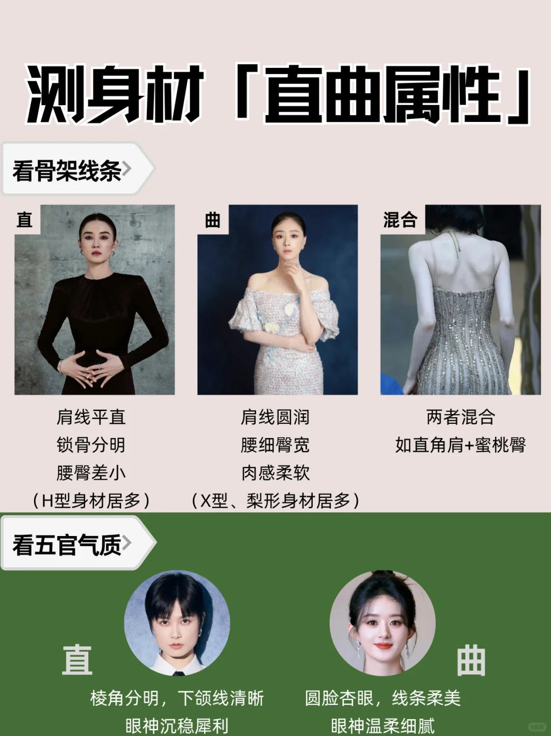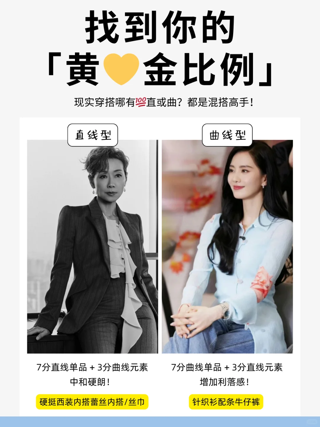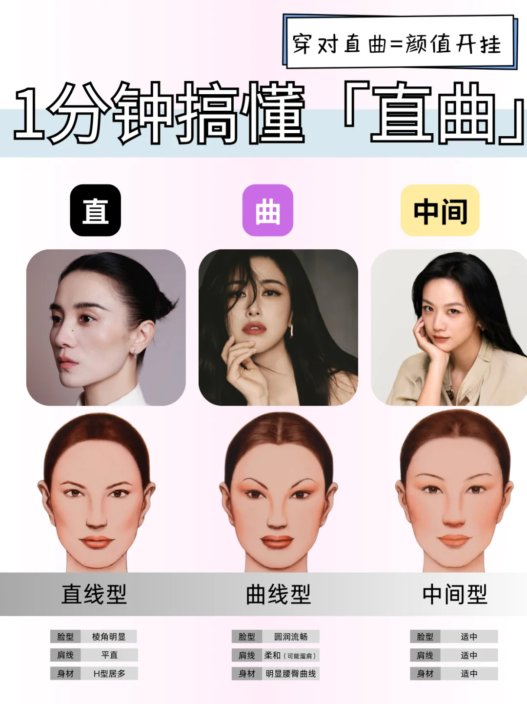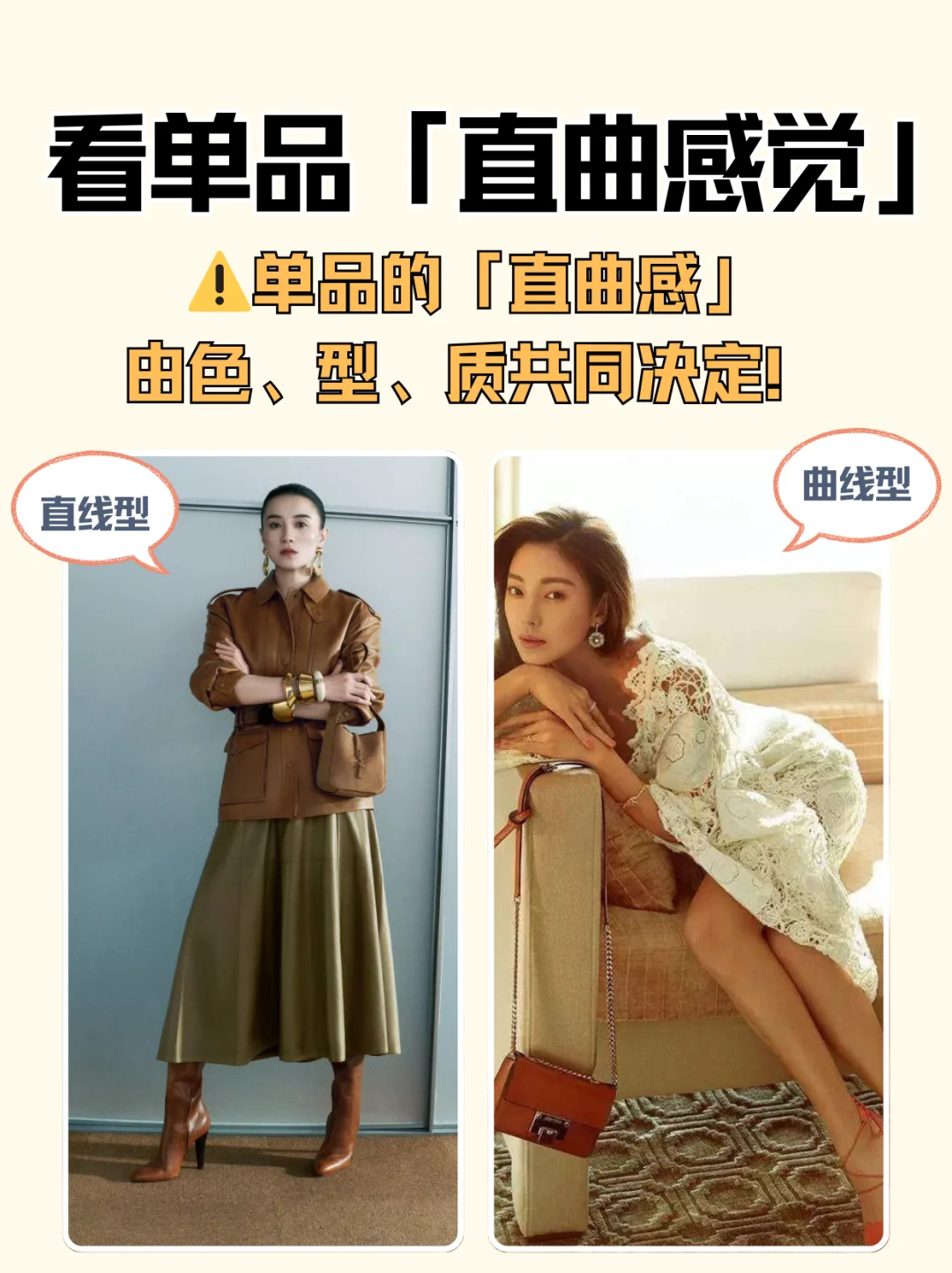 没有完👌美的身材,只有不会穿搭的脑袋🤯!\n1分钟搞懂「直曲」,穿搭对味美出新高度!\n \n🌟step 1:测身材「直曲属性」\n✅看骨架线条:\n• 直线型:肩线平直、锁骨分明、腰臀差小(H型身材居多)\n• 曲线型:肩线圆润、腰细臀宽、肉感柔软(沙漏型、梨形身材居多)\n• 中间型:两者混合,如直角肩+蜜🍑臀\n✅看五官气质:\n• 直:棱角分明,下颌线清晰,眼神沉稳犀利\n• 曲:圆脸杏眼,线条柔美,眼神温柔细腻\n \n👗step 2:看单品「直曲感觉」\n⚠️单品的「直曲感」由色、型、质共同决定!\n🔹直线感: 冷色调🧊 + 利落剪裁✂️ + 硬艇面料🧥 (想想西装、牛仔!)\n🟠曲线感: 暖色调☀️ + 圆润轮廓🍎 + 柔软材质🧵 (比如针织、缎面裙~)\n \n📕step 3:对号入座找到本命穿搭\n👑直线型人:人间直角尺!\n穿搭核❤️:利落、干练、飒爽,突出线条感!\n \n🎨 色彩:\n本命色: 黑白灰、藏蓝、军绿等冷色调\n避雷色: 大面积马卡龙、莫兰迪等低饱和柔色 🙅♀️ 容易显得格格不入!\n✂️ 版型:\n线条硬朗利落!H型外套、直筒裤、尖领衬衫、西装裤,剪裁干净不啰嗦!\n拒绝Oversize(显肿!)、过多褶皱、荷叶边(拖沓!)🙅♀️\n🧵 材质:\n硬艇有筋骨感!牛仔布、精纺西装料、皮革、穿上立刻支棱起来!\n避雷雪纺、雷丝、软塌针织(太贴身软糯,削弱气场!)💣\n \n💕 曲线型人:行走的温柔刀!\n穿搭核❤️:温柔、亲和、女人味,强调柔和感!\n🎨 色彩:\n本命色: 暖调柔色!樱花粉、香芋紫、燕麦色,温柔到骨子里!\n避雷色: 大面积黑白灰等冷硬色调 🙅♀️ 容易显得生硬刻板!\n✂️ 版型:\n带弧度、流畅感!A字裙、裹身裙、圆领上衣、微喇裤,自然勾勒曲线~\n避雷宽大Oversize、线条锋利的H型/X型(太突兀!)💣\n🧵 材质:\n柔软飘逸有垂感!雪纺、真丝、垂感好的莫代尔,仙气飘飘~\n避雷过硬艇括的牛仔、厚皮革(和柔和气质打架!)🙅♀️\n \nBUT! 现实穿搭哪有💯直或曲?都是混搭高手!👏\n例:曲线感软糯针织衫 🧶 + 直线条牛仔裤 👖 = 温柔带点帅!\n \n#形象管理 #个人色彩测试 #穿搭底层逻辑 #服装店 #服装人 #美业人 #纹绣师 #化妆师 #个人形象色彩风格诊断 #穿搭