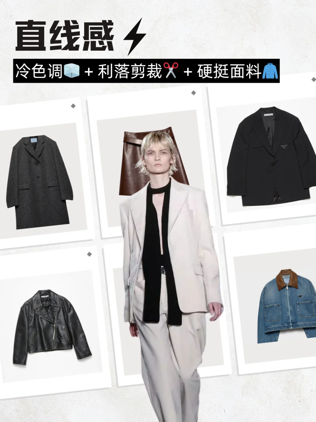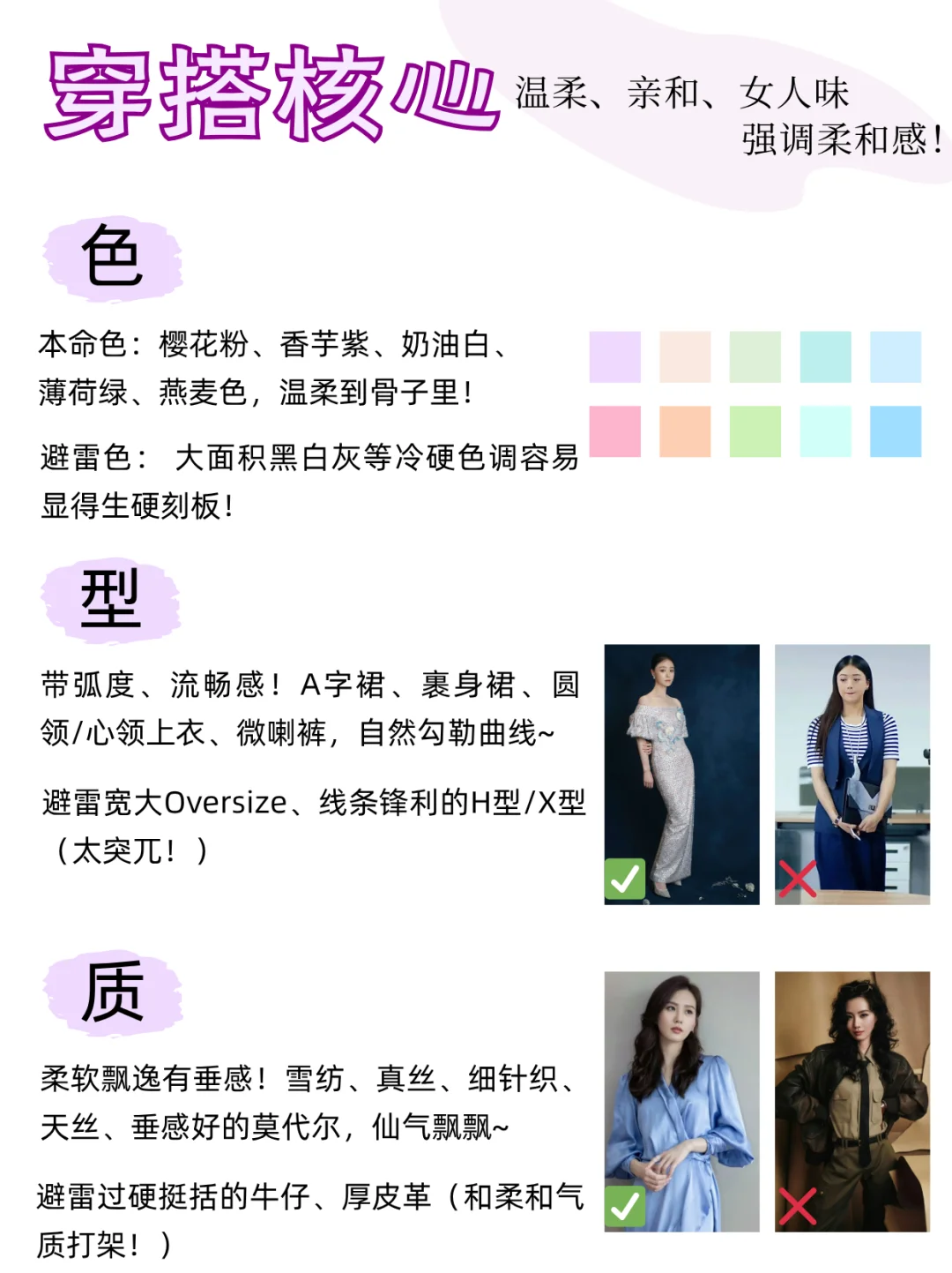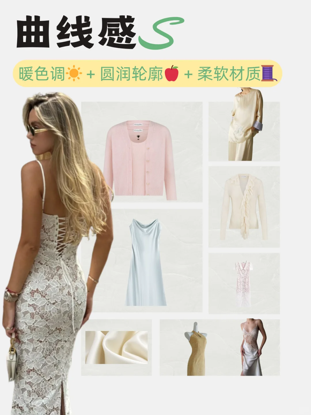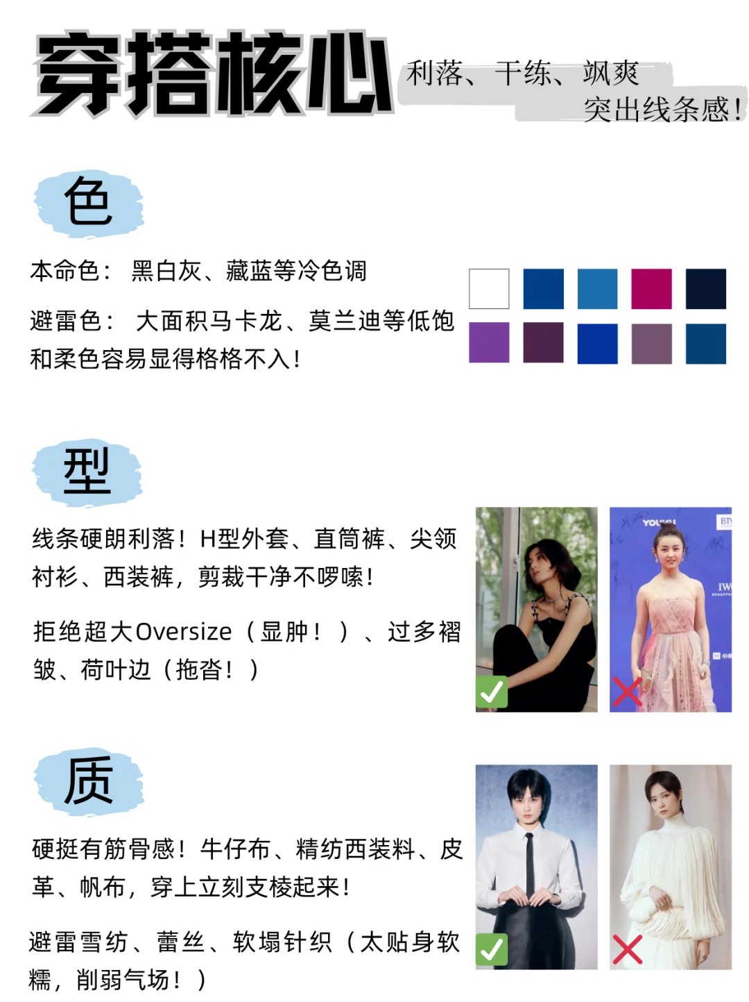 没有完👌美的身材,只有不会穿搭的脑袋🤯!\n1分钟搞懂「直曲」,穿搭对味美出新高度!\n \n🌟step 1:测身材「直曲属性」\n✅看骨架线条:\n• 直线型:肩线平直、锁骨分明、腰臀差小(H型身材居多)\n• 曲线型:肩线圆润、腰细臀宽、肉感柔软(沙漏型、梨形身材居多)\n• 中间型:两者混合,如直角肩+蜜🍑臀\n✅看五官气质:\n• 直:棱角分明,下颌线清晰,眼神沉稳犀利\n• 曲:圆脸杏眼,线条柔美,眼神温柔细腻\n \n👗step 2:看单品「直曲感觉」\n⚠️单品的「直曲感」由色、型、质共同决定!\n🔹直线感: 冷色调🧊 + 利落剪裁✂️ + 硬艇面料🧥 (想想西装、牛仔!)\n🟠曲线感: 暖色调☀️ + 圆润轮廓🍎 + 柔软材质🧵 (比如针织、缎面裙~)\n \n📕step 3:对号入座找到本命穿搭\n👑直线型人:人间直角尺!\n穿搭核❤️:利落、干练、飒爽,突出线条感!\n \n🎨 色彩:\n本命色: 黑白灰、藏蓝、军绿等冷色调\n避雷色: 大面积马卡龙、莫兰迪等低饱和柔色 🙅♀️ 容易显得格格不入!\n✂️ 版型:\n线条硬朗利落!H型外套、直筒裤、尖领衬衫、西装裤,剪裁干净不啰嗦!\n拒绝Oversize(显肿!)、过多褶皱、荷叶边(拖沓!)🙅♀️\n🧵 材质:\n硬艇有筋骨感!牛仔布、精纺西装料、皮革、穿上立刻支棱起来!\n避雷雪纺、雷丝、软塌针织(太贴身软糯,削弱气场!)💣\n \n💕 曲线型人:行走的温柔刀!\n穿搭核❤️:温柔、亲和、女人味,强调柔和感!\n🎨 色彩:\n本命色: 暖调柔色!樱花粉、香芋紫、燕麦色,温柔到骨子里!\n避雷色: 大面积黑白灰等冷硬色调 🙅♀️ 容易显得生硬刻板!\n✂️ 版型:\n带弧度、流畅感!A字裙、裹身裙、圆领上衣、微喇裤,自然勾勒曲线~\n避雷宽大Oversize、线条锋利的H型/X型(太突兀!)💣\n🧵 材质:\n柔软飘逸有垂感!雪纺、真丝、垂感好的莫代尔,仙气飘飘~\n避雷过硬艇括的牛仔、厚皮革(和柔和气质打架!)🙅♀️\n \nBUT! 现实穿搭哪有💯直或曲?都是混搭高手!👏\n例:曲线感软糯针织衫 🧶 + 直线条牛仔裤 👖 = 温柔带点帅!\n \n#形象管理 #个人色彩测试 #穿搭底层逻辑 #服装店 #服装人 #美业人 #纹绣师 #化妆师 #个人形象色彩风格诊断 #穿搭