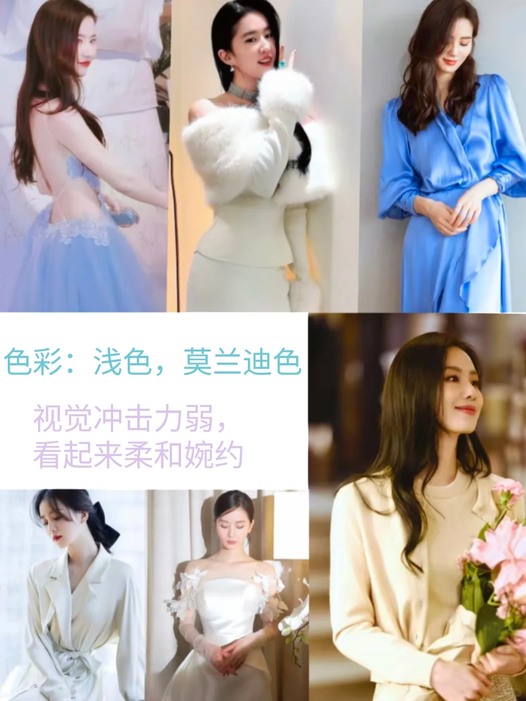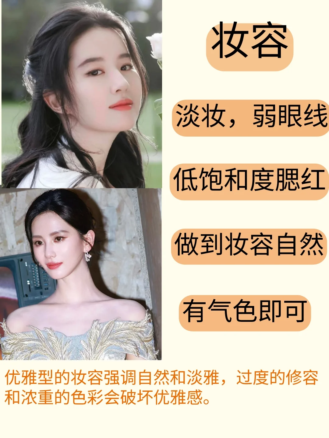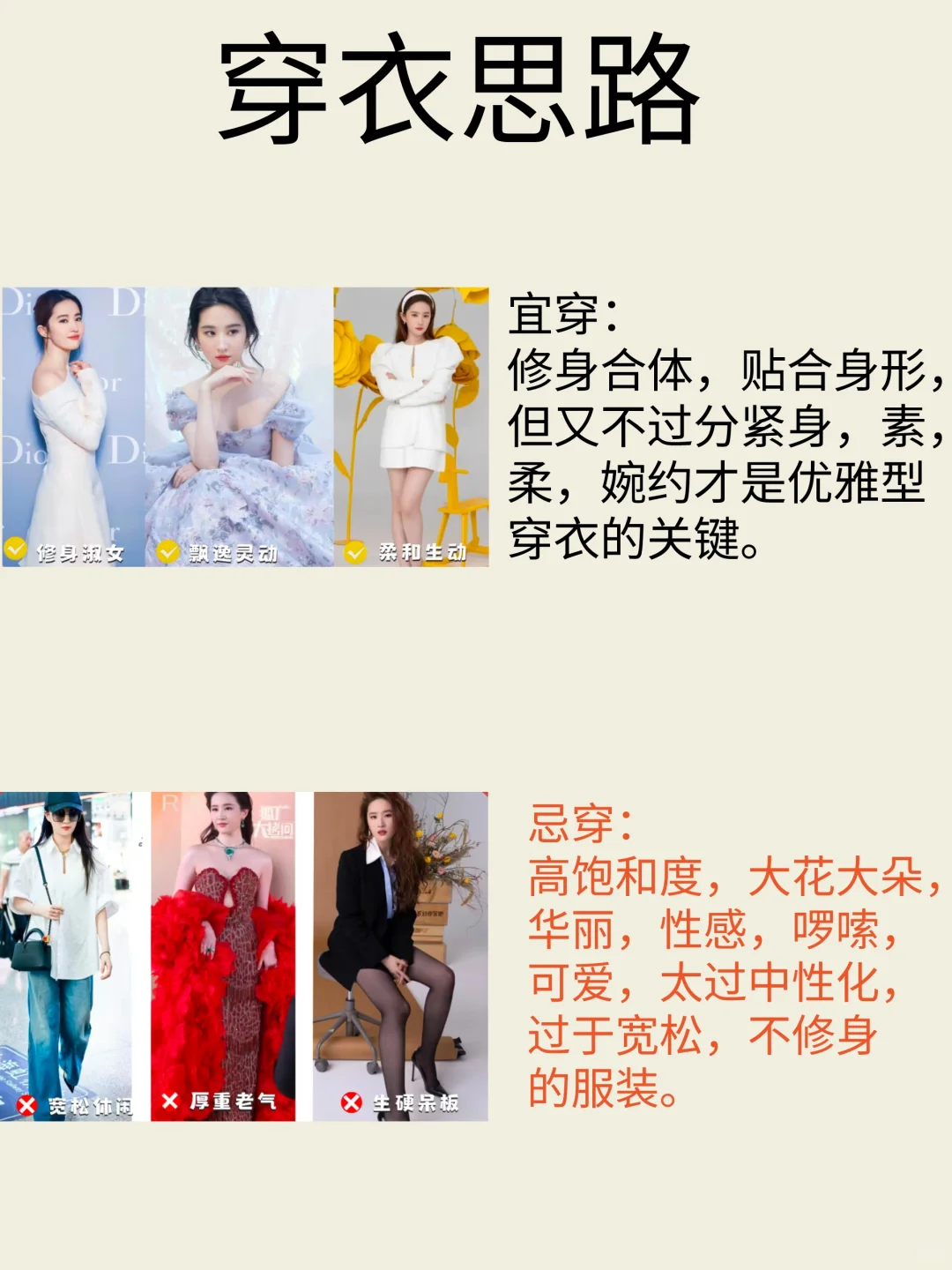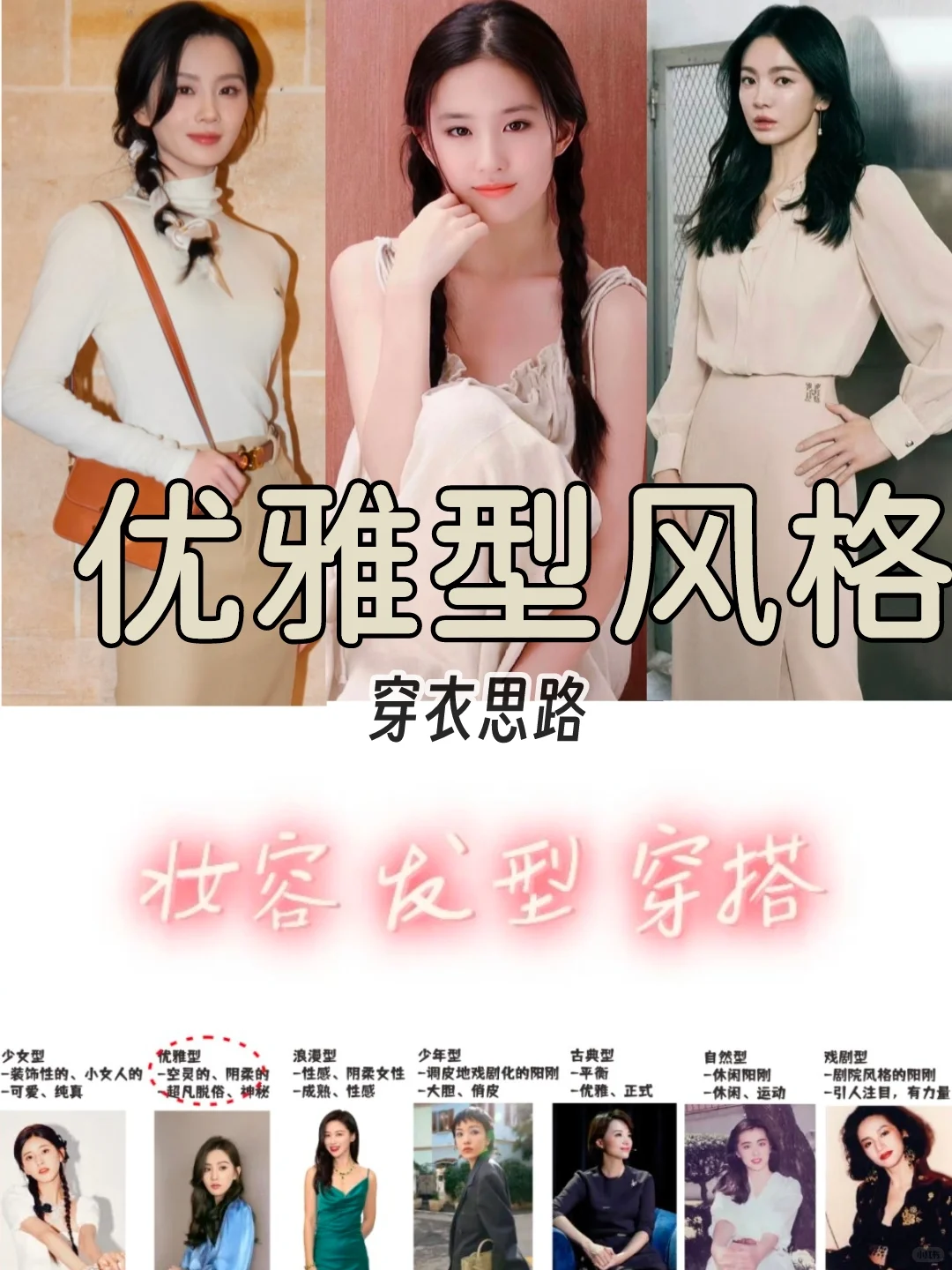 优雅型风格:曲线型,中量感,脸部轮廓线条圆润,五官精致,眼神温润柔和,五官大小均匀适中,给人的整体感觉是温柔,恬静,婉约,小家碧玉的。\n \n1️⃣服装版型:曲线型剪裁,修身版型,整体的氛围是柔美和雅致的。像衬衫,西装,风衣,这类单品也更加适合干净垂顺的版型。\n \n2️⃣面料选择:柔软,细腻,有柔和光泽和垂坠感的材质,如真丝,细纱,羊毛,羊绒,都可以来制造优雅型需要的飘逸感。\n \n3️⃣ 色彩和图案:颜色越柔和,贵气越外溢,如象牙色,暖灰色,淡蓝色等等,图案上避免强烈分明的颜色变化,会显得俗气。多选择一些如波点,模糊感的淡雅图案,可以很好的展示优雅的知性婉约。\n \n4️⃣ 配饰:珍珠,钻石,水晶,金银饰品,都非常适合优雅型。避免一些夸张的,另类的,过于可爱的饰品,会破坏优雅的精致。\n5️⃣妆容:优雅型的妆容强调自然和淡雅,避免过度的修容和浓重的妆容。\n🎈总结来说:优雅型是用柔和的色彩,搭配秀气精致的配饰,来展现婉约知性的女性魅力。\n \n#风格解析 #优雅型风格 #形象美学 #优雅穿搭 #变美思路 #穿衣思路 #时尚穿搭 #潮流薯 #穿出自己的风格 #时尚薯