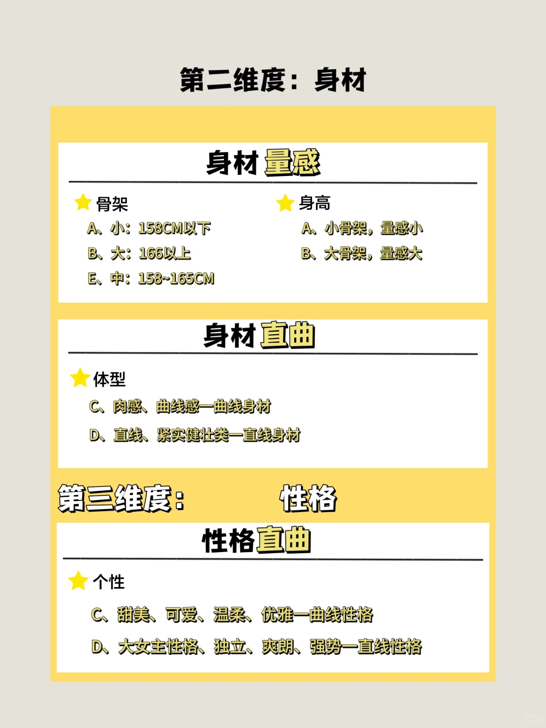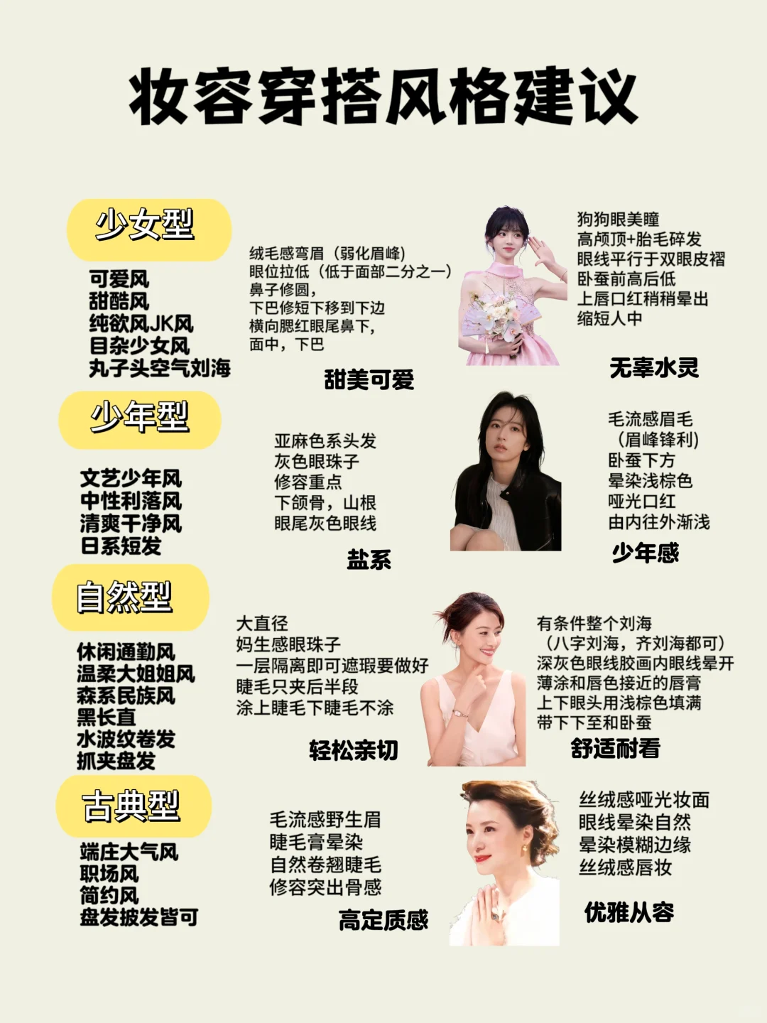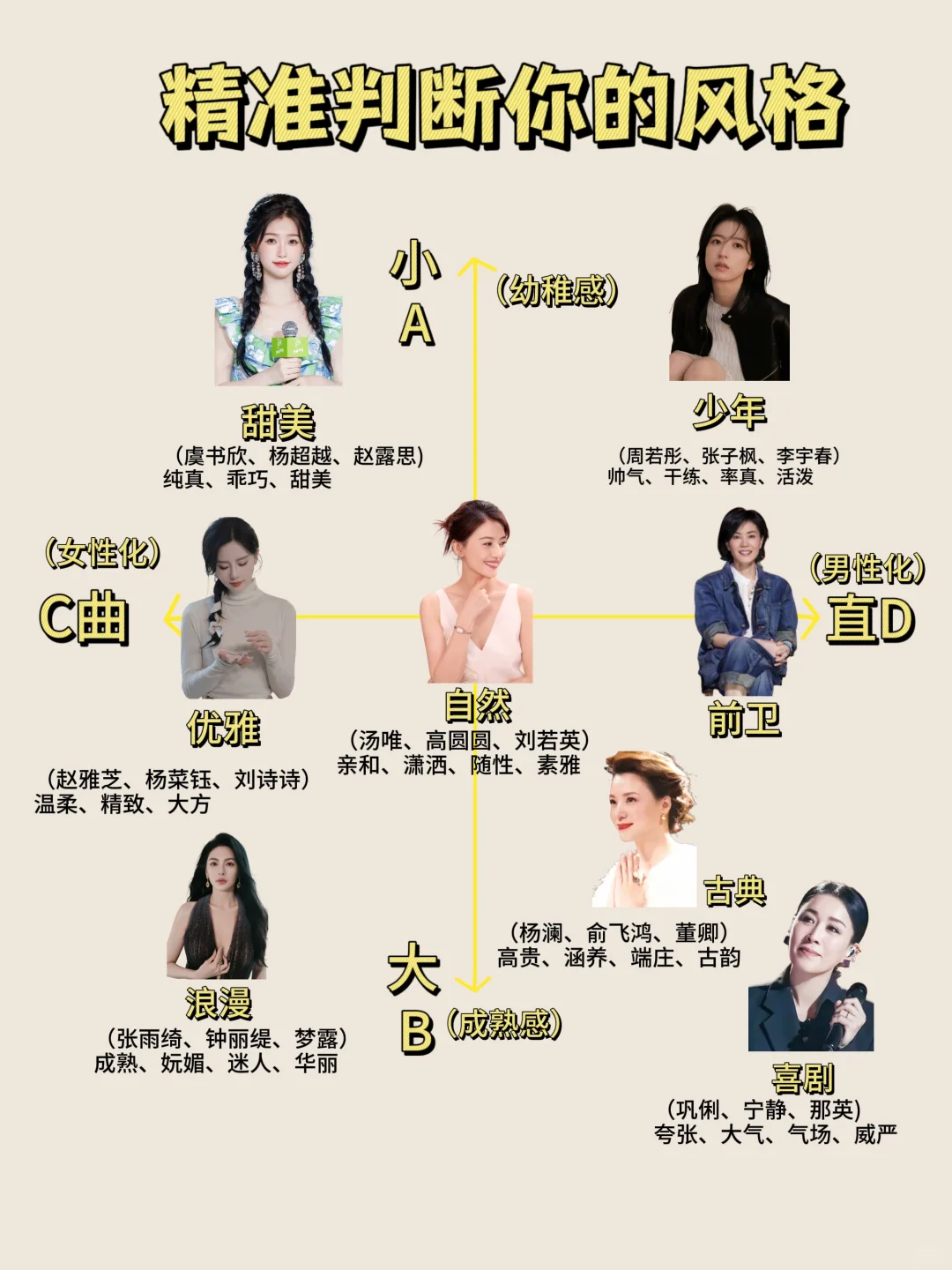 1分钟自测帮你找到专属穿搭密码!\n从五官到身材再到性格,3个维度精准定位你的\n直曲&量感,让你告别盲目跟风,穿出独特魅\n力。\n \n你是不是经常看着别人穿好看,买回来就踩雷\n💡真相是:别人穿好看≠你穿好看!\n \n只有“适合你的风格”,才能让你美得毫不费力!\n今天教你用「直曲+量感,两大核心维度,从\n五官、身材、性格快速定位你的专属风格!\n \n✨第一步:明确你的“量感”大小\n再选择和自己量感匹配的衣服、发型、妆容、配\n饰\n比如偏小量感的人,更适合浅色、轻盈的发型、\n小图案、小配饰、小包包。\n量感偏大:更有成熟感、力量感和气场。\n量感中间:不容易穿错,可以驾驭的范围更多,\n可以穿搭以身材量感为主,发型和妆容以面部量\n感为主,也可以选择适中。\n \n量感偏小:视觉年龄更显小,更有年轻和活力感\n⚪小量感(幼态年轻):\n适合:浅色、小碎花、迷你包、细项链。\n明星参考:张元英、田曦薇\n⚫大量感(成熟气场):\n适合:深色、大廓形、宽檐帽、夸张耳环。\n明星参考:巩俐、姚晨\n🔲中间量感:(可直可曲)\n适合:灵活切换,重点突出优势部位!\n明星参考:高圆圆、刘若英\n \n✨第一步:明确你的直曲\n再选择和自己直曲匹配的服装、发型、妆容、配\n饰\n比如,偏曲的人适合穿面料偏软、颜色偏浅、图\n案偏圆、配饰偏圆、发型适合微卷发、款式偏裙\n装。\n \n❗注意:可能你有的部位直,有的部位曲\n💡关键技巧:70%看脸部(眼睛决定直曲),\n20%内在性格,10%身材!\n \n🔹偏直型(男颜感):\n*特点:五官棱角分明(如丹凤眼、高颧骨),\n气场强、干练飒爽、有距离感。\n*适合:直线剪裁西装、冷色调、金属配饰。\n*明星参考:刘雯、李宇春\n \n🔸偏曲型(女颜感):\n特点:五官圆润(如杏眼、肉鼻头),温柔甜\n美、优雅、亲和力强,有女人味,没有距离感。\n适合:荷叶边、碎花裙、珍珠配饰。\n明星参考:赵露思、虞书欣\n \n🔘中间型(可盐可甜):\n特点:可柔可刚,温柔又有力量,风格跨度大\n适合:混搭(如西装+蕾丝)、低饱和度色系。\n明星参考:周雨彤、宋茜\n \n✅找到你的“风格DNA”,穿搭效率翻倍!\n#今年N个漂亮时刻 #妮好整体形象#美学考证