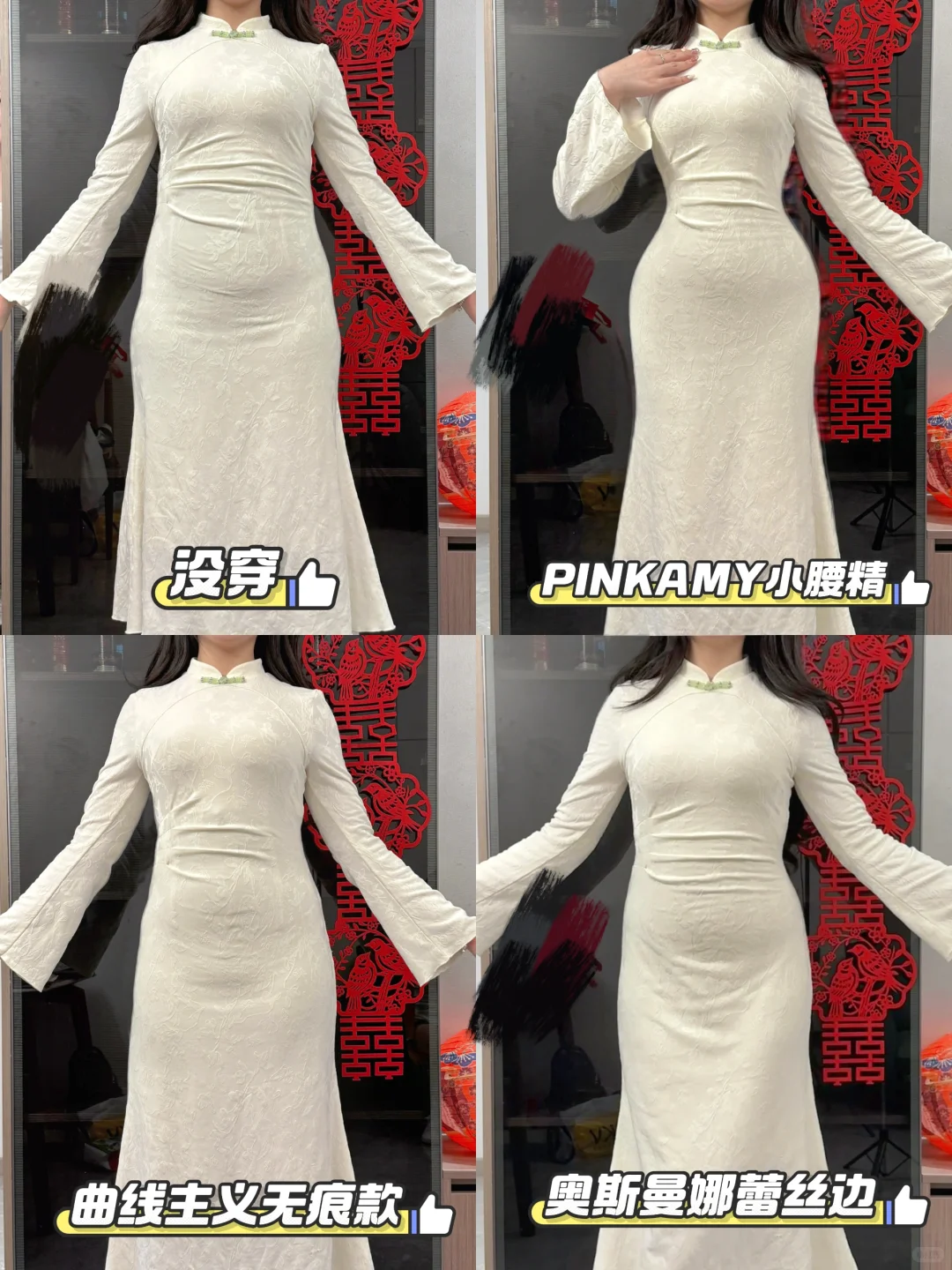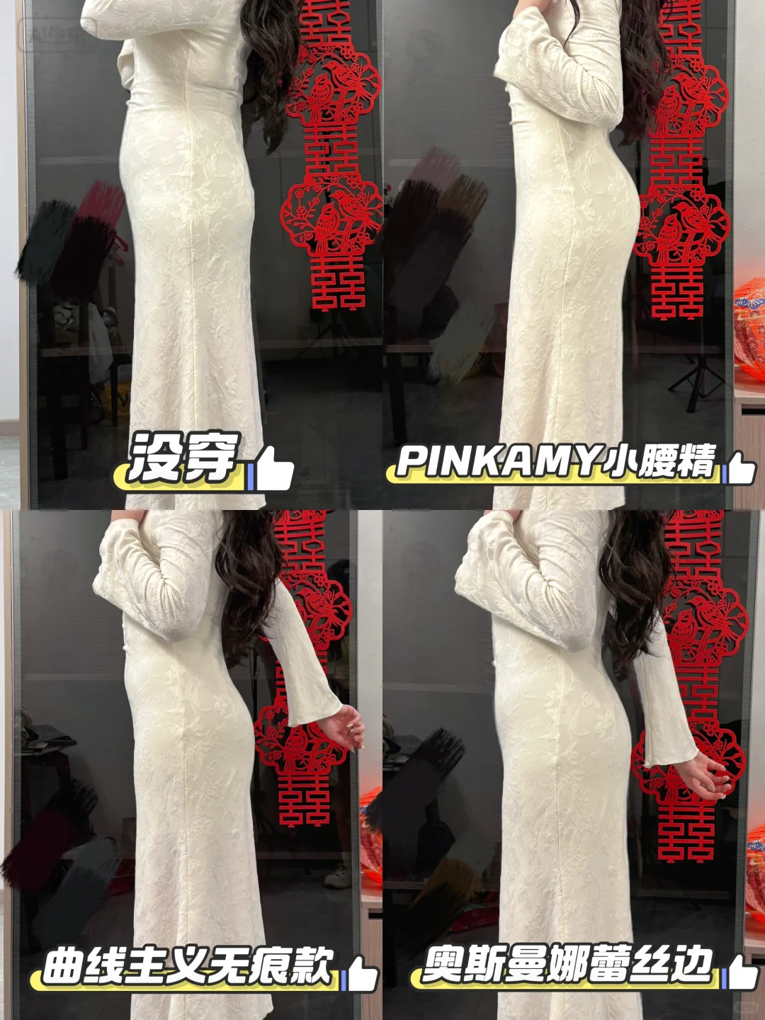 没人管管苹果型吗?这大肚子大粗腰穿上旗袍五大三粗的咋订婚啊!给我穿出身材焦虑了呜呜呜~没招了在红薯看人家穿收腹提臀裤还行俺也来试试!\nPINKAMY小腰精:别说我这水桶腰穿上也有腰线了,肚子上的赘肉也能兜进去,皮鼓圆溜溜的还挺饱满\n曲线主义无痕款:面料是那种冰冰凉凉的比较凉快,弹性也很大穿脱没感到勒肉,无痕的设计还不戳\n奥斯曼娜蕾丝边:长度很日常可以当打底裤,裤腿是蕾丝的花边颜值很高,整体是半透明的面料比较透气\n纠结了一下还是留小腰精那个啦,腰细臀翘的谁不迷糊啊哈哈哈~\n#订婚 #旗袍 #订婚穿搭 #PINKAMY小腰精 #曲线主义 #奥斯曼娜 #国庆节 #国庆订婚 #苹果型身材 #收腹裤