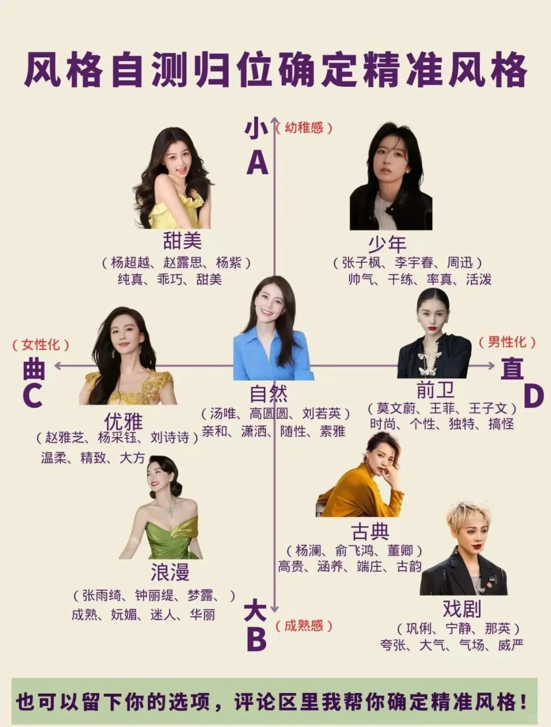 👚衣橱衣服千千万,没有一件穿好看❓为什么花了很多钱,买了很多衣服,总是穿不出感觉❓\n \n风格对了,气质开挂💃穿对风格轻松变美变好看。今天我们从风格的“量感&直曲”来明确我们穿搭、发型的独特风格:\n \n👉【量感】是综合大小、轻重、厚薄份量感、身高、性格,等给人的整体感觉,看是幼态还是成熟?\n \n✨如果五官小巧,眼神轻盈,五官紧凑,看起来年轻幼态,量感小,幼态=【A多小量感】\n \n✨小量感:适合小包包、小图案、小配饰,轻盈的发型。适合A字裙、小短裙等款式。\n \n✨如果你的五官立体,五官占比大,五官分散,看起来成熟权威,量感大,成熟=【B多大量感】\n \n✨大量感:适合夸张大气的配饰、大图案、厚重的发型。适合宽松、长裙等款式,廓形大而挺括的衣服。\n \n👉【曲直】是整个人轮廓是偏立体硬朗,还是圆润肉感❓\n \n✨ 如果你眼睛圆润、眼神柔美,眉形圆润,没有眉峰,圆脸、鹅蛋脸、瓜子脸,身材肉感、凹凸有致=【C多曲线女颜】\n \n✨曲线型女颜适合穿偏曲的波点、碎花图案、裙装,充满曲线设计和女性韵味的衣服,戴偏曲的配饰等,适合暖色调和柔和的颜色。\n \n✨如果你眼睛细尖,眼神有力量,眉形高挑,眉峰明显,方脸、长脸、菱形脸,身材骨感、紧实健壮=【直/男颜】\n \n✨直线型男颜:适合穿裤装、西装,偏直线的条纹、格子图案,配饰偏直线等,看上去利落帅气的衣服,适合冷色调和深色。\n \n✨那么,你的五官气质风格是哪种呢?适合哪种穿搭、妆容呢?👇区里告诉我答案,不确定我来帮你看,赶快艾特你的小姐妹一起来测。\n \n✨ 我会在这里持续更新变美变富的内容,关🐷我一起成长,有钱有颜💝#自我定位风格 #找对自己的形象风格 #个人风格定位 #如何找到自己的风格 #解锁专属你的性格色彩 #自我风格探索 #多风格选择