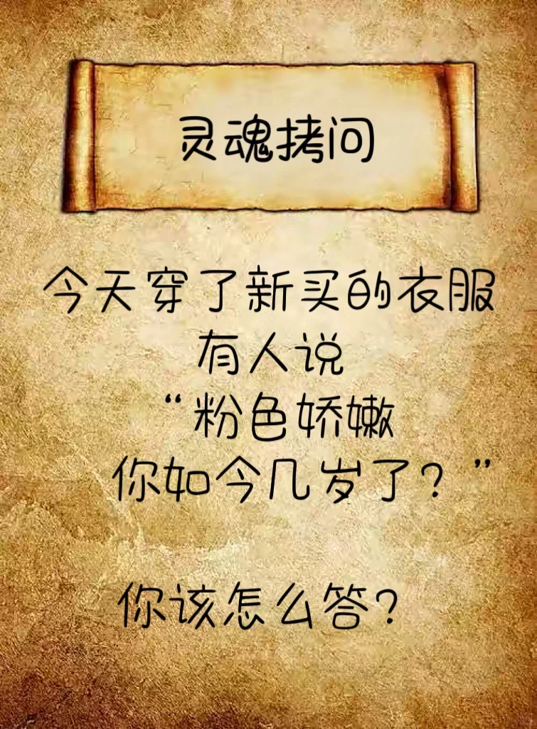 🌝跟着我,每天投喂心眼子\n🌝嘴笨反应慢星人,左滑有惊喜\n🌝当你兴高采烈穿了粉色新衣服\n🌝被人说“粉色娇嫩,你如今几岁了?”\n🌝你会怎么答?\n🌝欢迎留下神回复哈哈哈\n \n