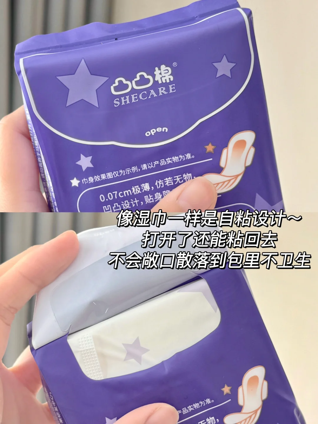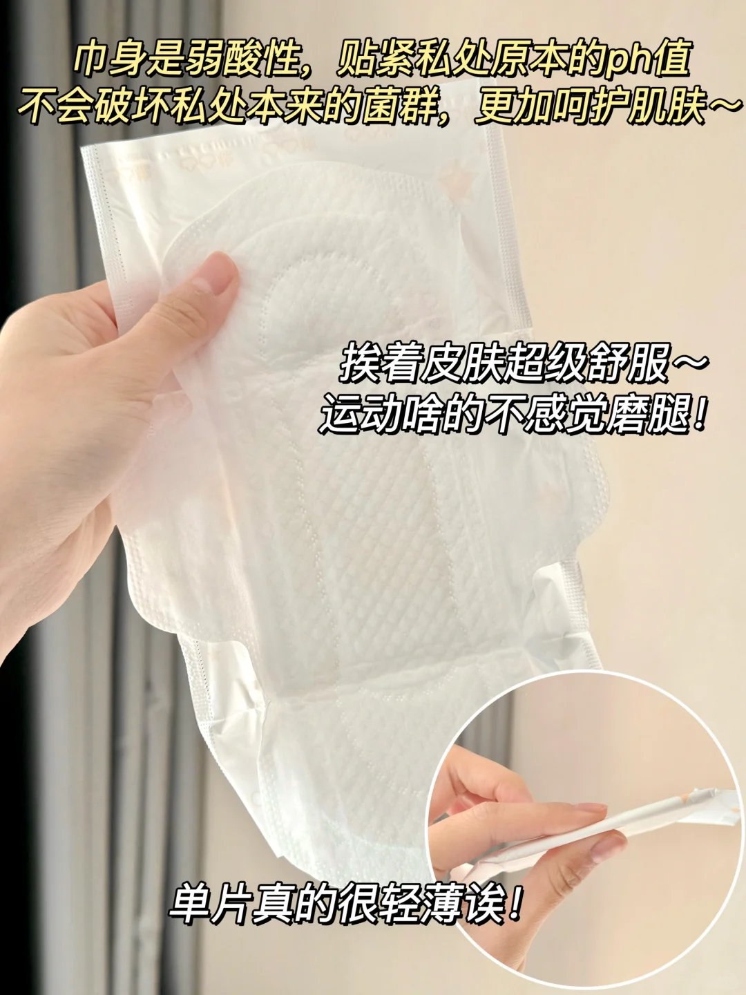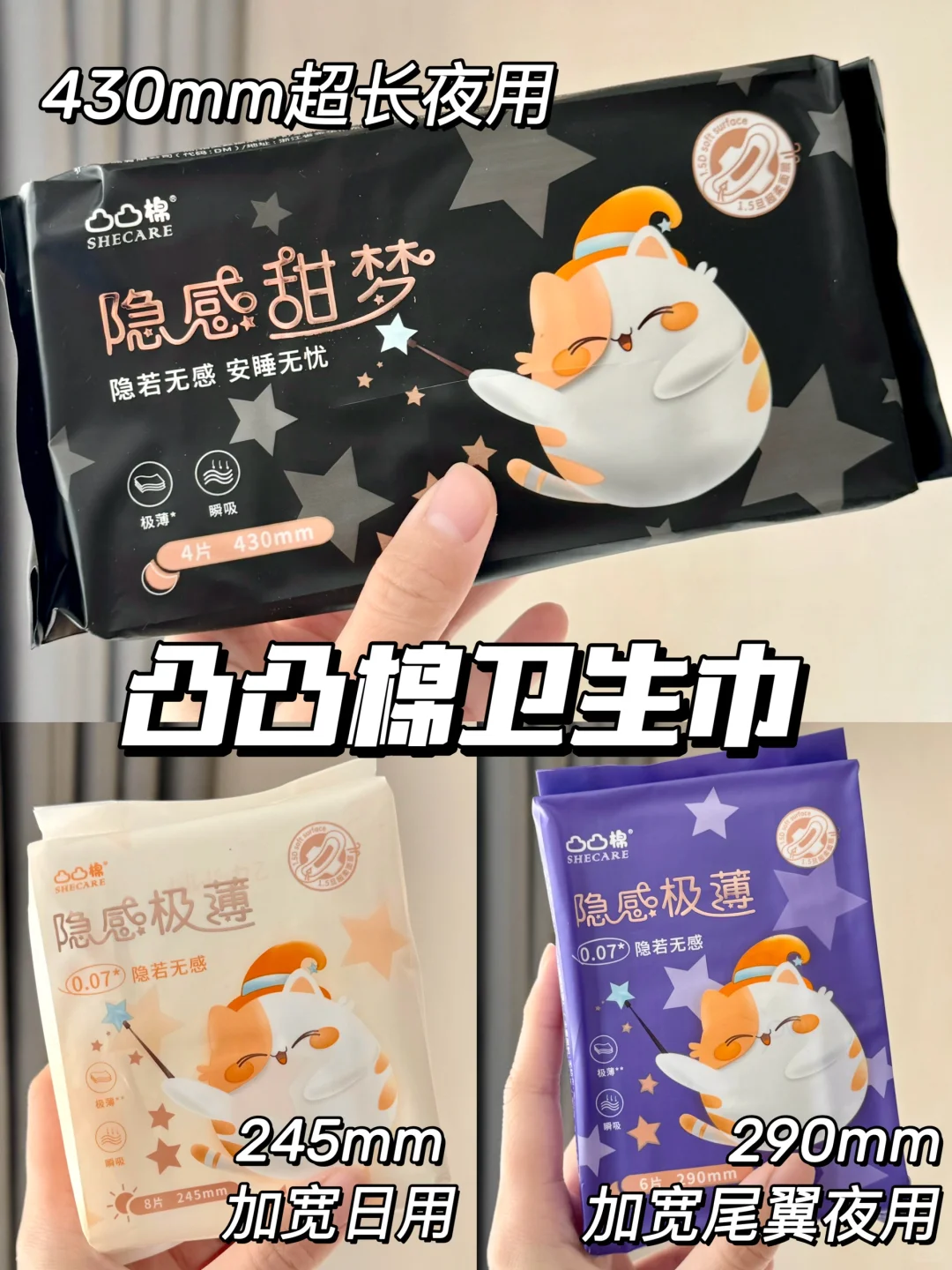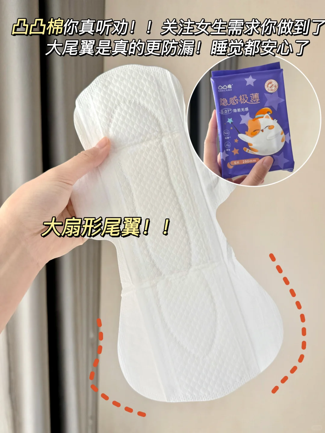 能让我妈无限囤货的姨妈巾,果然是有两把刷子的👏🏻\n之前就一直在用凸凸棉卫生巾\n在刷到女生真正需求卫生巾相关视频的时候,\n就想着凸凸棉会不会也按那个大尾翼需求升级一下\n这不凸凸棉隐感极薄系列升级款就来了!\n-\n🌟贴在内裤上就很没有存在感,整体hin轻薄\n冬天穿着厚厚的衣服没一点闷和粘腻的感觉!\n-\n🌟别看它薄,但是它真的很能吸!🌟30倍海量瞬吸!\n量大的时候总是感觉血刚出来就被吸收了,都没有流动的感觉....\n表层每次去换的时候也是感觉表层没什么东西,背后看一大片.....\n-\n🌟升级后日用做了加宽设计,更完美的宽度吸收面积也变大了\n两边是柔边护围,动来动去的时候不仅不会磨腿还更防漏啦!\n290mm夜用专门增加了防漏大扇尾,躺着的时候也不担心后漏~\n要是290mm不够用,\n加长的430mm夜用也是大扇尾,搭配两翼立体护围,晚上想怎么动就怎么动!\n-\n🌟除了片形做了优化升级外,凸凸棉这次的隐感极薄系列还专门又升级了面层,比原来更柔软,挨着皮肤也更加舒服,并且弱酸性的巾身也贴近私处本来的ph值,整体对敏感娇嫩肌会更友好!\n-\n这么听劝又认真做产品的凸凸棉卫生巾\n真不允许还有姐妹没试过!\n只要不停产!我真的能一直用!\n#卫生巾 #卫生巾推荐 #卫生巾测评 #凸凸棉 #凸凸棉卫生巾 #学生党好物 #凸凸棉极薄卫生巾