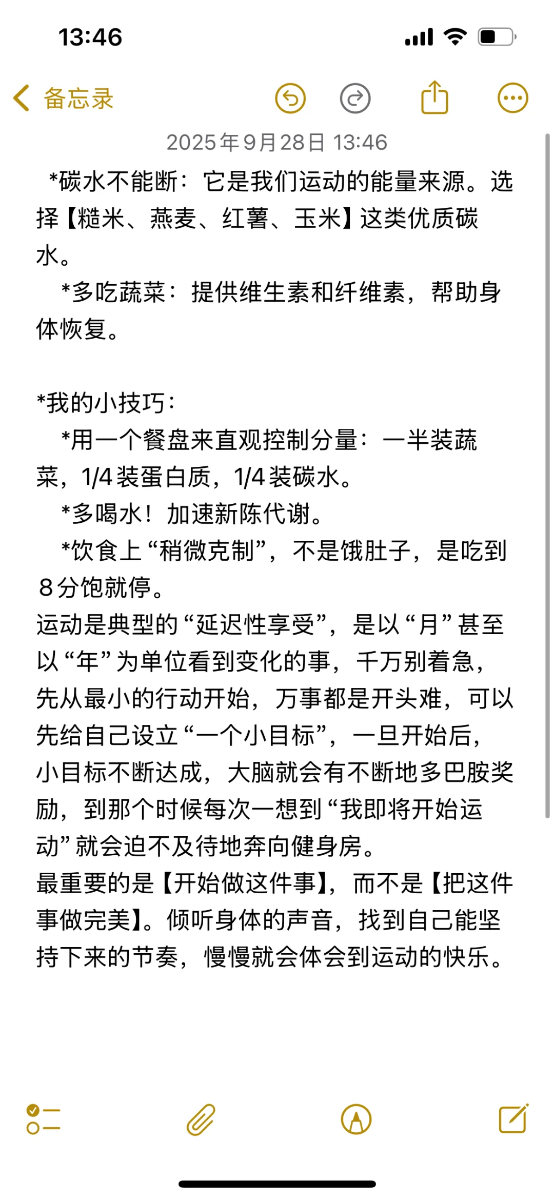 ✍️写在前面:此篇文章新手友好,我打算从这起开始逐渐写些我的运动具体思路、训练动作和执行方法,或者大家有更想看的也可以在评论区告诉我~\n \n上几篇笔记发出后看到有些朋友在评论区说,想健身又怕练得太壮,变成“金刚芭比”。其实真的想多啦!女生由于激素原因,长肌肉比男生难得多。我们普通人系统训练,追求的就是紧致、有线条、“显高显瘦”的好比例视觉效果。\n \n今天就跟大家聊聊,我是怎么通过“吃”“练”,慢慢练出现在这种身材的。\n*(第一部分:训练思路——巧劲比蛮力更重要)\n我的原则是:塑形为主,增肌为辅。目的是让肌肉变得更紧实,线条更好看,而不是一味追求变大。\n*一周计划怎么安排?\n*力量训练(一周4次):这是塑形的核心。我用的是一套“三分化”训练,简单说就是“把全身肌肉分三天练完,然后循环”。\n*Day 1: 臀腿(箭步蹲、罗马尼亚硬拉、直腿硬拉、单腿硬拉)\n*Day 2: 胸+肩(卧推、哑铃飞鸟侧平举、直臂下拉、蝴蝶机反向飞鸟)\n*Day 3: 背(辅助引体向上、坐姿划船、绳索面拉、宽距、窄距高位下拉)\n*这样循环一遍后,第四天再加强一下自己最想改善的部位。\n* 有氧训练(2-3次):我特别喜欢【跑步机爬坡】(坡度12,速度4.5-5),它对膝盖友好,燃脂效果好,还能顺便练练臀。放在力量训练后做30-40分钟就行。\n* 功能性训练(N次):这个听起来高级,其实就是“融入生活的运动”。比如用壶铃做几个摇摆,或者做几组波比跳,旨在提升运动表现力、稳定性和爆发力。\n*动作的关键是什么?\n*重量,多次数:每个动作做【12次左右一组,连续完成4组】。这个模式非常适合雕刻肌肉线条,又不会过度刺激肌肉生长。\n*感觉比重量重要:动作过程中,要用心去感受目标肌肉的发力感,而不是单纯追求举起大重量。\n*(第二部分:饮食搭配——吃对才能事半功倍)\n“三分练,七分吃。”吃不对,可能事倍功半。\n*核心原则:营养均衡,总量克制。*蛋白质要吃够:它是肌肉修复和生长的原料。【鸡蛋、鸡胸肉、牛肉、鱼虾、豆制品】都是好选择。\n✍️字数太多放在图5,请往后翻👉🏼\n \n#野蛮其体魄 #健康有力量 #锻炼的意义 #力量与平衡 #见人不如健身 #审美