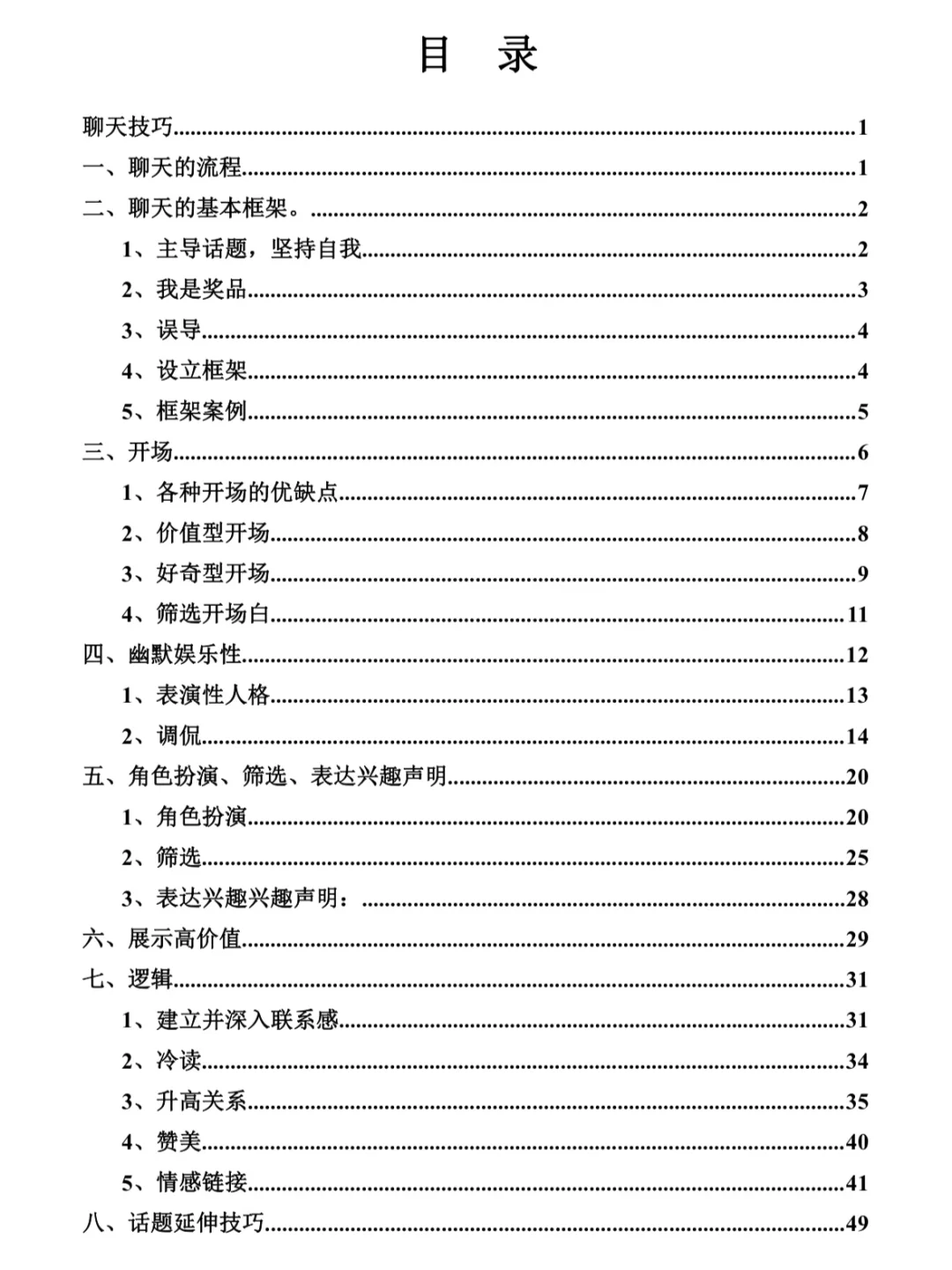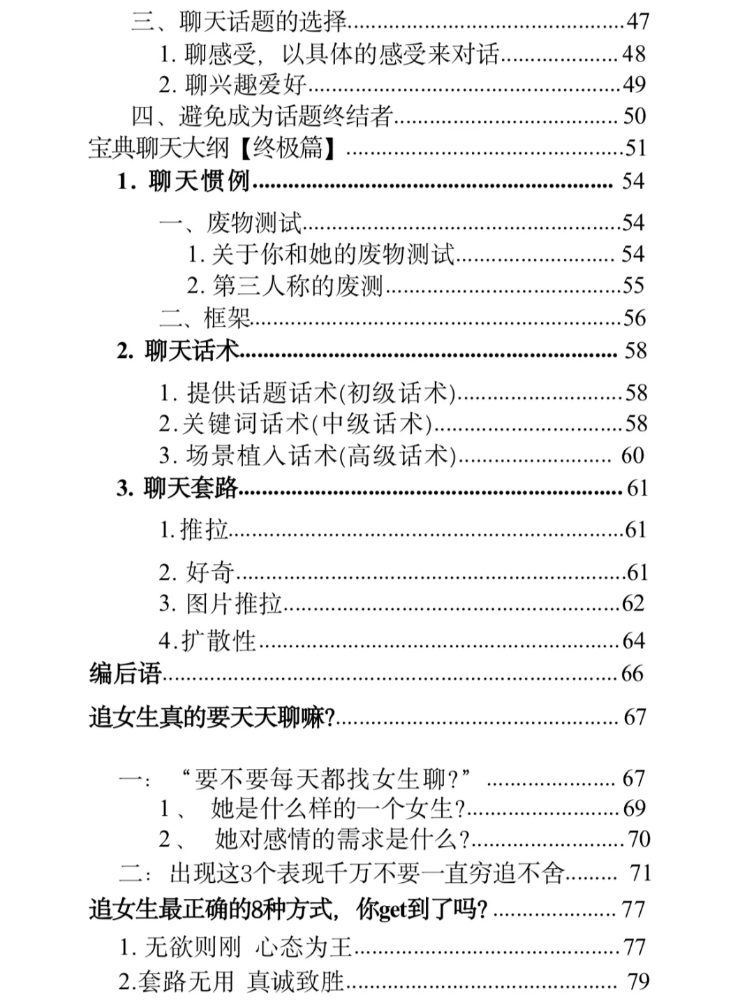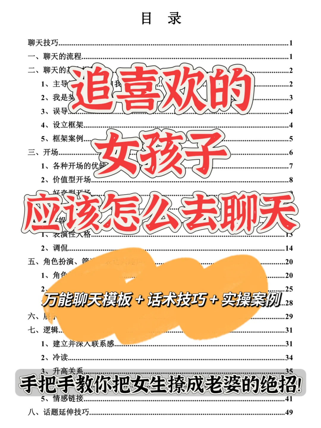遇到喜欢的女孩子,却不知道怎么聊天?别愁啦,这份万能聊天模板+话术技巧+实操案例 来救场!\n \n它有超详细的聊天流程,从主导话题到设立框架,再到各种开场方式,价值型、好奇型等任你选。还有调侃、角色扮演这些有趣的聊天技巧,搭配实操案例,手把手教你。掌握书中的方法把女生撩成老婆不是梦~\n \n