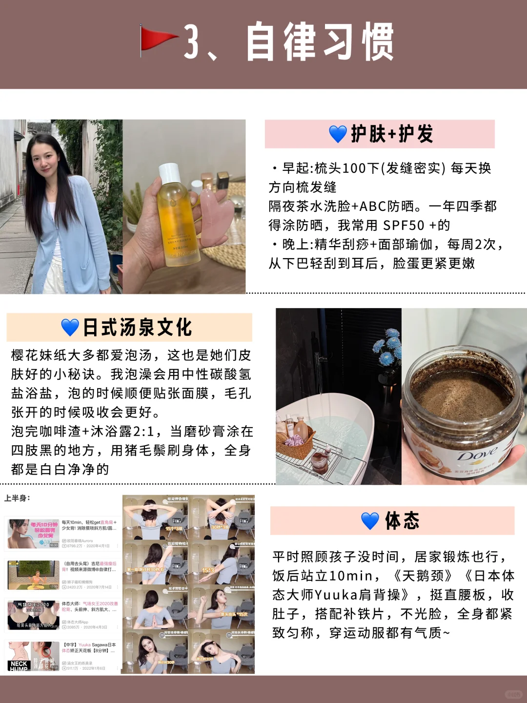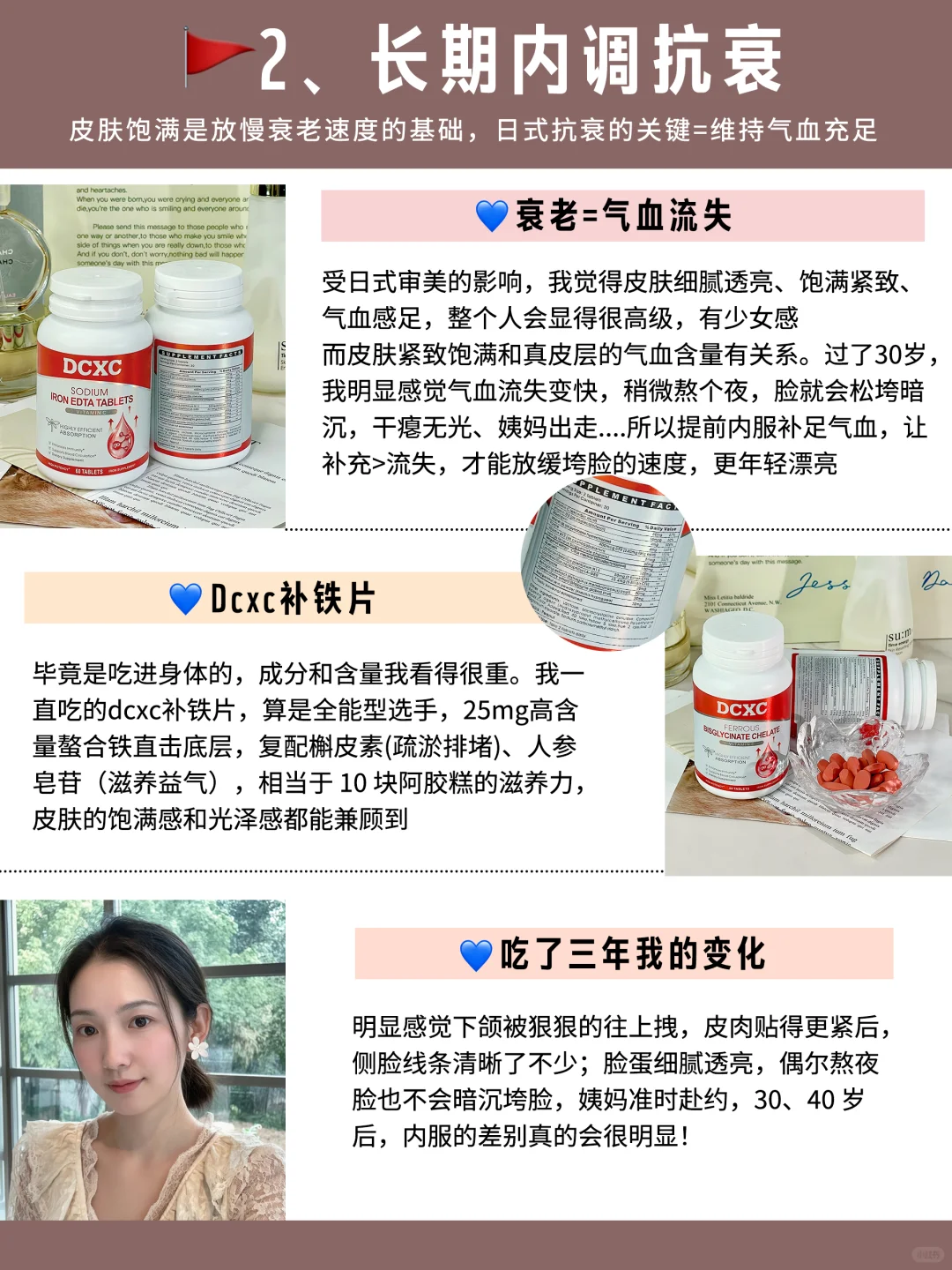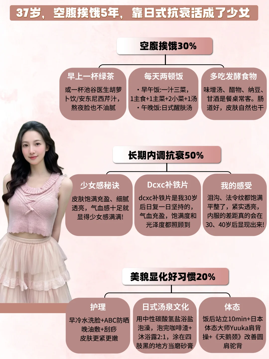37岁已婚,儿子都上初中了\n还总有人开玩笑说不像37像20,少女感满满,还有种女大既视感🤣!\n这几年靠日式保养尝到了不少甜头,把变美重心放在内在保养上,最后收获了紧致透亮的皮肤、匀称有线条的身材,连心态都变轻盈了,看着自己一点点变好,真的会有种爽感!\n-\n分享我坚持5年的习惯:\n🌿 1:空腹挨饿\n适度饥饿推动身体更新,维持身材线条和面部轮廓感\n❶早上一杯绿茶\n•茶文化很火\n•或者一杯池谷医生胡萝卜饮/安东尼西芹汁\n❷16+8饮食法+每天两顿饭\n▪早午饭:我家坚持「一汁三菜」,少油少盐,营养更好保留。1主食+1主菜+2小菜+1汤,量不多但蔬菜、肉蛋奶给得足\n▪午晚饭:日式醒肤汤\n❸多吃发酵食物\n味增汤、纳豆、醋物、甘酒是餐桌常客\n-\n💊2:长期内调抗衰\n受日式审美的影响,我觉得皮肤细腻透亮、饱满紧致、气血感足,整个人会显得很高级,有少女感\n而皮肤紧致饱满和真皮层的气血含量有关系。过了30岁,我明显感觉气血流失变快,稍微熬个夜,脸就会松垮暗沉,干瘪无光、姨妈出走....所以提前内服补足气血,让补充>流失,才能放缓垮脸的速度,更年轻漂亮\n▷瓶瓶罐罐试了很多才明白,成分>品牌。我一直吃的dcxc补铁片,算是全能型选手,25mg高含量螯合铁直击底层,复配槲皮素、人参皂苷,皮肤的饱满感和光泽感都能兼顾到\n▪坚持下来明显感觉到下颌被往上拽,皮肉贴得更紧后,侧脸线条清晰了不少;脸蛋细腻透亮,偶尔熬夜脸也不会暗沉垮脸,姨妈准时赴约,30、40 岁后,内服的差别真的会很明显!\n-\n🌸3:美貌显化好习惯\n❶护理:早冷水洗脸+ABC防晒,晚油敷+刮痧\n❷日式汤泉文化:中性碳酸氢盐浴盐泡澡,咖啡渣+沐浴露\n❸体态:饭后站立10min+日本体态大师Yuuka肩背操+《天鹅颈》\n#内调 #抗衰#少女感 #dcxc补铁片 #变美#好皮肤#日式保养#少女感