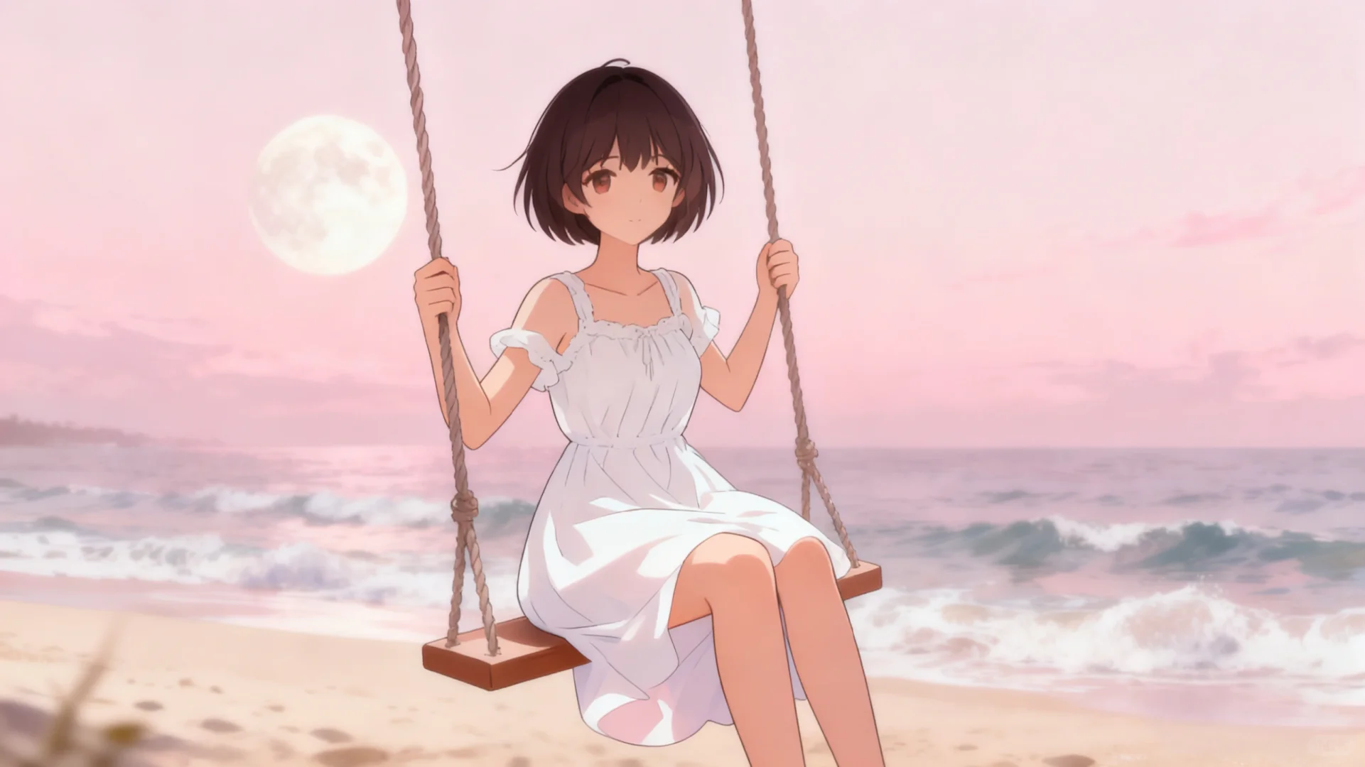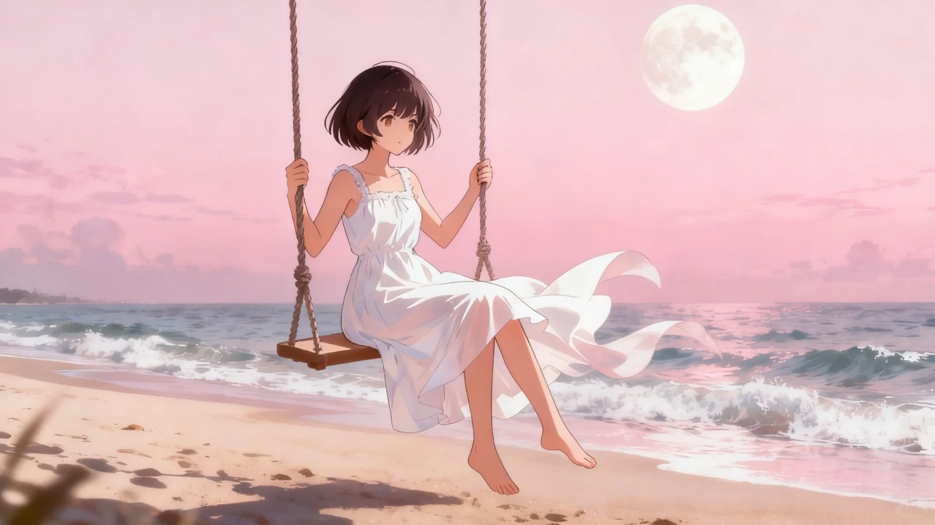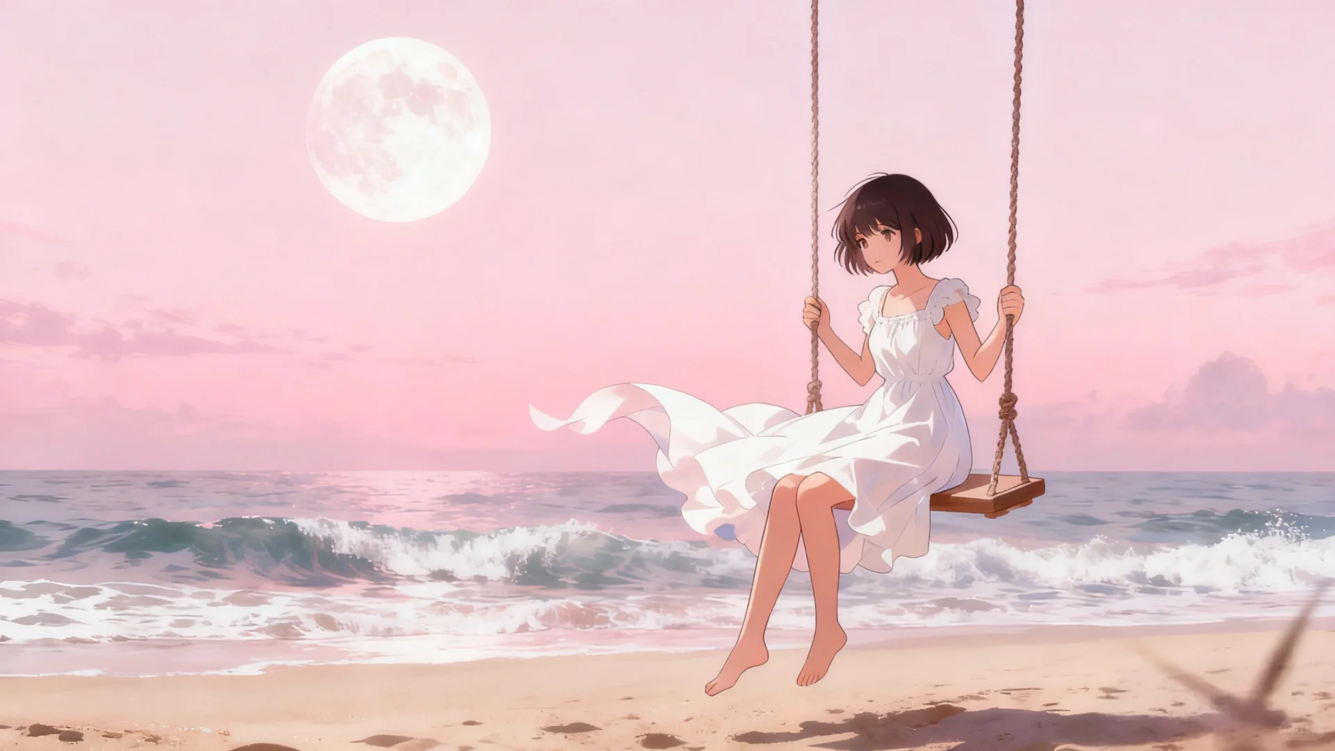 #生活需要分享欲 #唯美女生头像 #少女的征途是星辰大海 #治愈系插画 #唯美头像 #散落人间的神仙女头 #女性成长心旅\n \n粉月下,海声轻晃,白裙女孩在秋千上,把心事荡进温柔的潮汐里。