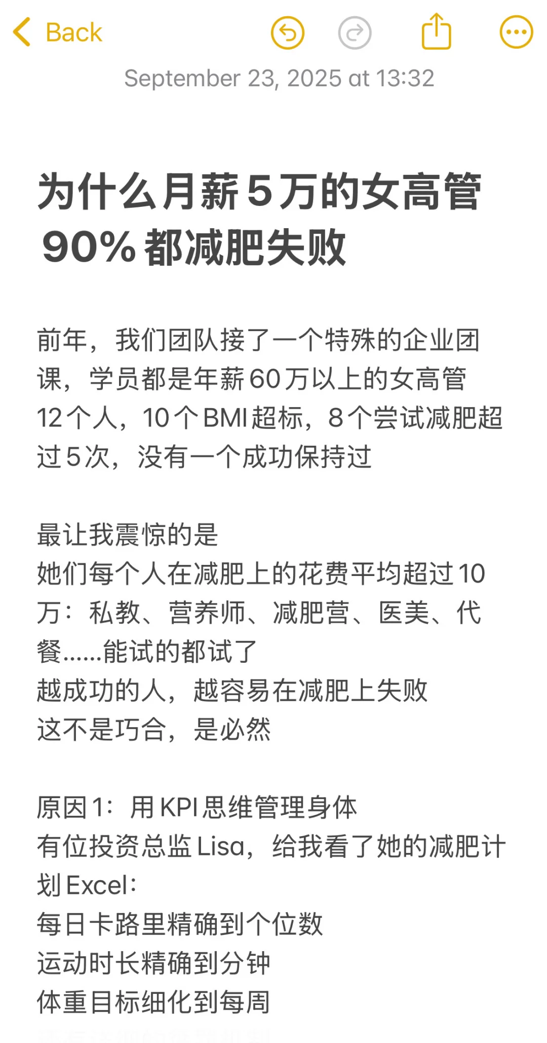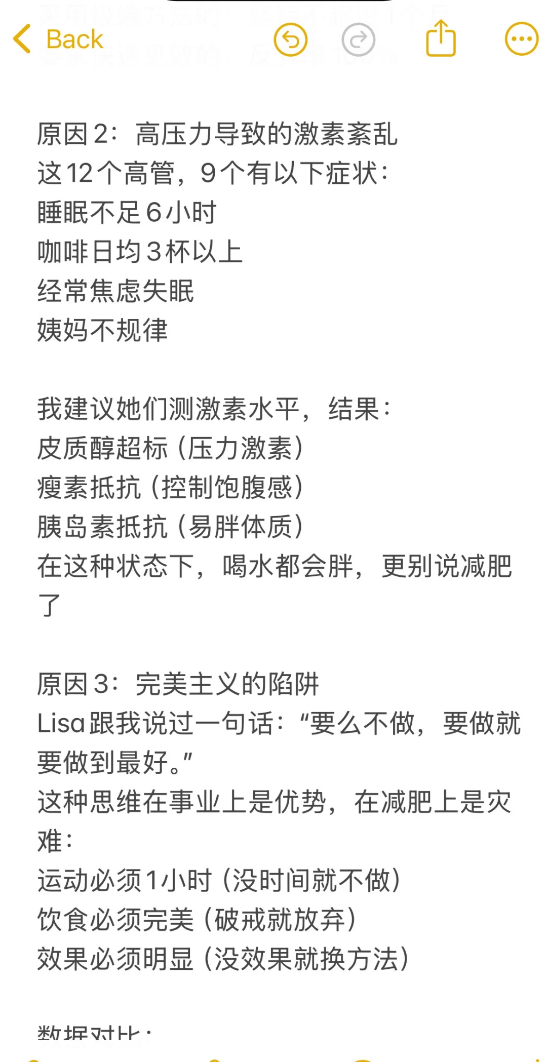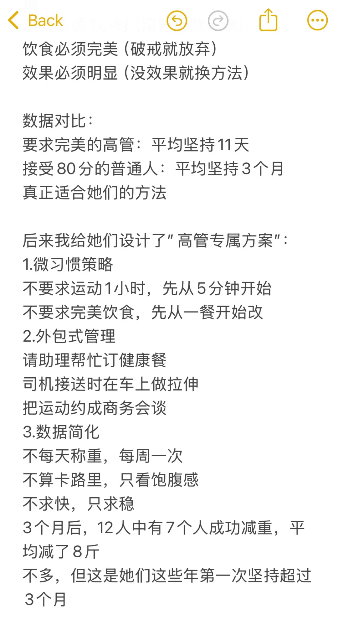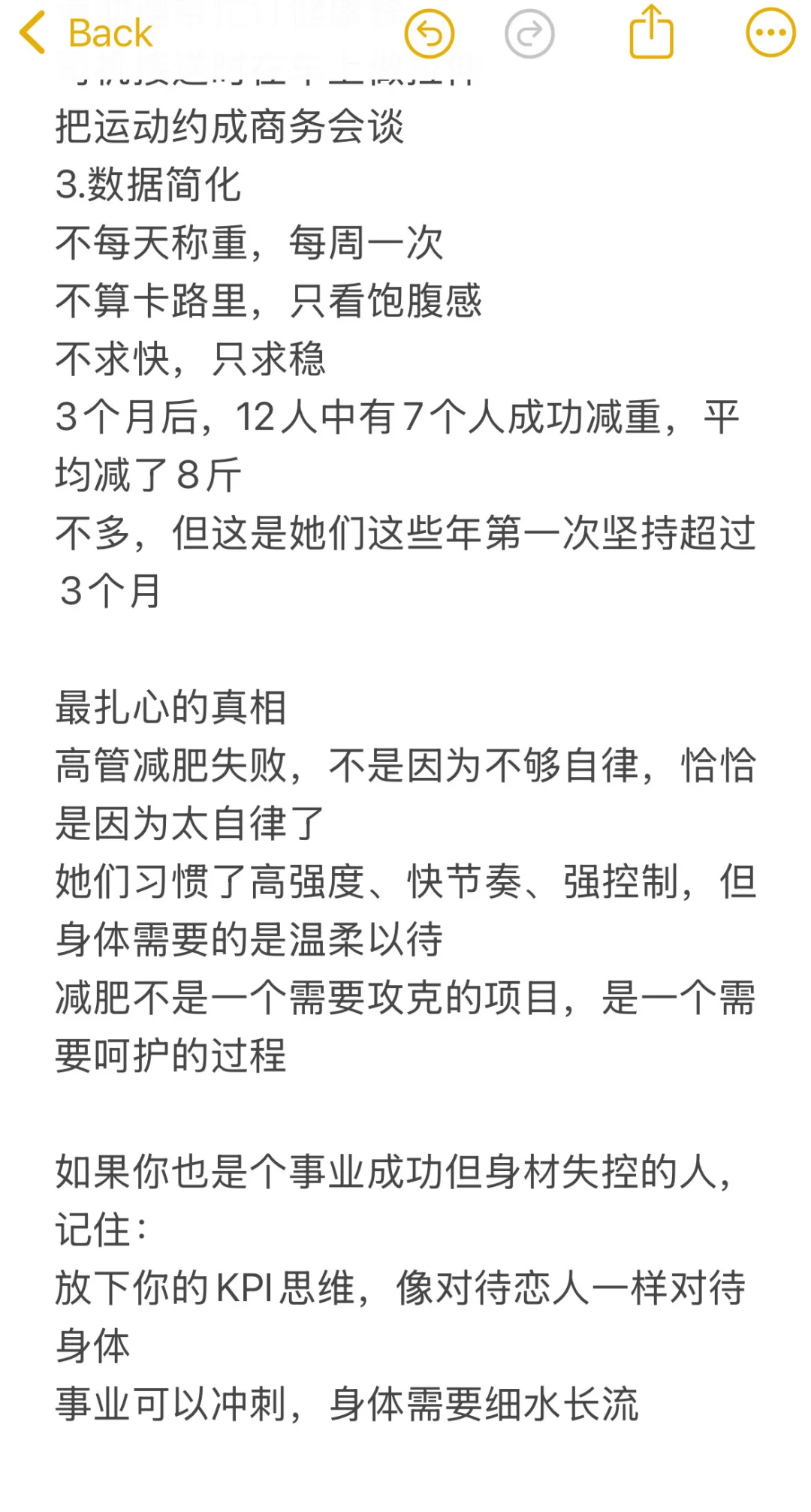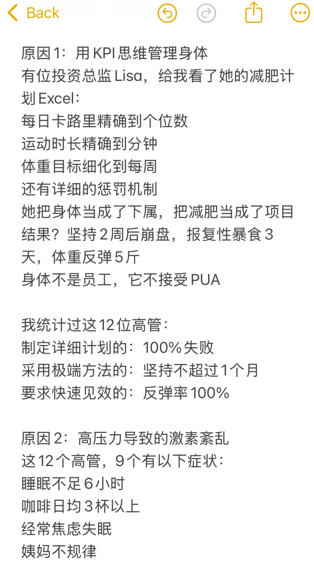 前年,我们团队接了一个特殊的企业团课,学员都是年薪60万以上的女高管\n12个人,10个BMI超标,8个尝试减肥超过5次,没有一个成功保持过\n \n最让我震惊的是\n她们每个人在减肥上的花费平均超过10万:私教、营养师、减肥营、医美、代餐……能试的都试了\n越成功的人,越容易在减肥上失败\n这不是巧合,是必然\n \n原因1:用KPI思维管理身体\n有位投资总监Lisa,给我看了她的减肥计划Excel:\n每日卡路里精确到个位数\n运动时长精确到分钟\n体重目标细化到每周\n还有详细的惩罚机制\n她把身体当成了下属,把减肥当成了项目\n结果?坚持2周后崩盘,报复性暴食3天,体重反弹5斤\n身体不是员工,它不接受PUA\n \n我统计过这12位高管:\n制定详细计划的:100%失败\n采用极端方法的:坚持不超过1个月\n要求快速见效的:反弹率100%\n \n原因2:高压力导致的激素紊乱\n这12个高管,9个有以下症状:\n睡眠不足6小时\n咖啡日均3杯以上\n经常焦虑失眠\n姨妈不规律\n \n我建议她们测激素水平,结果:\n皮质醇超标(压力激素)\n瘦素抵抗(控制饱腹感)\n胰岛素抵抗(易胖体质)\n在这种状态下,喝水都会胖,更别说减肥了\n \n原因3:完美主义的陷阱\nLisa跟我说过一句话:“要么不做,要做就要做到最好。”\n这种思维在事业上是优势,在减肥上是灾难:\n运动必须1小时(没时间就不做)\n饮食必须完美(破戒就放弃)\n效果必须明显(没效果就换方法)\n \n数据对比:\n要求完美的高管:平均坚持11天\n接受80分的普通人:平均坚持3个月\n真正适合她们的方法\n \n后来我给她们设计了”高管专属方案”:\n1.微习惯策略\n不要求运动1小时,先从5分钟开始\n不要求完美饮食,先从一餐开始改\n2.外包式管理\n请助理帮忙订健康餐\n司机接送时在车上做拉伸\n把运动约成商务会谈\n3.数据简化\n不每天称重,每周一次\n不算卡路里,只看饱腹感\n不求快,只求稳\n3个月后,12人中有7个人成功减重,平均减了8斤\n不多,但这是她们这些年第一次坚持超过3个月\n \n最扎心的真相\n高管减肥失败,不是因为不够自律,恰恰是因为太自律了\n她们习惯了高强度、快节奏、强控制,但身体需要的是温柔以待\n减肥不是一个需要攻克的项目,是一个需要呵护的过程\n \n如果你也是个事业成功但身材失控的人,记住:\n放下你的KPI思维,像对待恋人一样对待身体\n事业可以冲刺,身体需要细水长流\n#阿壮减脂