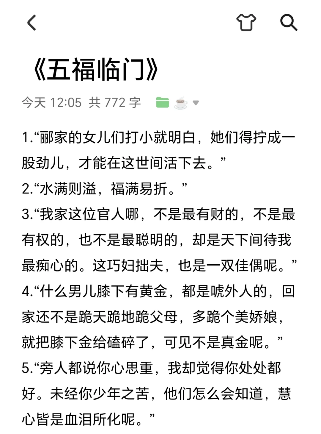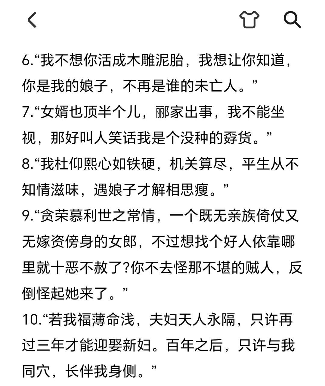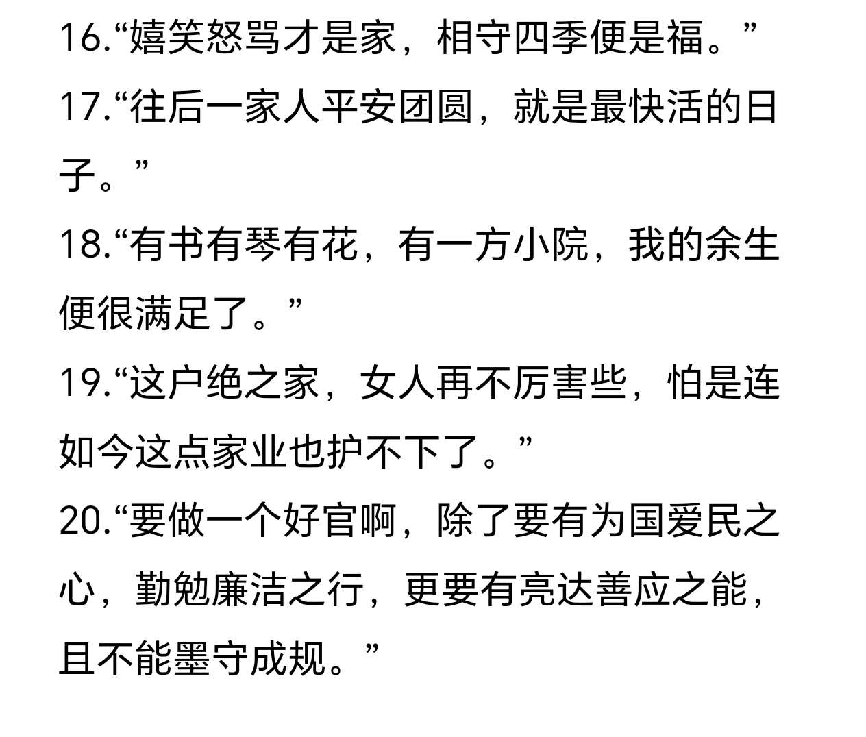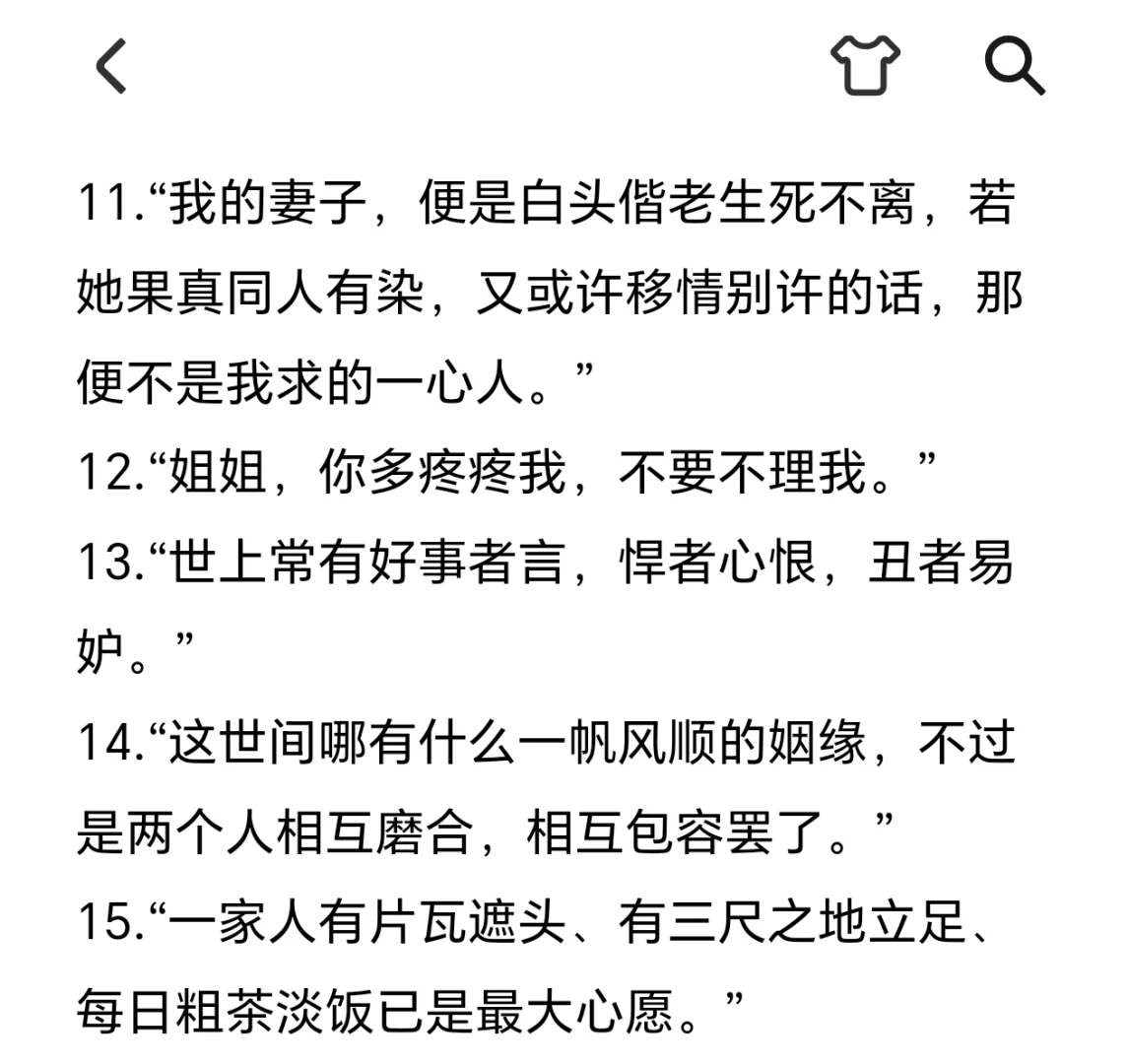 ✨“郦家的女儿们打小就明白,她们得拧成一股劲儿,才能在这世间活下去。”\n✨“水满则溢,福满易折。”\n✨“我家这位官人哪,不是最有财的,不是最有权的,也不是最聪明的,却是天下间待我最痴心的。这巧妇拙夫,也是一双佳偶呢。”\n✨“什么男儿膝下有黄金,都是唬外人的,回家还不是跪天跪地跪父母,多跪个美娇娘,就把膝下金给磕碎了,可见不是真金呢。”\n✨“旁人都说你心思重,我却觉得你处处都好。未经你少年之苦,他们怎么会知道,慧心皆是血泪所化呢。”\n✨“我不想你活成木雕泥胎,我想让你知道,你是我的娘子,不再是谁的未亡人。”\n✨“女婿也顶半个儿,郦家出事,我不能坐视,那好叫人笑话我是个没种的孬货。”\n✨“我杜仰熙心如铁硬,机关算尽,平生从不知情滋味,遇娘子才解相思瘦。”\n✨“贪荣慕利世之常情,一个既无亲族倚仗又无嫁资傍身的女郎,不过想找个好人依靠哪里就十恶不赦了?你不去怪那不堪的贼人,反倒怪起她来了。”\n✨“若我福薄命浅,夫妇天人永隔,只许再过三年才能迎娶新妇。百年之后,只许与我同穴,长伴我身侧。”\n✨“我的妻子,便是白头偕老生死不离,若她果真同人有染,又或许移情别许的话,那便不是我求的一心人。”\n✨“姐姐,你多疼疼我,不要不理我。”\n✨“世上常有好事者言,悍者心恨,丑者易妒。”\n✨“这世间哪有什么一帆风顺的姻缘,不过是两个人相互磨合,相互包容罢了。”\n✨“一家人有片瓦遮头、有三尺之地立足、每日粗茶淡饭已是最大心愿。”\n✨“嬉笑怒骂才是家,相守四季便是福。”\n✨“往后一家人平安团圆,就是最快活的日子。”\n✨“有书有琴有花,有一方小院,我的余生便很满足了。”\n✨“这户绝之家,女人再不厉害些,怕是连如今这点家业也护不下了。”\n✨“要做一个好官啊,除了要有为国爱民之心,勤勉廉洁之行,更要有亮达善应之能,且不能墨守成规。”\n🌷那就祝我们都自由逐风!\n#好句摘抄 #令人惊艳的句子 #经典台词 #福往者福来 #记录吧就现在 #五福临门 @热点薯 @生活薯 @薯条小助手 @薯队长 @小红书成长笔记 @知识薯