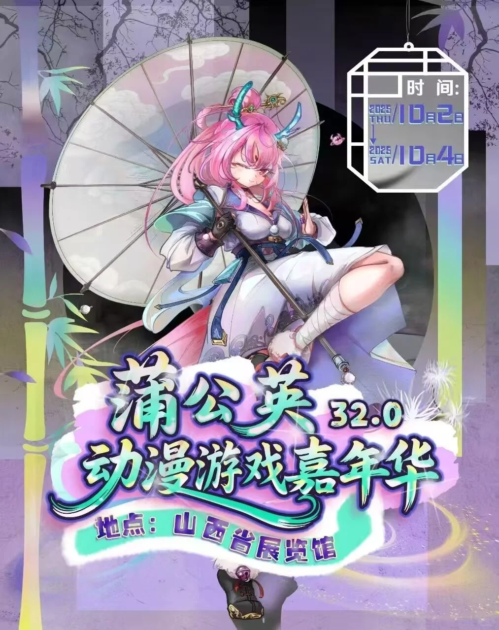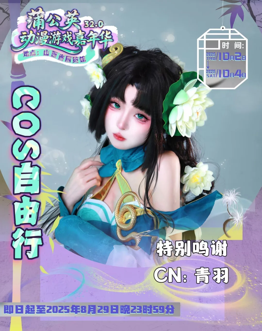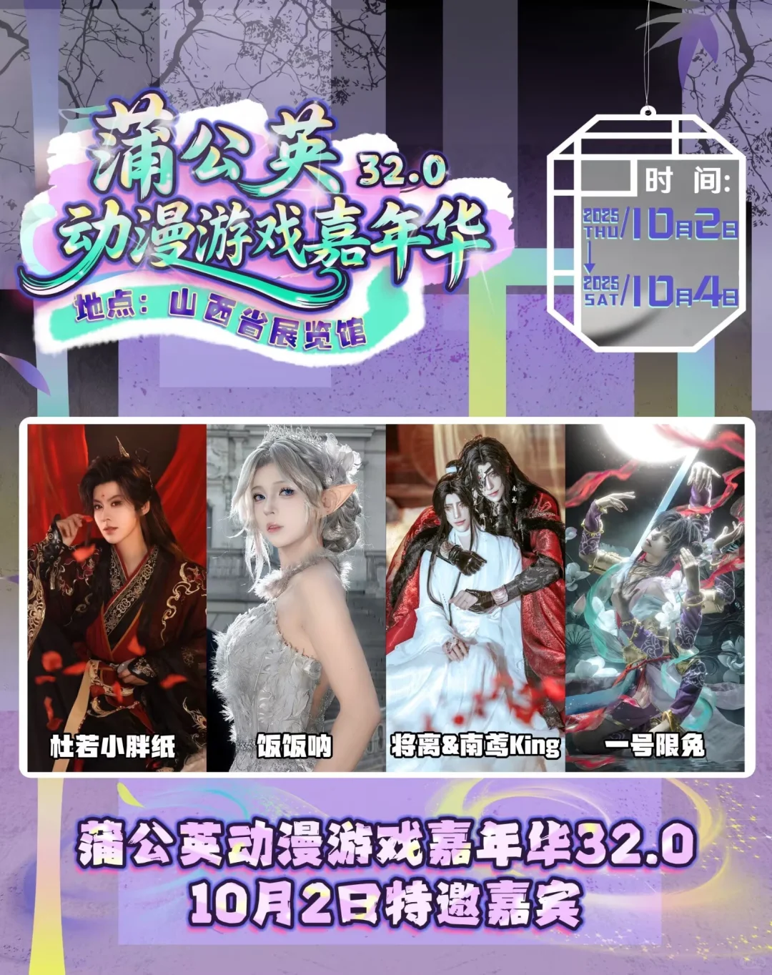 “祝愿蒲公英越办越好!!这次下次下下次也要来玩!!!!!”\n10月2日至10月4日蒲公英动漫游戏嘉年华32.0我们不见不散~\n展会时间:2025年10月2日——10月4日\n展会地点:山西(太原)『山西省展览馆』\n申请自由行类型:COSER\nCN:子杳\n申请时间及角色:10.2韩吉 10.3神代利世 10.4木之本樱\n
