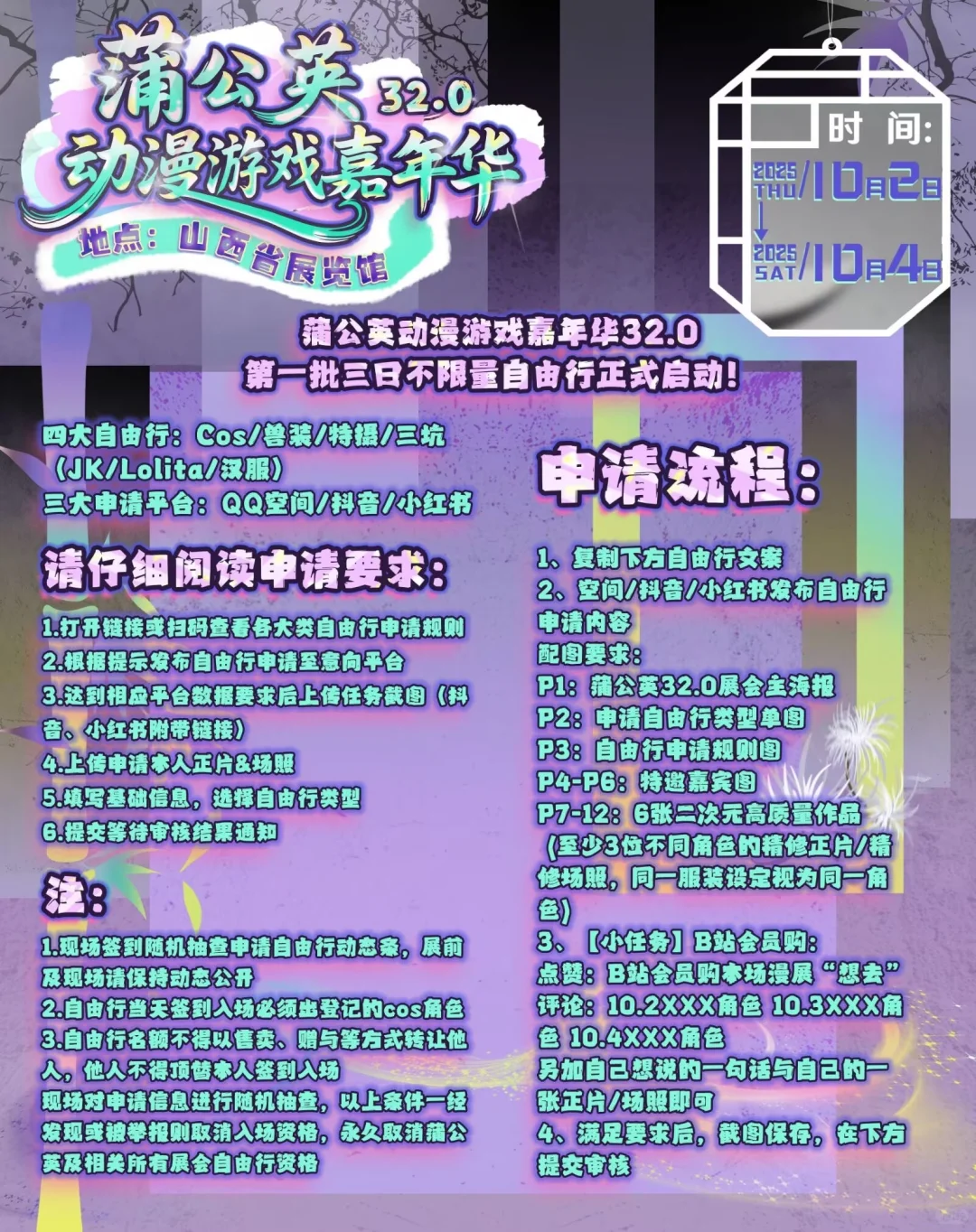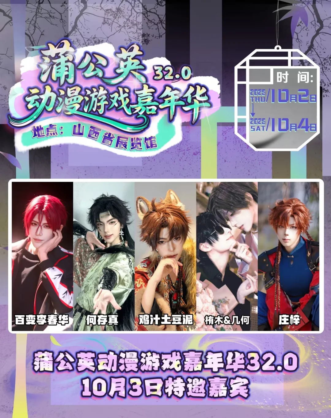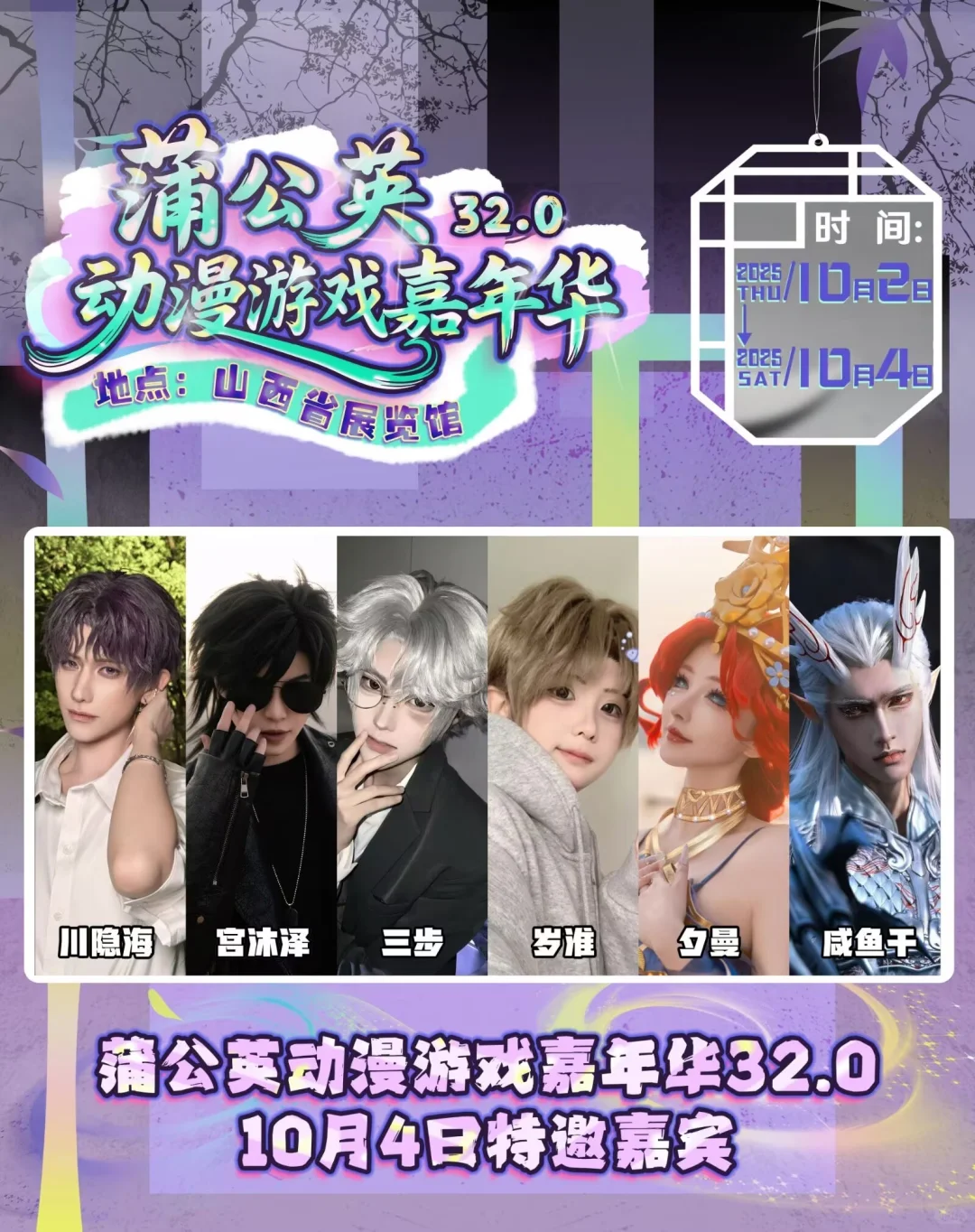 “祝愿蒲公英越办越好!!这次下次下下次也要来玩!!!!!”\n10月2日至10月4日蒲公英动漫游戏嘉年华32.0我们不见不散~\n展会时间:2025年10月2日——10月4日\n展会地点:山西(太原)『山西省展览馆』\n申请自由行类型:COSER\nCN:子杳\n申请时间及角色:10.2韩吉 10.3神代利世 10.4木之本樱\n