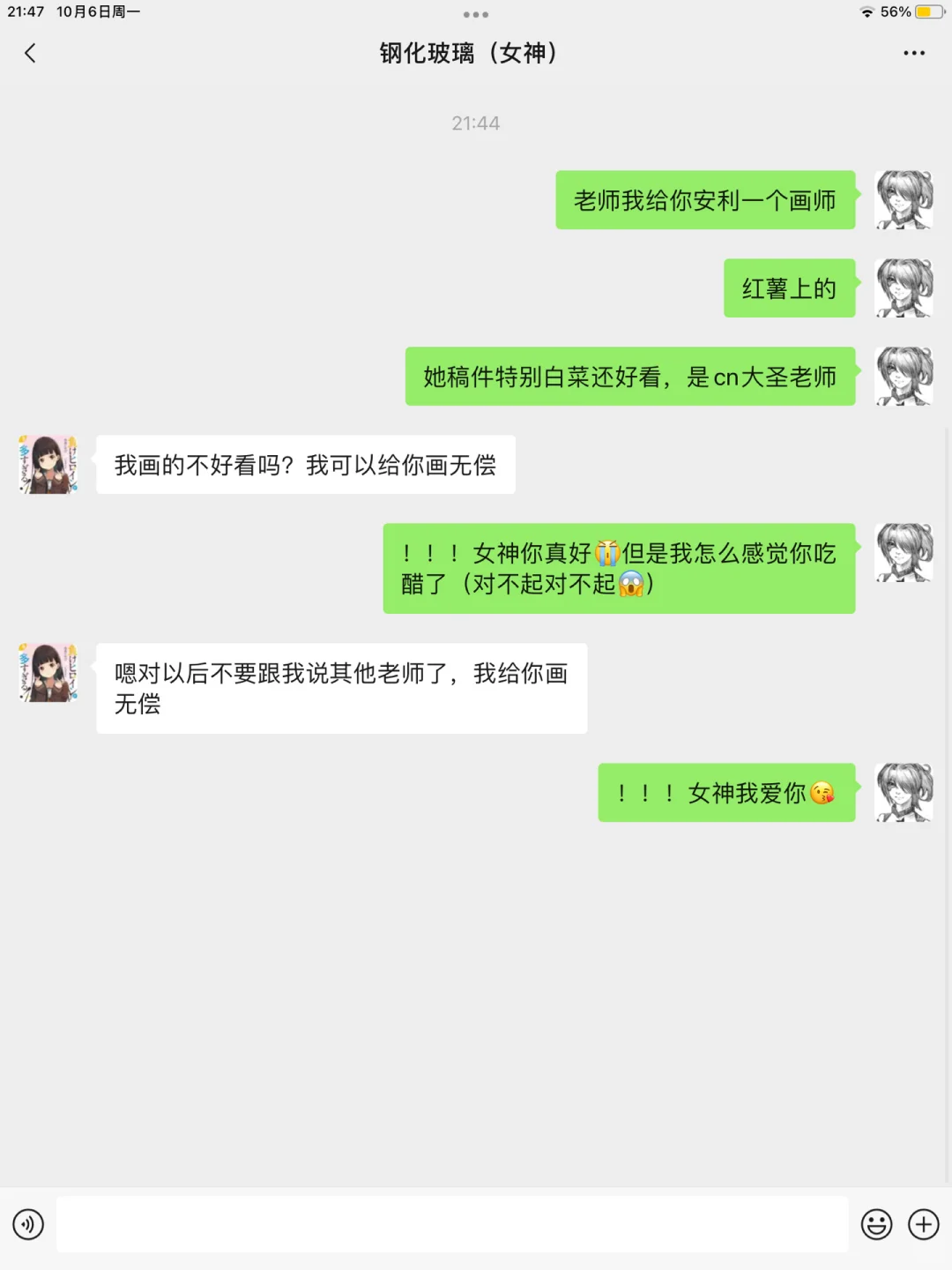 本来我给女神安利画师来着,女神突然就生气了,然后打电话真实我了😭。。女神说除了她以外不许有别的女神。。。明天女神说要和我出去面基,希望我能活着回来 二编:发现和女神是同城出去面基了,女神请我喝星巴克,我差点跪下了。。我给女神买了她推的谷子,女神反手给我画了无偿😎 三编:顺利和女神处成亲友并拍了小尬剧😎 (教程已出)