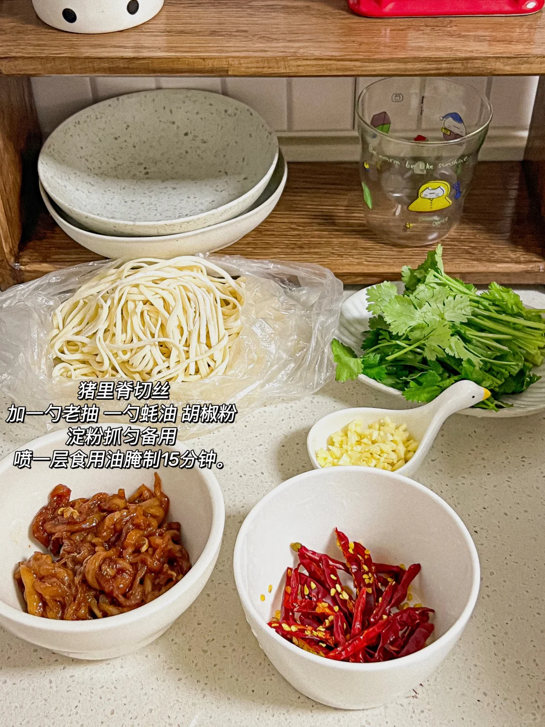 ︎︎• ◡•𝕪𝕖𝕖𝕖每道菜图片都有教程哦🔍\n \n🥢【香辣肉丝拌面】\n1⃣️猪里脊切丝,加一勺老抽 一勺蚝油 胡椒粉 淀粉抓匀备用 、喷一层食用油腌制15分钟。油热倒入肉丝炒变色盛出,留底油放入姜蒜末炒香、倒入干辣椒丝煸炒,再放肉丝加适量老抽、蚝油 炒香加一把香菜炒匀即可。\n2⃣️面碗里放葱花 蒜末 白芝麻 辣椒面、淋上热油再放一勺生抽 少许陈醋 花椒面 香油 一坨猪油 一勺辣椒油 。料碗里盛适量面汤、放煮好的面条再放炒好的肉丝盛碗里拌匀。\n \nฅ•·̫•̳ 家常菜真的吃不腻🍛\n一个人也要好好吃饭哦❣️\n \n#今天晚餐长这样 #小红书爆款美食 #一人食吃什么 #一人居一人食 #拌面 #面条的花样吃法 #一个人也要好好吃饭 #超级下饭的家常菜 #宅家美食日记 #香辣肉丝