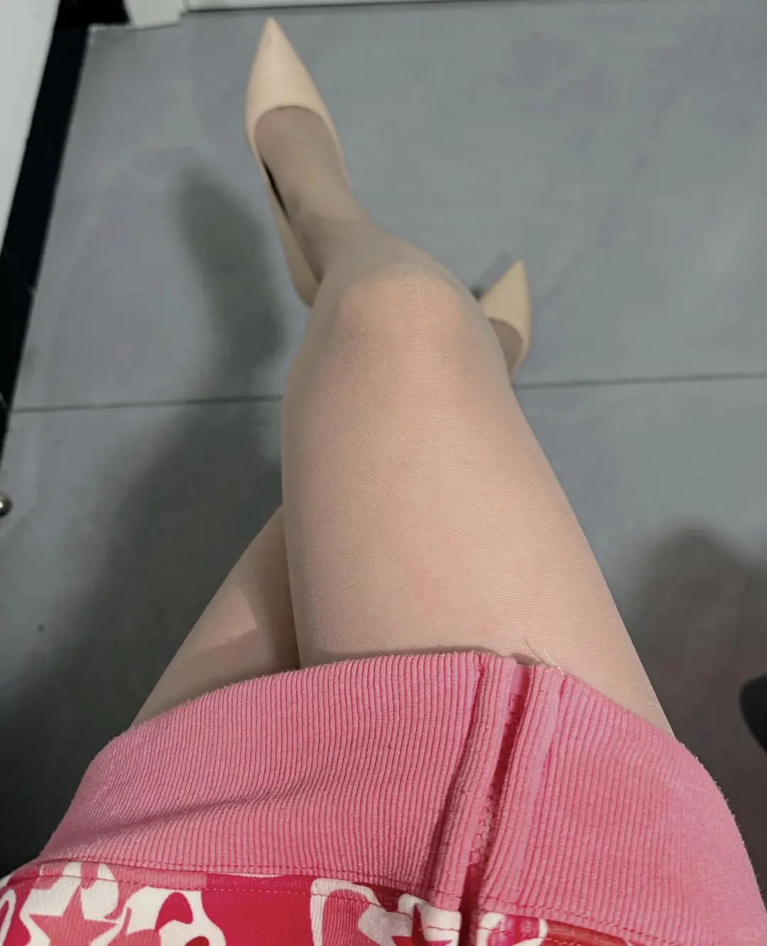 ootd粉色卫衣裙+肉丝+米色高跟鞋