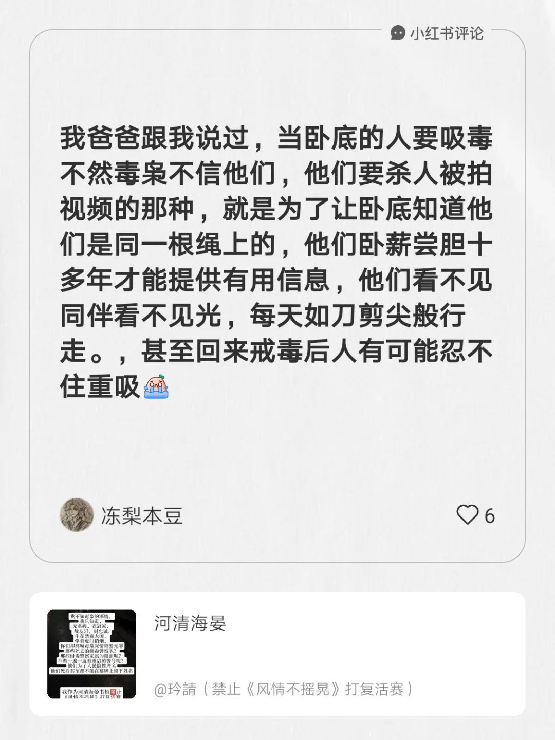 我爸爸跟我说过,当卧底的人要吸毒不然毒枭不信他们,他们要杀人,被拍视频录下证据的那种,就是为了让卧底知道他们是同一根绳上的,他们卧薪尝胆十多年才能提供有用信息,因为十多年才足以让一个嗜血的毒贩放下那么一点戒备心。他们看不见同伴,也看不见光,每天如刀剪尖般行走。甚至回来戒毒后人有可能忍不住重吸