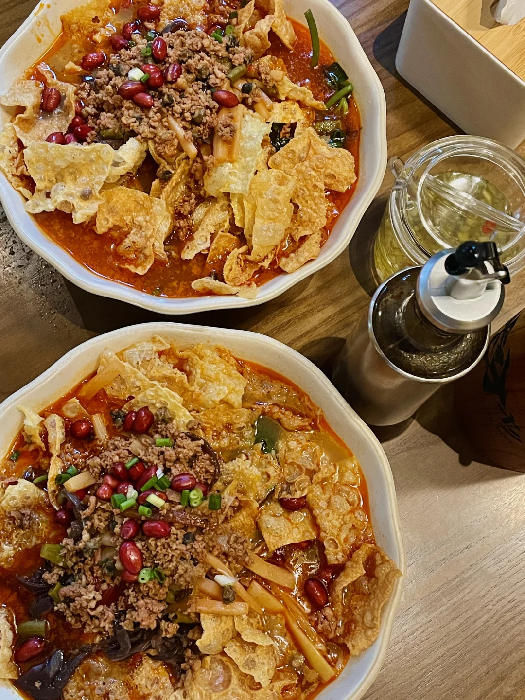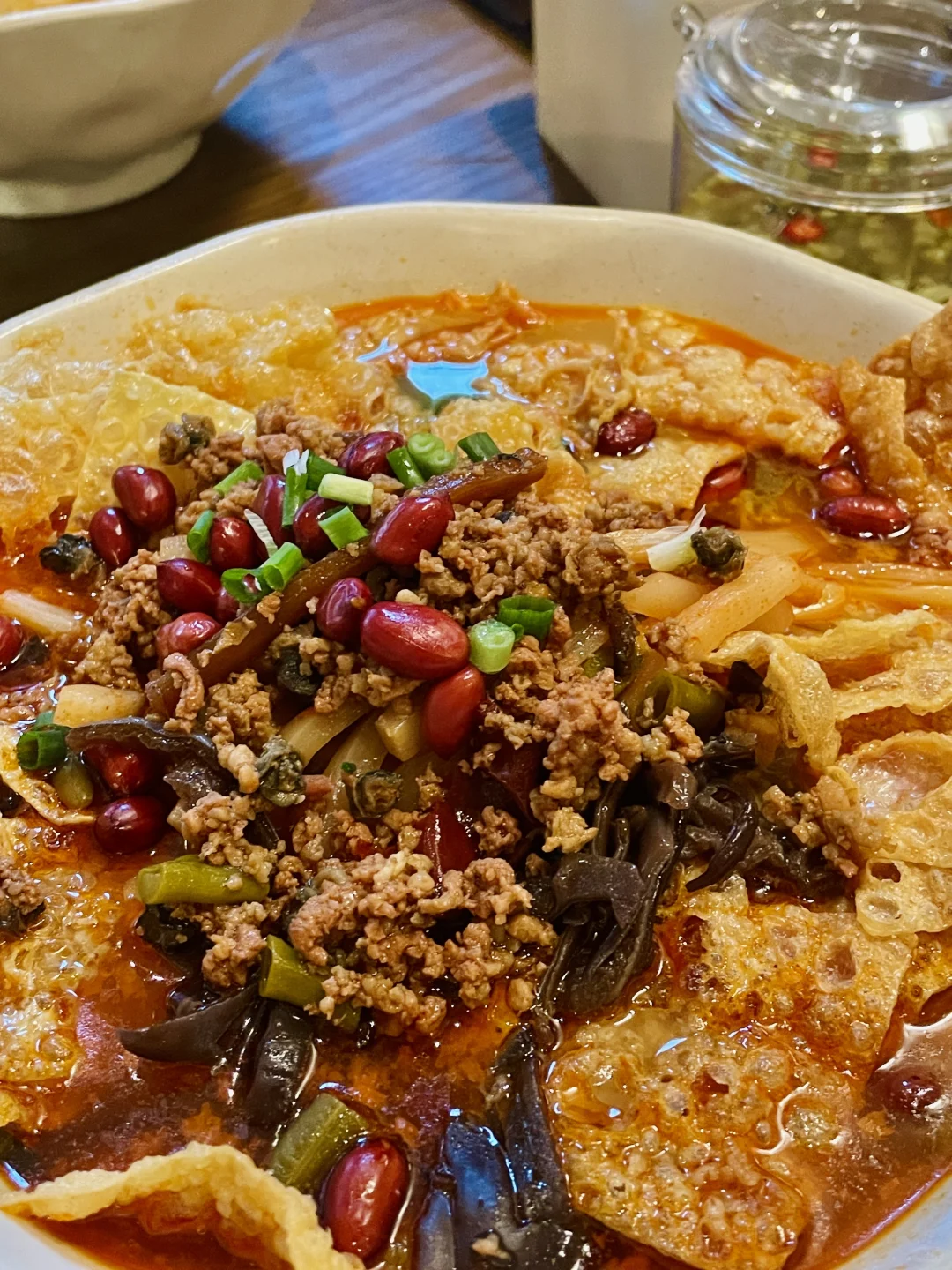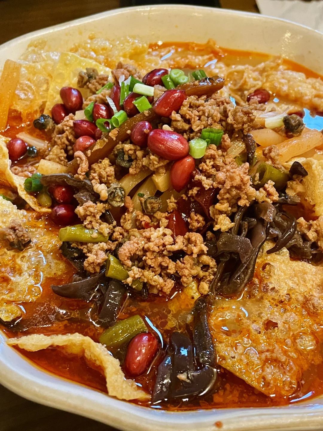 没有科技!放心吃!每天现熬的汤底老母鸡、大骨头,金黄酥脆的炸腐竹,颗颗饱满的红花生点缀其间,翠绿葱花、深褐木耳、嫩肉末层层叠叠,光看这色泽,就足以让味蕾疯狂尖叫!