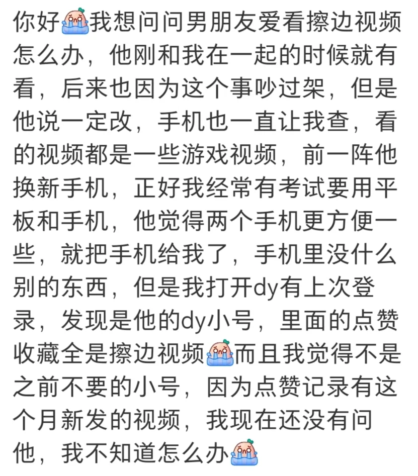 我想问问男朋友爱看擦边视频怎么办,他刚和我在一起的时候就有看,后来也因为这个事吵过架,但是他说一定改,手机也一直让我查......