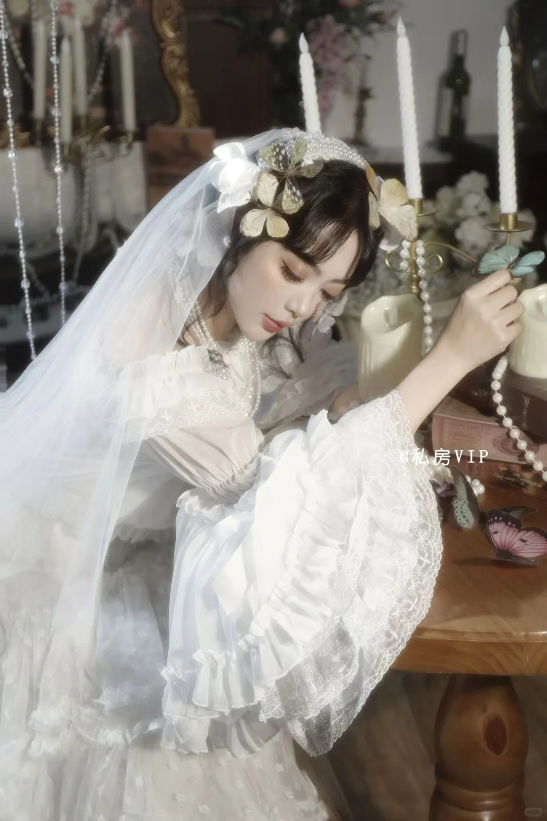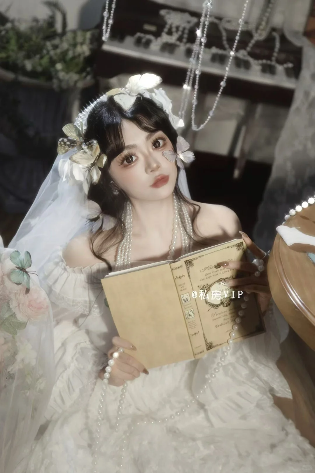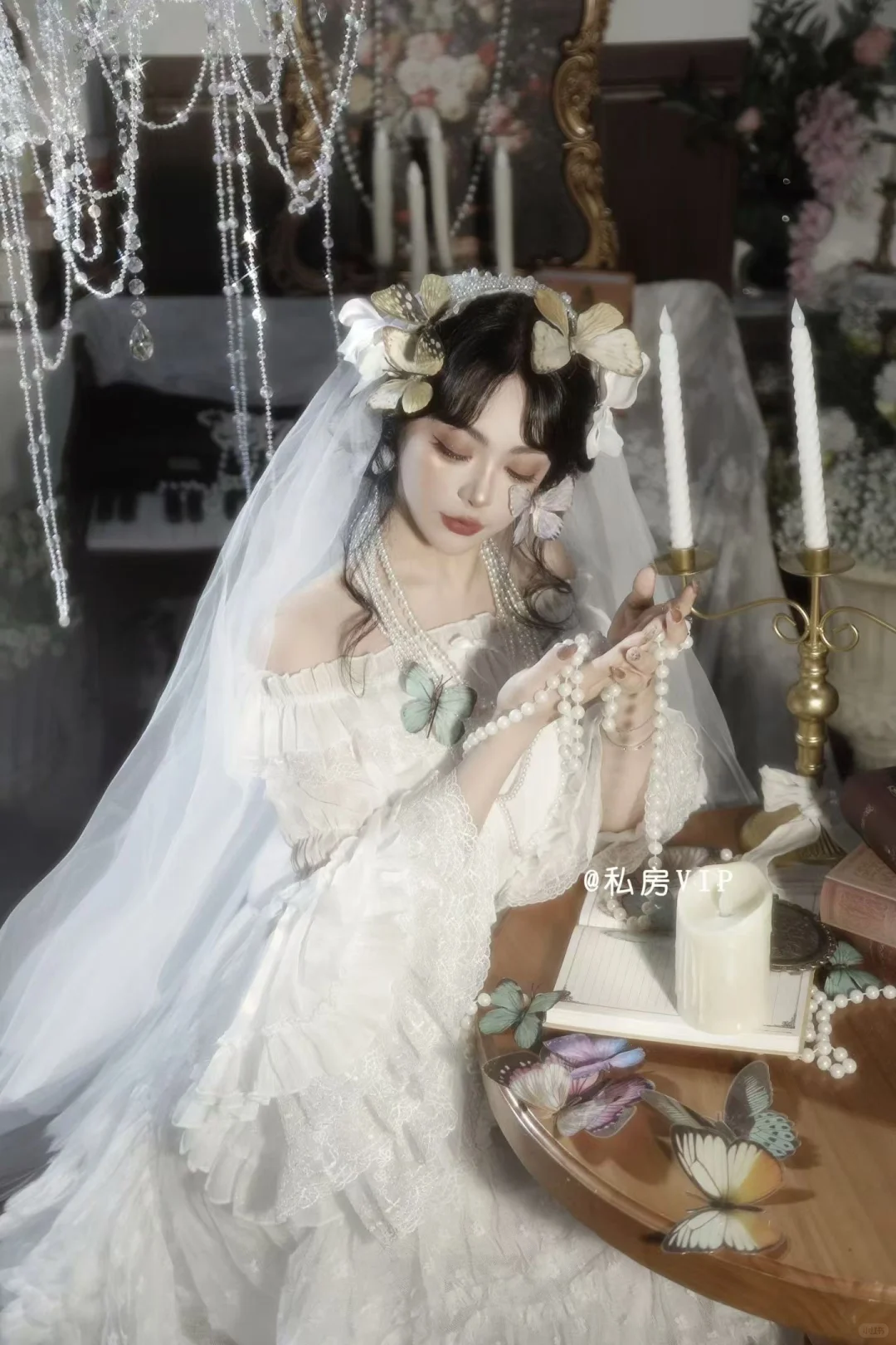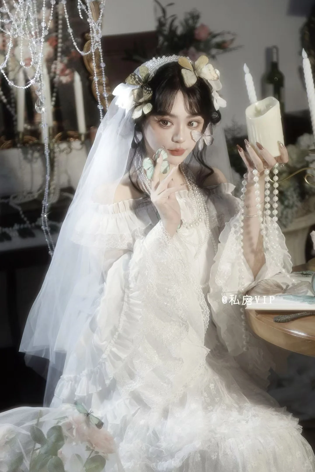 头上是立体蝴蝶与白花交织的发饰,脸上还“落”了只仙气蝴蝶,多层珍珠项链叠戴,再配上轻透头纱,一整个中世纪贵族少女既视感~衣服是满是蕾丝的一字肩裙,蓬松的裙摆和袖口把浪漫感拉满,举手投足间都是精致。