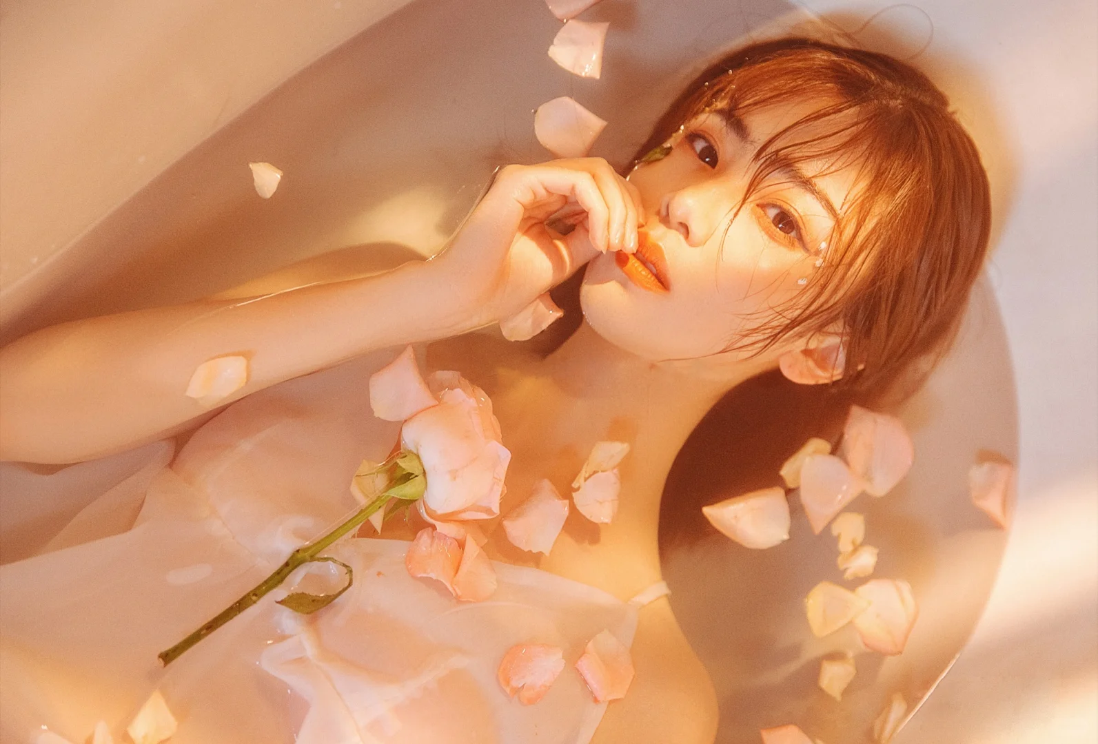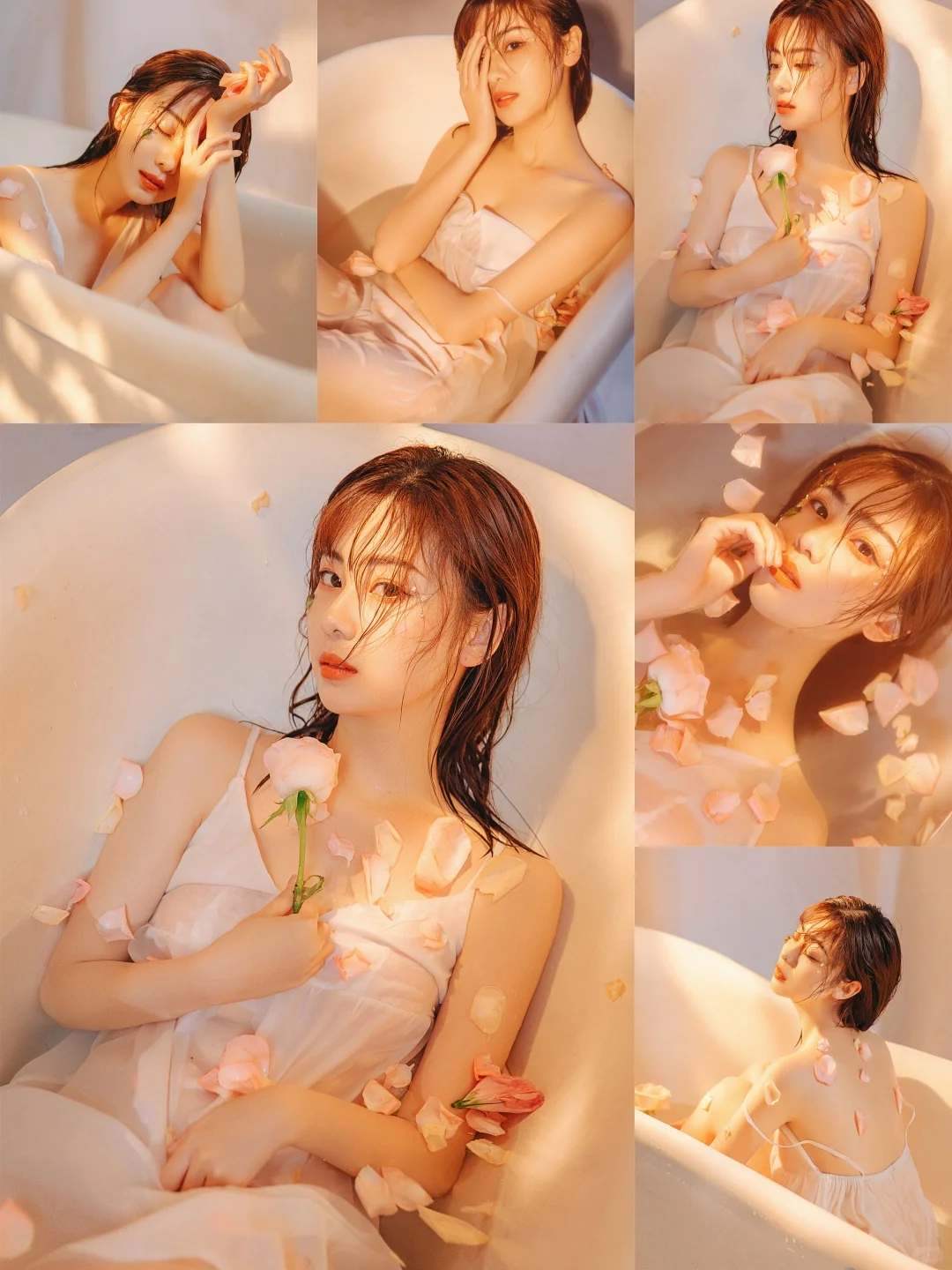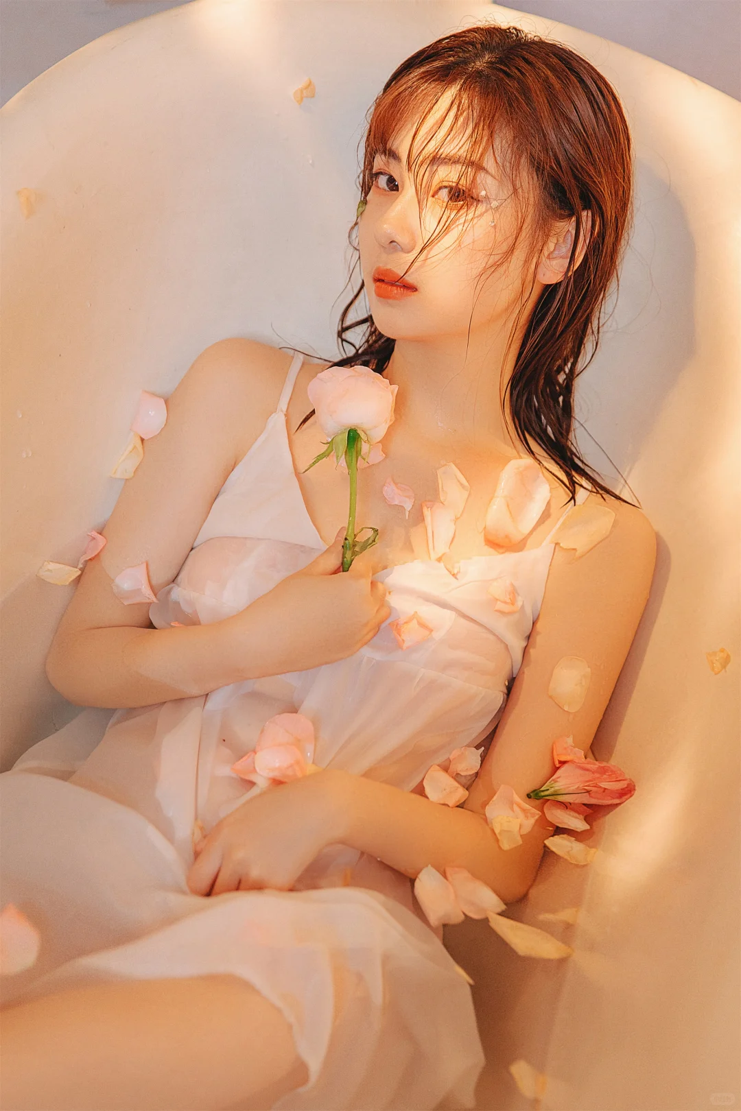 暖光漫过白瓷浴缸,粉瓣落在肩头时,纱裙也浸着朦胧