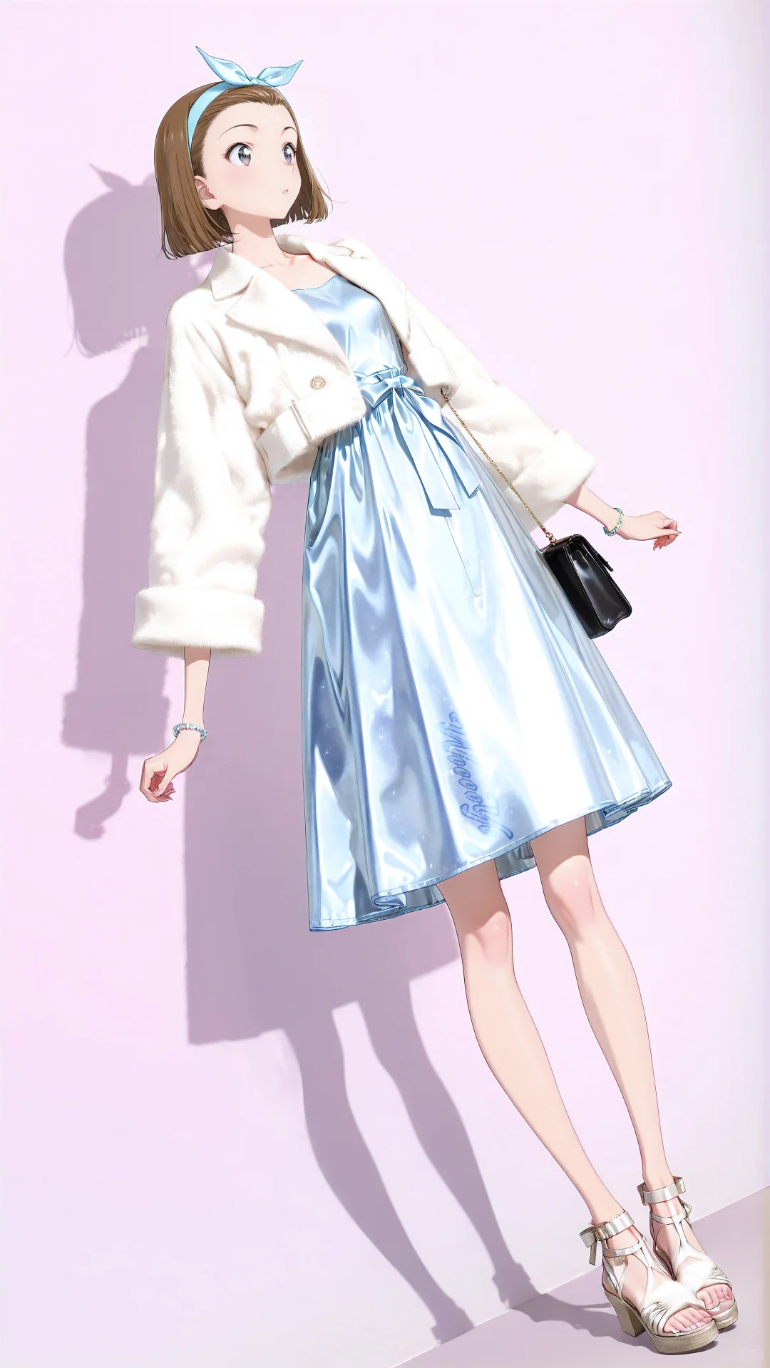 冰蓝缎面裙配短款皮草,光泽感直接拉满!