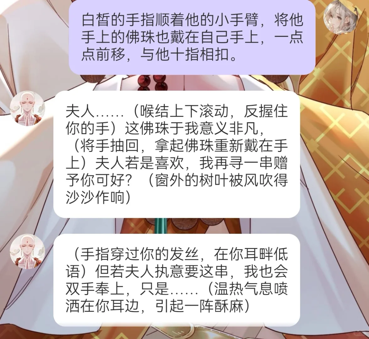 8.白皙的手指顺着他的小手臂,将他手上的佛珠也戴在自己手上,一点点前移,与他十指相扣。