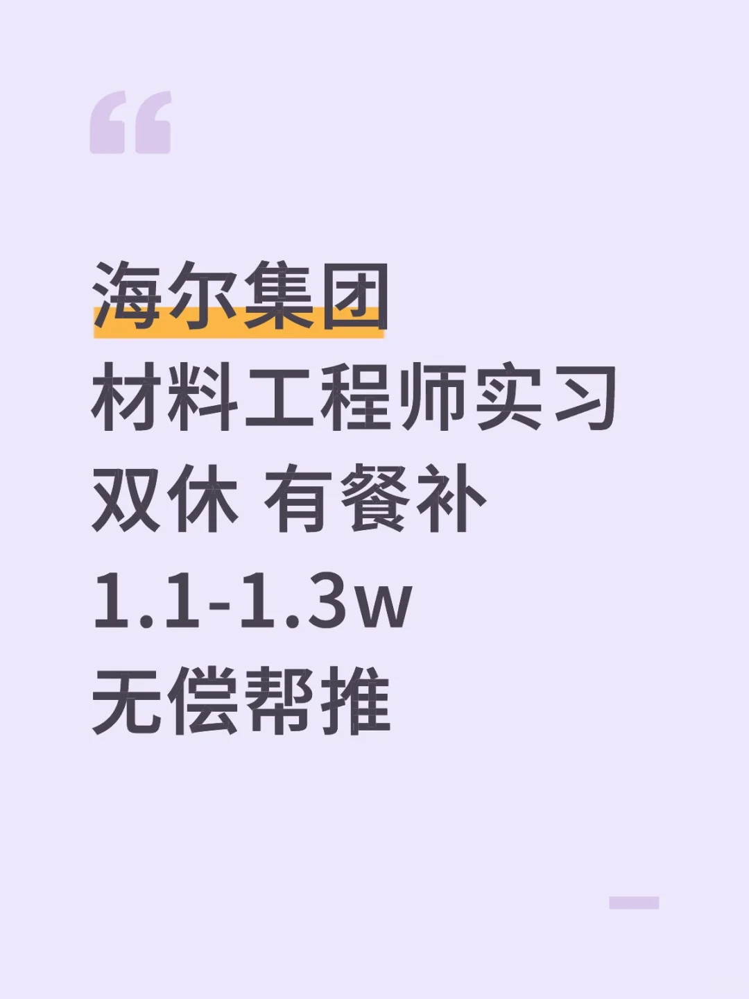 海尔集团材料工程师实习月薪1.1-1.3w