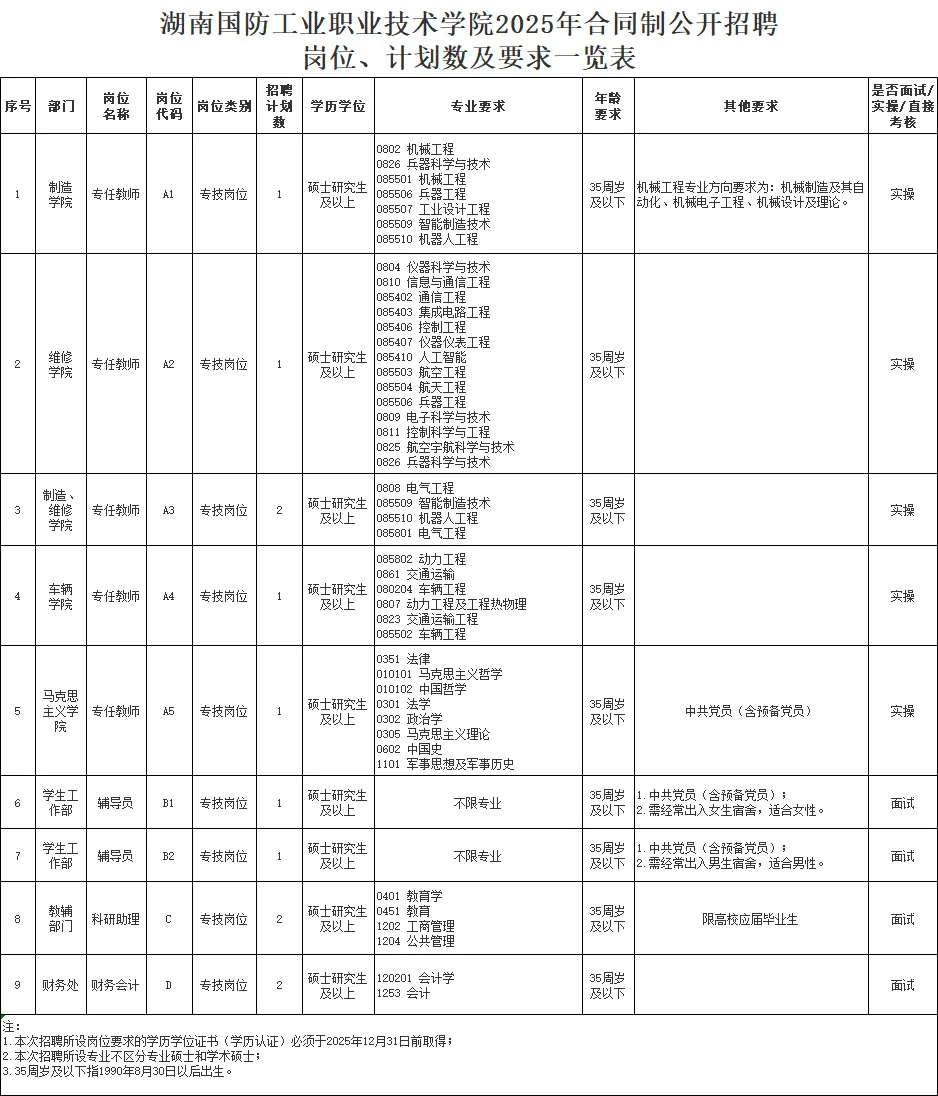 湖南国防工业职业技术学院公开招聘(岗位表)
