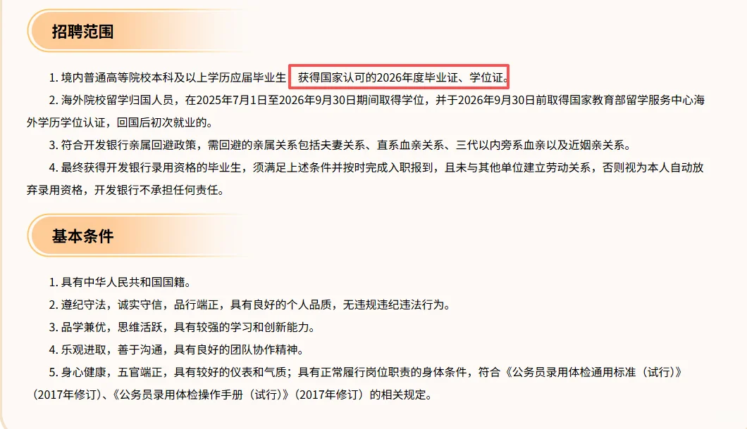 ⏰报名时间为2025年9月12日24点-10月10日24点(北京时间),统一采取网上报名方式,不接受其他形式的报名\n⚠️应聘者可选报总行、分行、子公司中的1-2家单位,所报单位中可选报1-2个岗位,并选择是否接受岗位调剂。申请岗位顺序即为志愿顺序,将作为后续简历筛选的重要参考【图六—图七】\n🖋笔试将于2025年11月初开展,考试形式为线下集中机考,具体安排请关注后续通知,应聘者在简历系统中选择的笔试地点为线下集中机考考试地点。【笔试题型图二】\n三类岗位【图三—图五】\n产业投融类\n⚠️硕士研究生及以上学历;\n能源、电力、通信、交通、机械、工程、材料、土木、水利、船舶、城乡规划、集成电路、电子。信息、软件工程、计算机、人工智能、环境、数学、化工、生物与医药等相关专业毕业并获得相应毕业证和学位证,具有经济、金融类复合背景或具备科技创新基础研究工作经验者优先;\n经济金融类\n⚠️硕士研究生及以上学历;\n理论经济学、应用经济学、统计学、金融、应用统计、工商管理、管理科学与工程、资产评估、数字经济等相关专业毕业并获得相应毕业证和学位证,数理功底扎实。\n财会审计类\n⚠️大学本科及以上学历;【可以有】\n会计、财务管理、审计、工商管理(以会计学和财务管理为主)等相关专业毕业并获得相应毕业证和学位证,具有计算机、行业类复合背景或者取得CIA、CPA等资格认证者优先;\n薪资待遇(网络版)\n总行:硕士应届生首年16 - 17W,转正后约24W,随职级上升还会涨;博士首年20W左右,转正27W左右,直接定主任科员。\n分行:薪酬与当地经济挂钩,发达地区(如北上深)硕士转正20W左右,中西部也有16 - 17W ,基本薪资+津贴+绩效+年终奖,福利满满。\n🎯面试攻略\n各省分行自主面试,先30分钟心理测试(不计分)。\n无领导小组:围绕业务场景选项排序并阐述理由,小组讨论出实施方案;\n半结构化面试:5考官,1分钟自我介绍,6分钟答题含思考时间,合理安排。\n#国家开发银行 #国家开发银行招聘 #字要天天见 #2026校招季 #校招提效赛博宝典 #国企秋招 #秋招 #校招 #校招秋招 #国开行校招