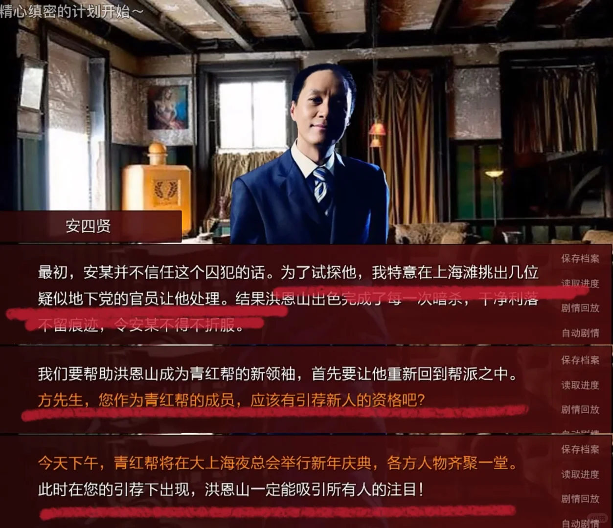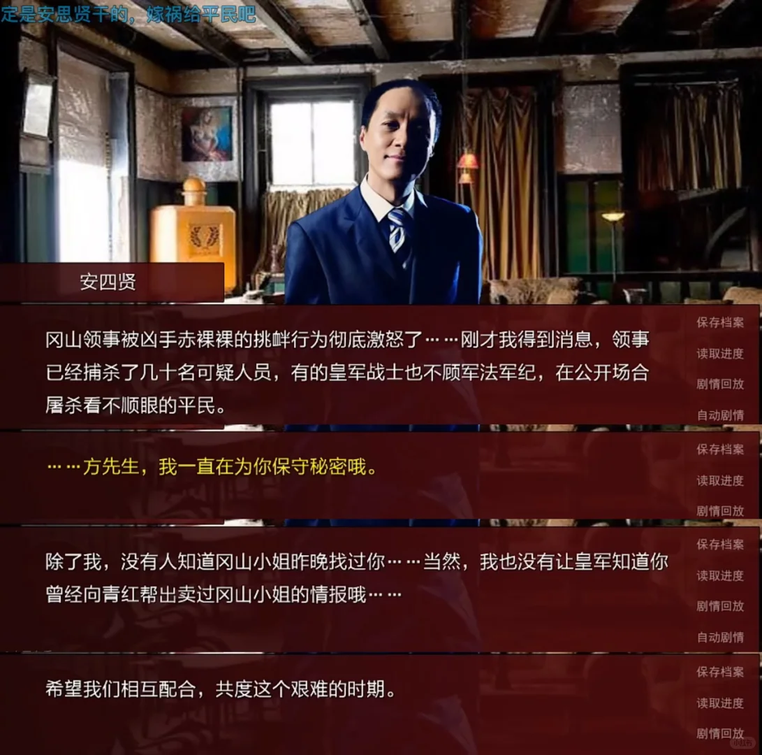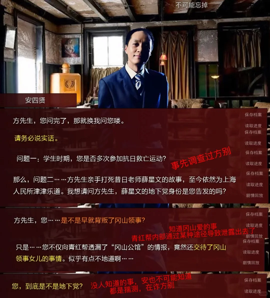 玩家操控主角通过存读档有多上帝视角能够游走在多方之间,安四贤在主角眼里就同样深不可测。只能通过他的提问,还有一些对话间的草蛇灰线来反过来猜测他知道了什么,他是怎么知道的,给他泄密的人是谁。