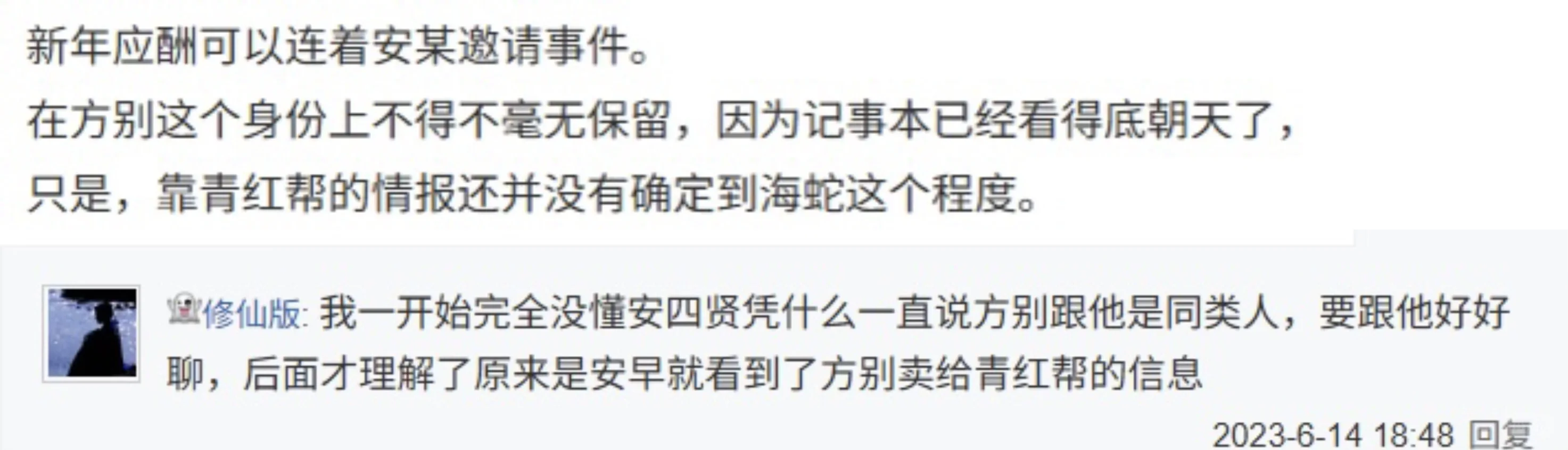 通过他的提问主角能反过来推测安四贤知道的: