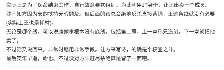 这也是我更喜欢汉奸线的理由之一,除了主角在这条线上闪烁着光芒外,这条线的智斗也是最难最复杂的。各种伏笔层层嵌套,破局过程环环相扣。这章是范特西严密逻辑思维的体现。隐守后面赶工期,这里没还原很可惜。