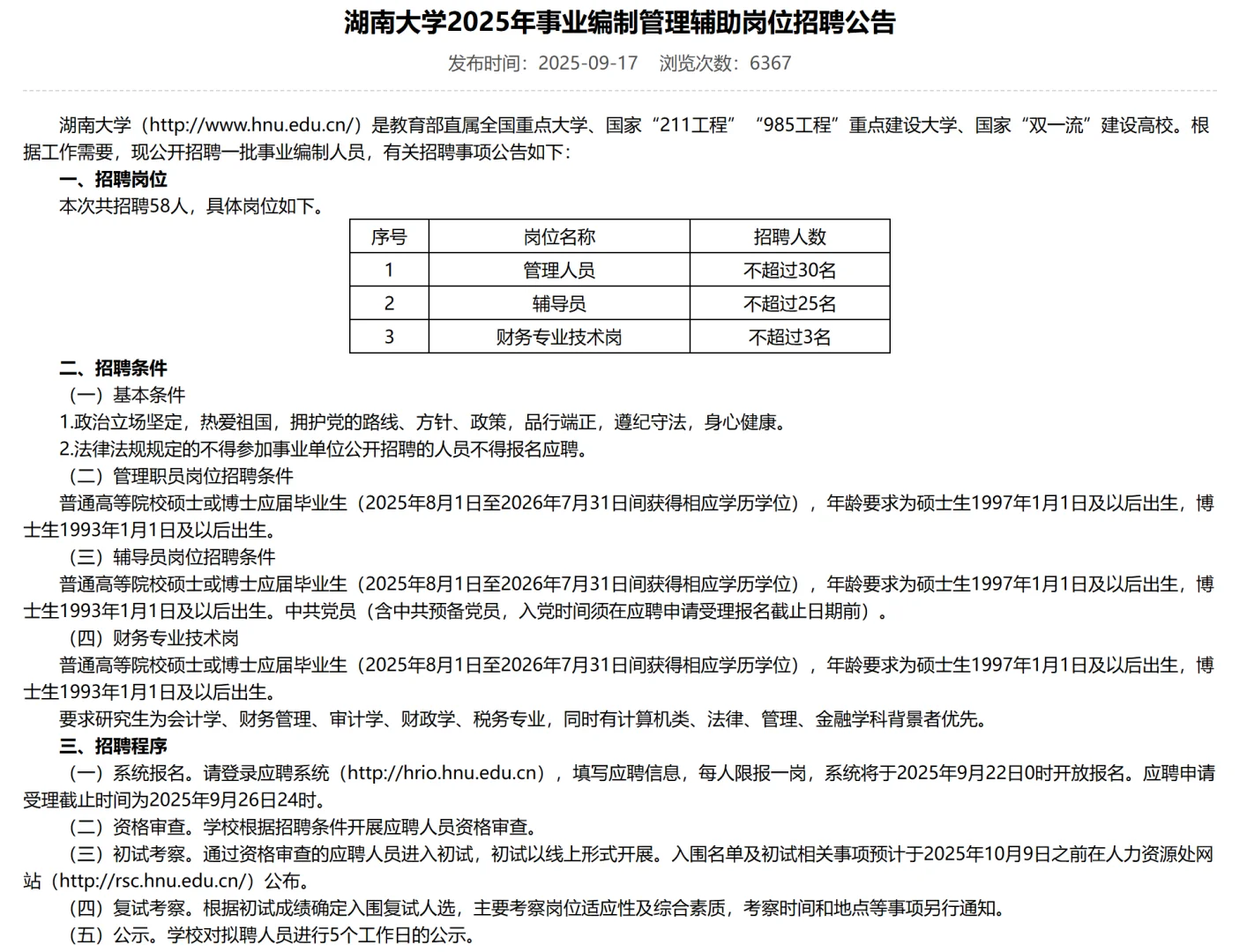 招聘58人,挺多的,大家可以冲下,待遇肯定不差,当时毕业那年没有关注到\n \n(二)管理职员岗位招聘条件\n普通高等院校硕士或博士应届毕业生(2025年8月1日至2026年7月31日间获得相应学历学位),年龄要求为硕士生1997年1月1日及以后出生,博士生1993年1月1日及以后出生。\n(三)辅导员岗位招聘条件\n普通高等院校硕士或博士应届毕业生(2025年8月1日至2026年7月31日间获得相应学历学位),年龄要求为硕士生1997年1月1日及以后出生,博士生1993年1月1日及以后出生。中共党员(含中共预备党员,入党时间须在应聘申请受理报名截止日期前)。\n(四)财务专业技术岗\n普通高等院校硕士或博士应届毕业生(2025年8月1日至2026年7月31日间获得相应学历学位),年龄要求为硕士生1997年1月1日及以后出生,博士生1993年1月1日及以后出生。\n要求研究生为会计学、财务管理、审计学、财政学、税务专业,同时有计算机类、法律、管理、金融学科背景者优先。\n三、招聘程序\n(一)系统报名。请登录应聘系统(http://hrio.hnu.edu.cn),填写应聘信息,每人限报一岗,系统将于2025年9月22日0时开放报名。应聘申请受理截止时间为2025年9月26日24时。\n(二)资格审查。学校根据招聘条件开展应聘人员资格审查。\n(三)初试考察。通过资格审查的应聘人员进入初试,初试以线上形式开展。入围名单及初试相关事项预计于2025年10月9日之前在人力资源处网站(http://rsc.hnu.edu.cn/)公布。\n(四)复试考察。根据初试成绩确定入围复试人选,主要考察岗位适应性及综合素质,考察时间和地点等事项另行通知。\n(五)公示。学校对拟聘人员进行5个工作日的公示。\n(六)政审及体检。拟聘人员政审通过、体检合格方可办理入职。\n#辅导员 #湖南辅导员 #湖南高校