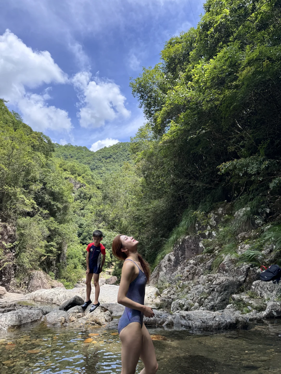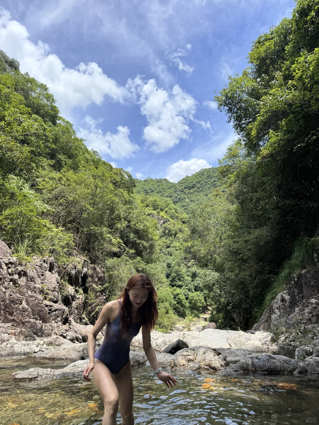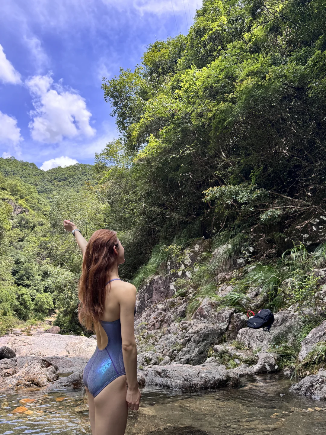 谁啊 穿竞速泳衣去山里溯溪