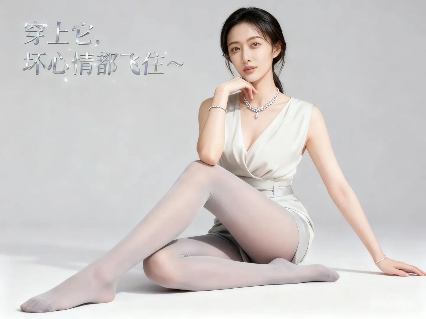 米白色缎面连体裤 + 浅灰丝袜 + 银色单鞋