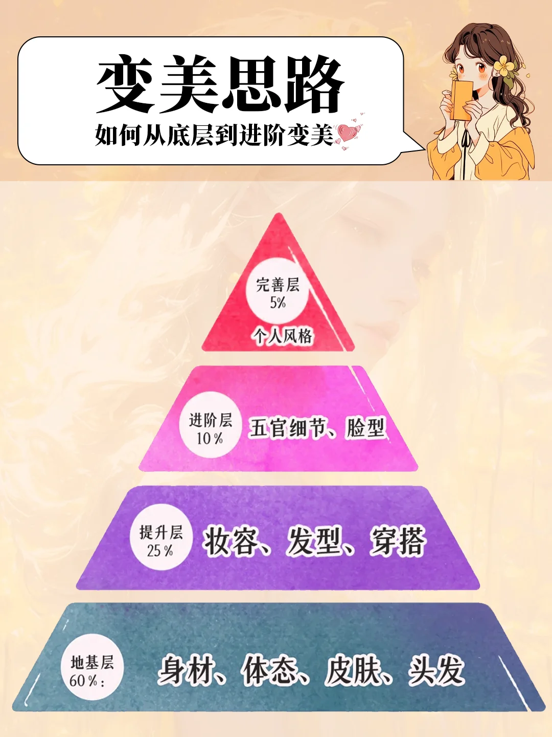 姐妹们!变美不是一蹴而就的,而是一个循序渐进的过程。今天给大家分享一个超实用的“变美金字塔”,帮你从底层到进阶一步步逆袭,轻松拿捏颜值密码!