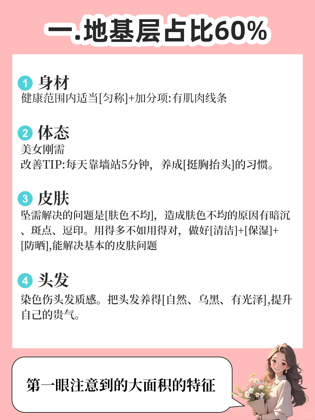 1️⃣ 地基层(60%):身材、体态、皮肤、头发