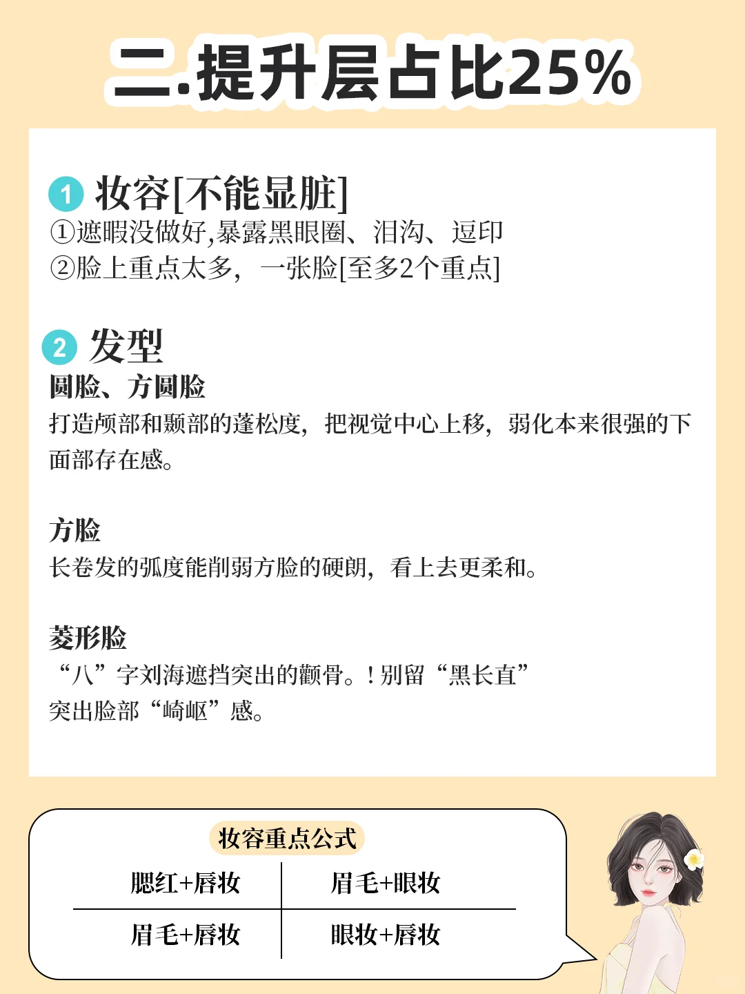 2️⃣ 提升层(25%):妆容、发型、穿搭