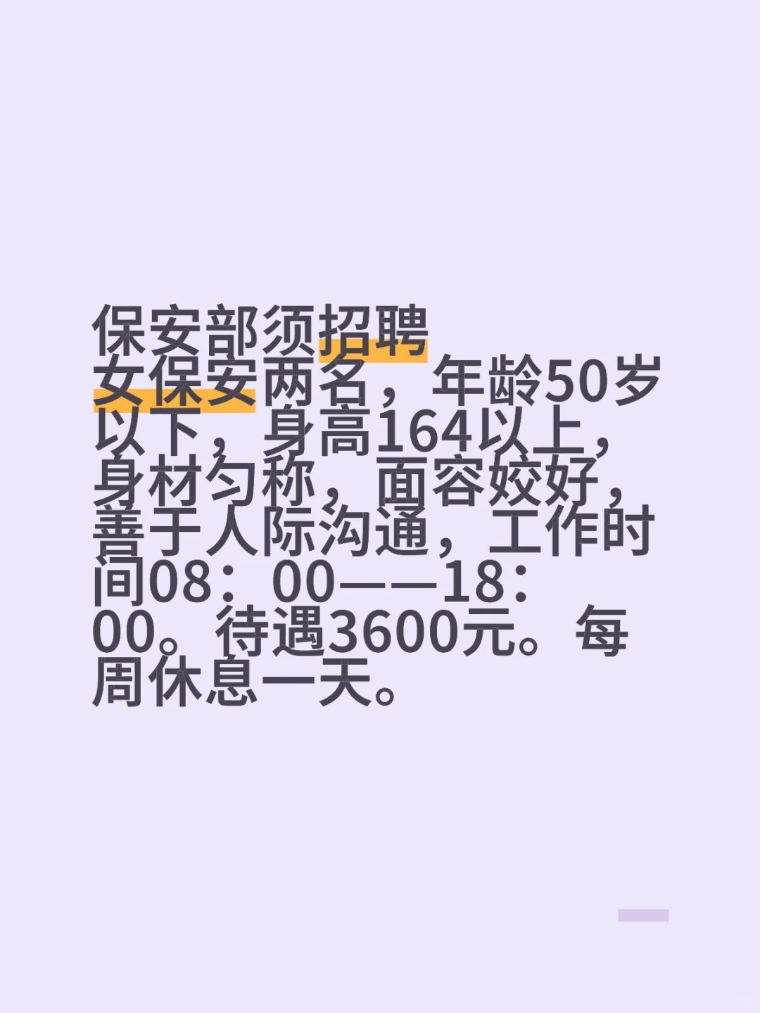 保安部须招聘 女保安两名,年龄50岁以下,身高164以上,身材匀称,面容姣好,善于人际沟通,工作时间08:00——18:00。待遇3600元。每周休息一天。