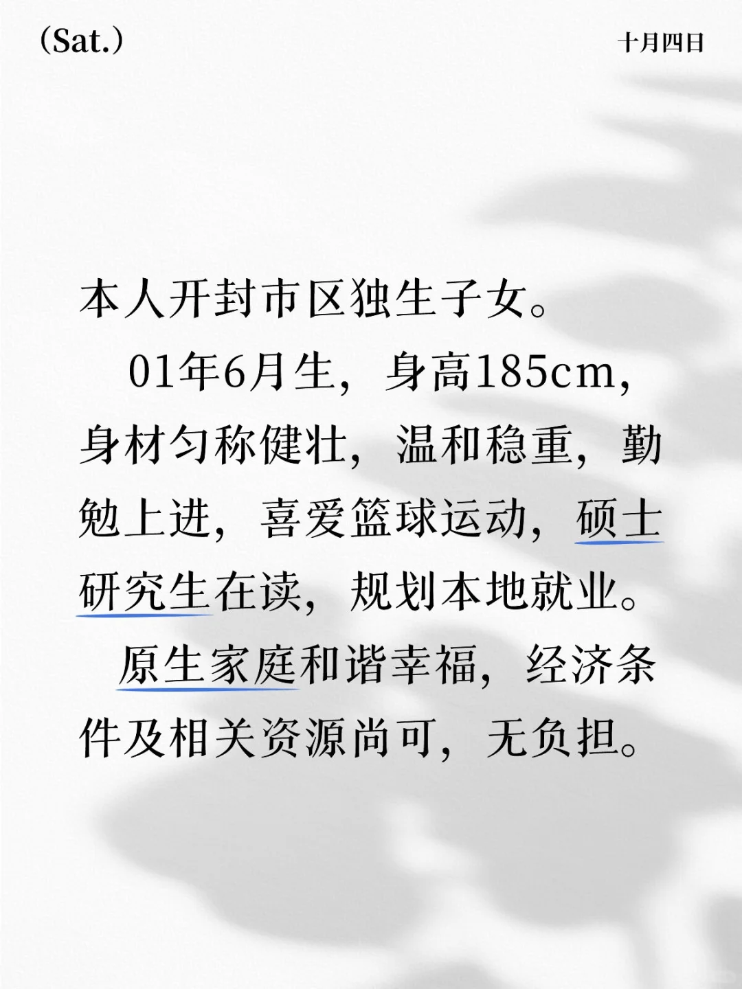 本人开封市区独生子女。 01年6月生,身高185cm,身材匀称健壮,温和稳重,勤勉上进,喜爱篮球运动,硕士研究生在读,规划本地就业。 原生家庭和谐幸福,经济条件及相关资源尚可,无负担。