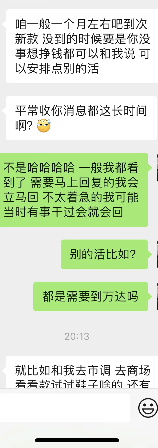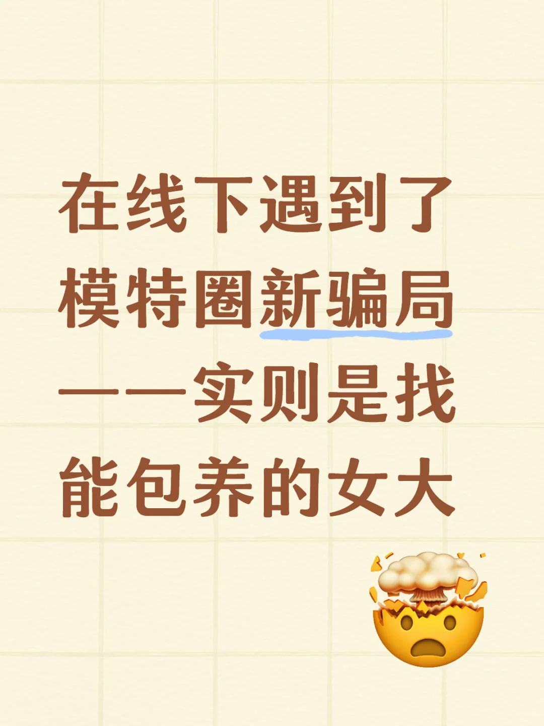 在线下遇到了模特圈新骗局——实则是找能包养的女大\n如题,周末我弄完头发后去万达吃饭,坐扶梯上到三楼的时候被一个中年男人拦住,问我身高多少,夸我穿搭不错,讲他们品牌的鞋子一个月或半个月上一次新货,到时候需要去拍图,问我有没有兴趣,之前有没有当过模特\n当天我纯素颜,穿个大拖鞋,我以为我被发掘了呢(本人170 52 偶尔健身 之前有尝试往模特方面发展)我当时挺疑惑为啥找模特这么随便,但我一想可能是本地不太出名的牌子,线下找直接能看到本人的条件比较靠谱一点 再加上这是毕业季不久之后,我以为上个和合作的学姐毕业了才急匆匆地出来找下一个可以合作的……对我就这样给自己洗了脑,觉得当个超野生的模也不错,一点点地了解这一行\n然后他就问了我个人情况,家在这边吗?什么专业?以后在哪发展?实习情况如何?特别注重问了我轮班和休息的时间\n到了这里我也没觉得奇怪,应该是在考量我能不能长期用,然后他留了我的电话,也没加我微信,我也没觉得啥,可能我只是他众多选择之一,不一定最后选的就是我,后来我着急吃饭没交流太多就上楼了\n晚上他搜我手机号加了我微信,我就把我轮班表发给他了,想问得更加仔细一点(图2)虽然我不是专业的,但我感觉他一点专业性也没有,不问我要模卡,我朋友圈一张图片也没有也不问我要照片,我更加具体的体重啥的也没问,一直在问关于我课程实习啥的别的话题,我看他朋友圈也没有相关鞋子和品牌的内容,这里我就有点觉得不太对,交流中没有任何关于合作的推进\n然后今天下午突然问我平时干啥(图3-)不忙的话平时可以给我安排别的活……终于露出马脚了,还市场调研呢,前后话都搭不到一块,开始和我说需要穿搭,后来又讲要采购衣服用来搭配,哪个品牌那么随意啊,我问的第二遍还是第三遍要看以往他们拍的图,都当作没看见不回我\n我一个男性朋友也我同样的感觉,像是在找能包养的女大\n哈哈哈哈哈哈哈哈我的老天爷啊我真是没招了\n各位有点姿色特别那些有想在模特圈发展发展的女孩子们一定要注意啊不要上了类似的当受骗 千万不要给自己洗脑!千万不要!不要!觉得不对了就是不对了!我发出来也是给大家一个教训了我也是还太单纯另外我觉得这种男的很容易骗到那些条件不太好的妹妹,容易对他说了次结300-500心动,天下不会无缘无故掉馅饼!!#包养 #搭讪#女大#女大学生#模特#女大模特
