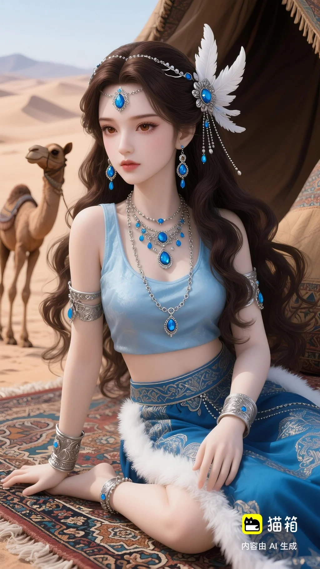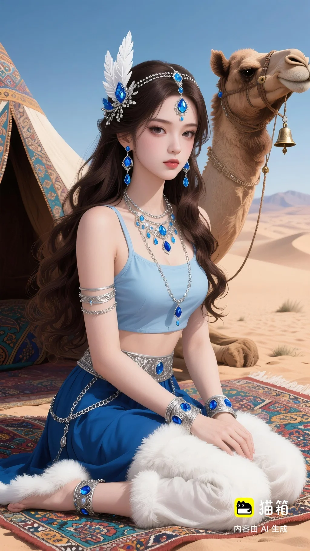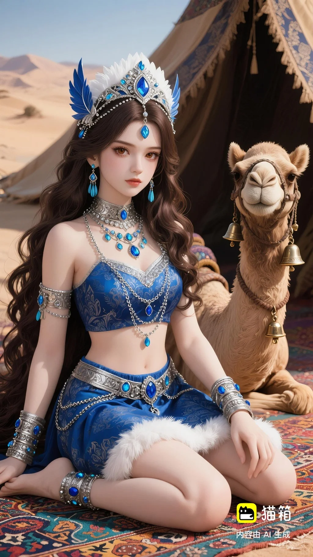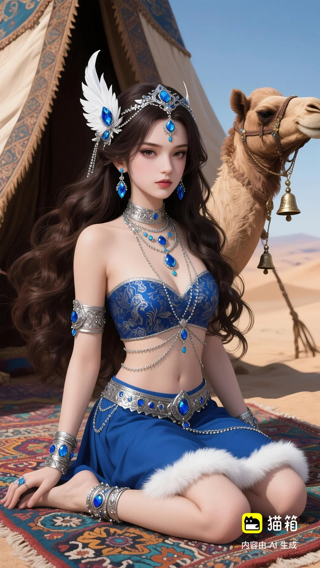 背景:沙漠营帐背景,营帐系着铃铛,她坐在一块色彩斑斓的地毯上(地毯上有复杂的花纹和图案),旁边有只高大的骆驼