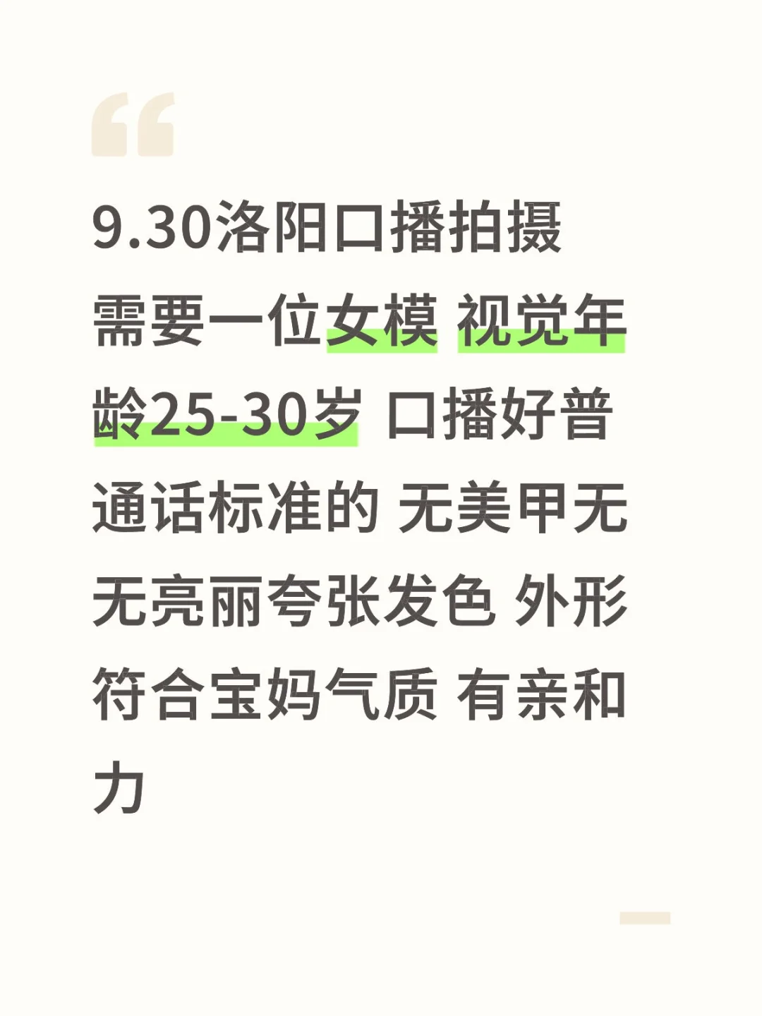 9.30洛阳口播拍摄\n需要一位女模 视觉年龄25-30岁 口播好普通话标准的 无美甲无无亮丽夸张发色 外形符合宝妈气质 有亲和力
