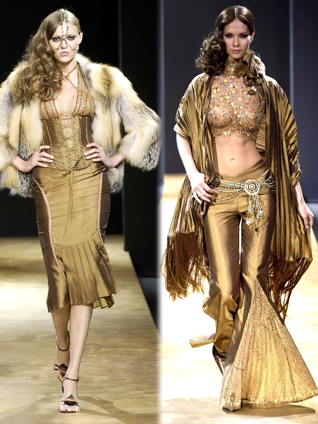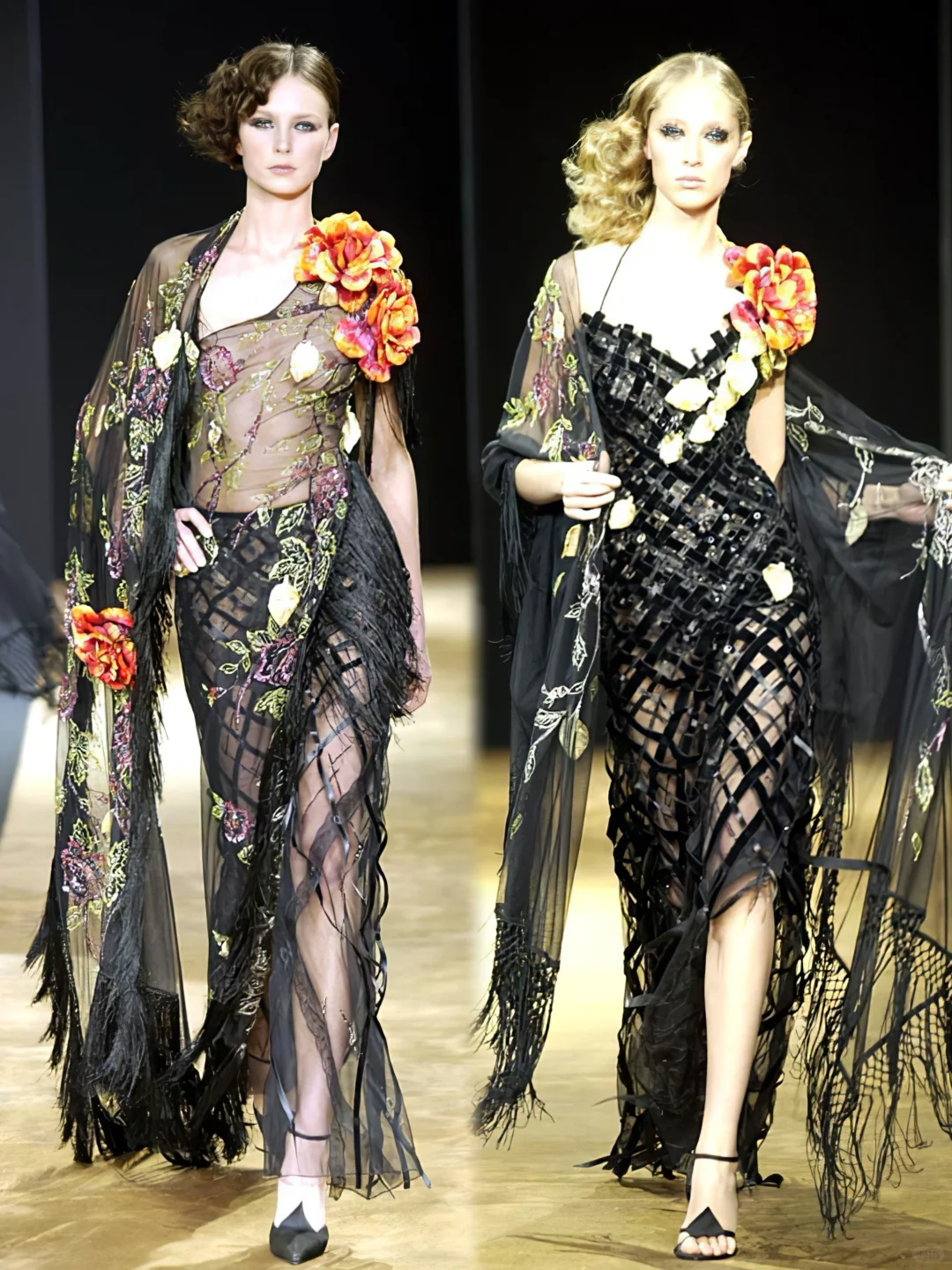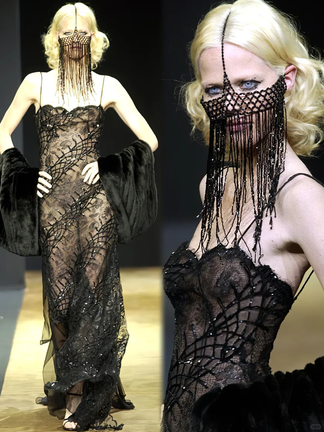 这场秀令人印象深刻的,不是剪裁,而是珠饰与刺绣。\nMurad减少了以往对多色面料的依赖,\n转而将焦点放在装饰性之上——\n细腻的蕾丝、轻盈的雪纺与光泽的香登丝\n交织出一条充满奢华与戏剧性的秋冬高定线。\n \n每一件衣服都像一颗雕琢精致的宝石:\n在灯光下闪烁的,不只是布料的光泽,\n更是Murad对“手工艺术”信仰的延伸。\n \n⚠️他常使用丝缎、欧根纱、薄纱、蕾丝、亮片、珠绣等轻盈而装饰性强的面料;即便在秋冬系列中,也较少采用动物皮草或真皮,而是通过刺绣与金线织物实现奢华感。在2002秋冬高级定制系列中有类似动物皮草的披肩装饰,从细节上看起来又像是人工皮草,目前没有详细的资料显示它的具体材质,但是在近年来,Murad已经公开表示过他使用了人工合成皮草作为披肩、包装或者大衣的一部分,说明他似乎在迈向更加环保、动物友善的方向,只是目前他还没有形成公开的全线适用“禁止动物皮草”的承诺。\n#寻找秀场上的美 #秀场回顾 #vintage